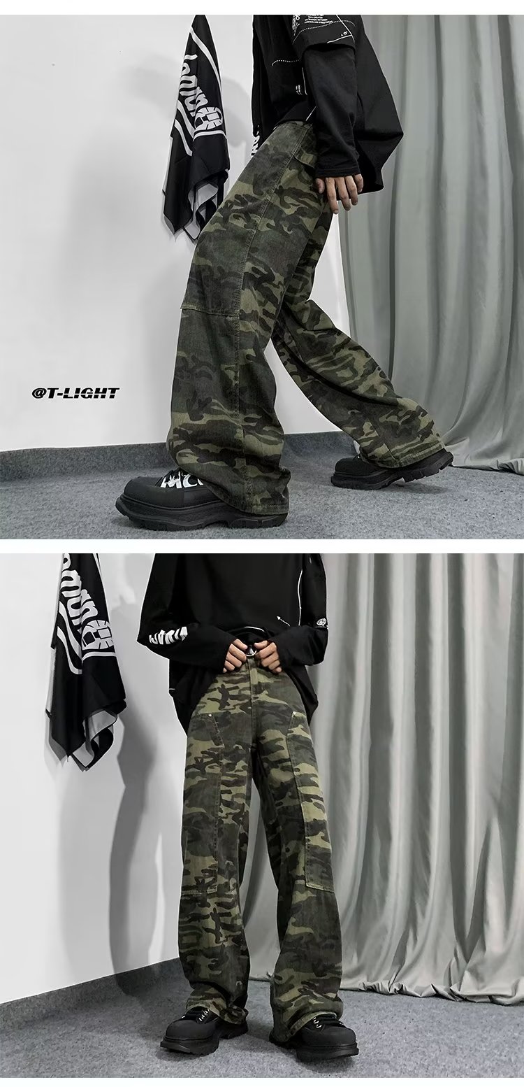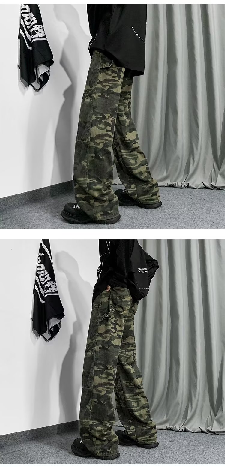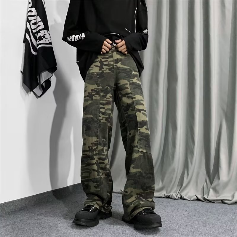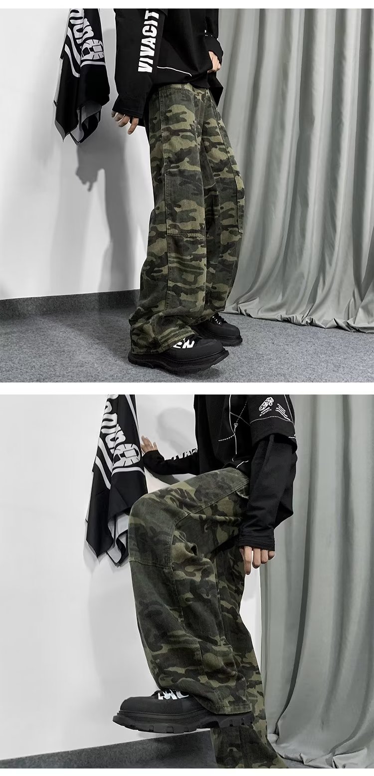 歐美hiphop褲子男款美式復古拼接迷彩工裝褲高街vibe風潮牌直筒褲