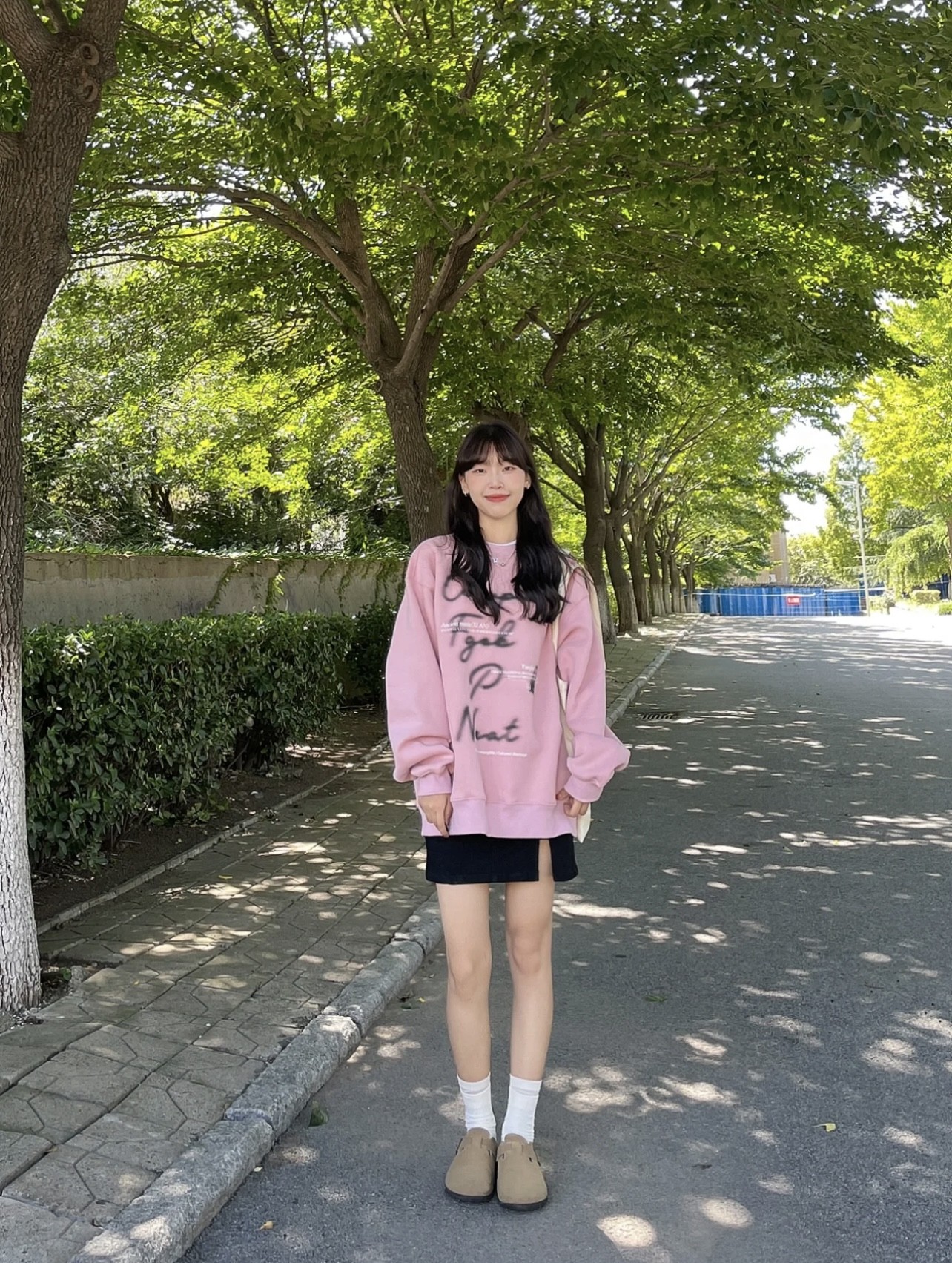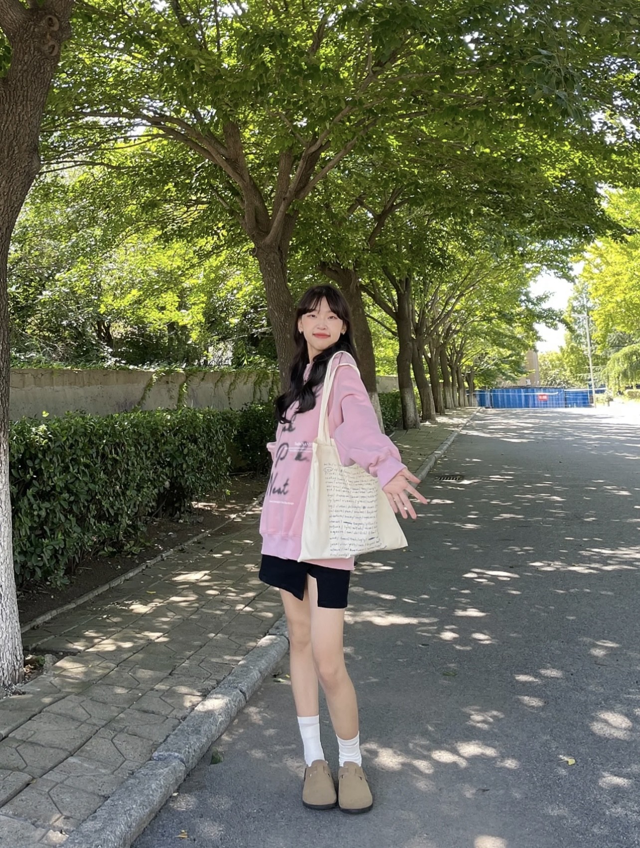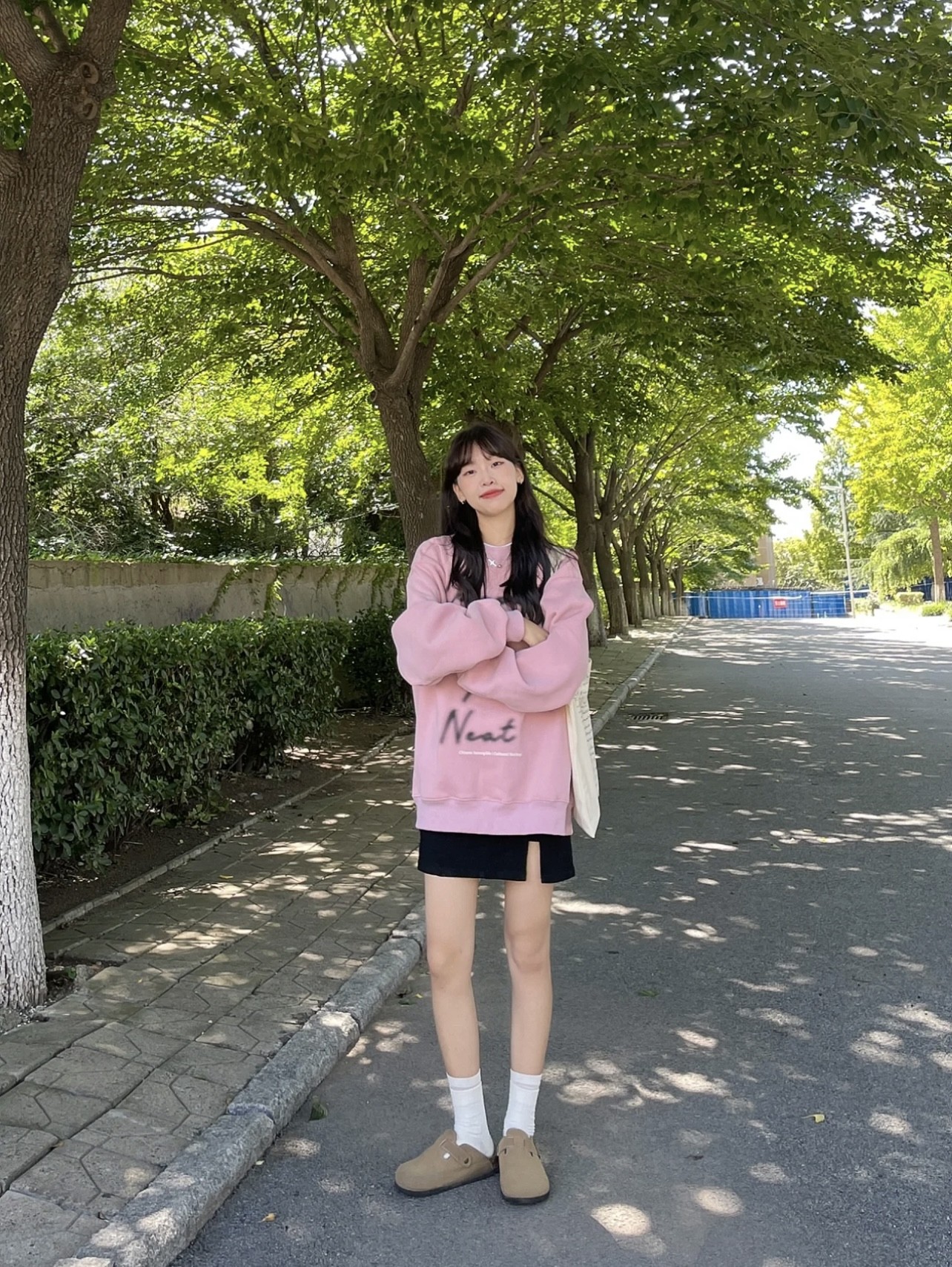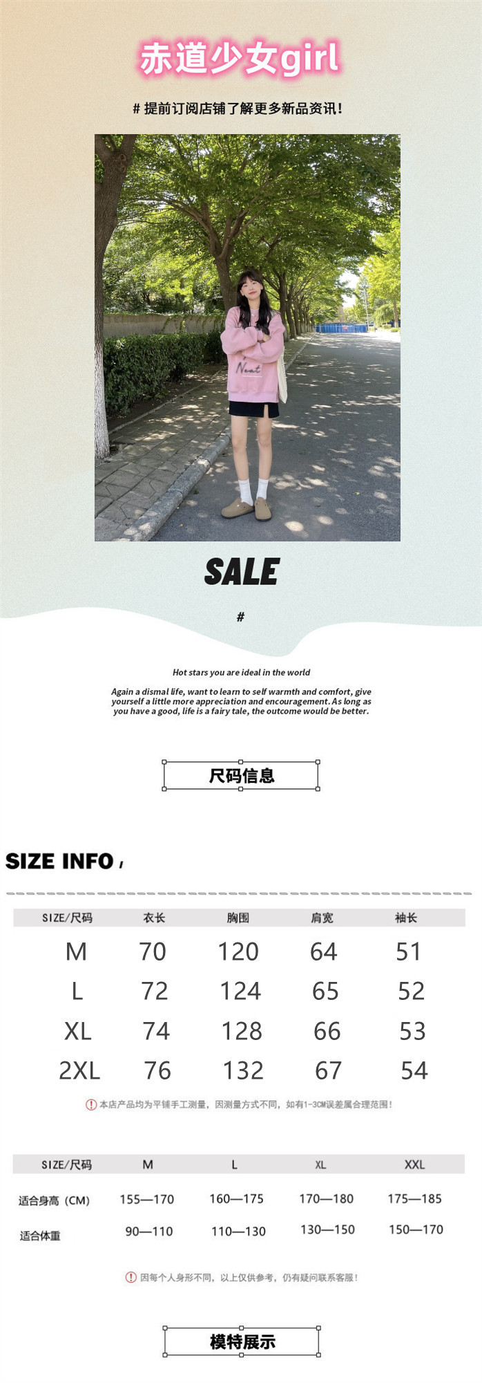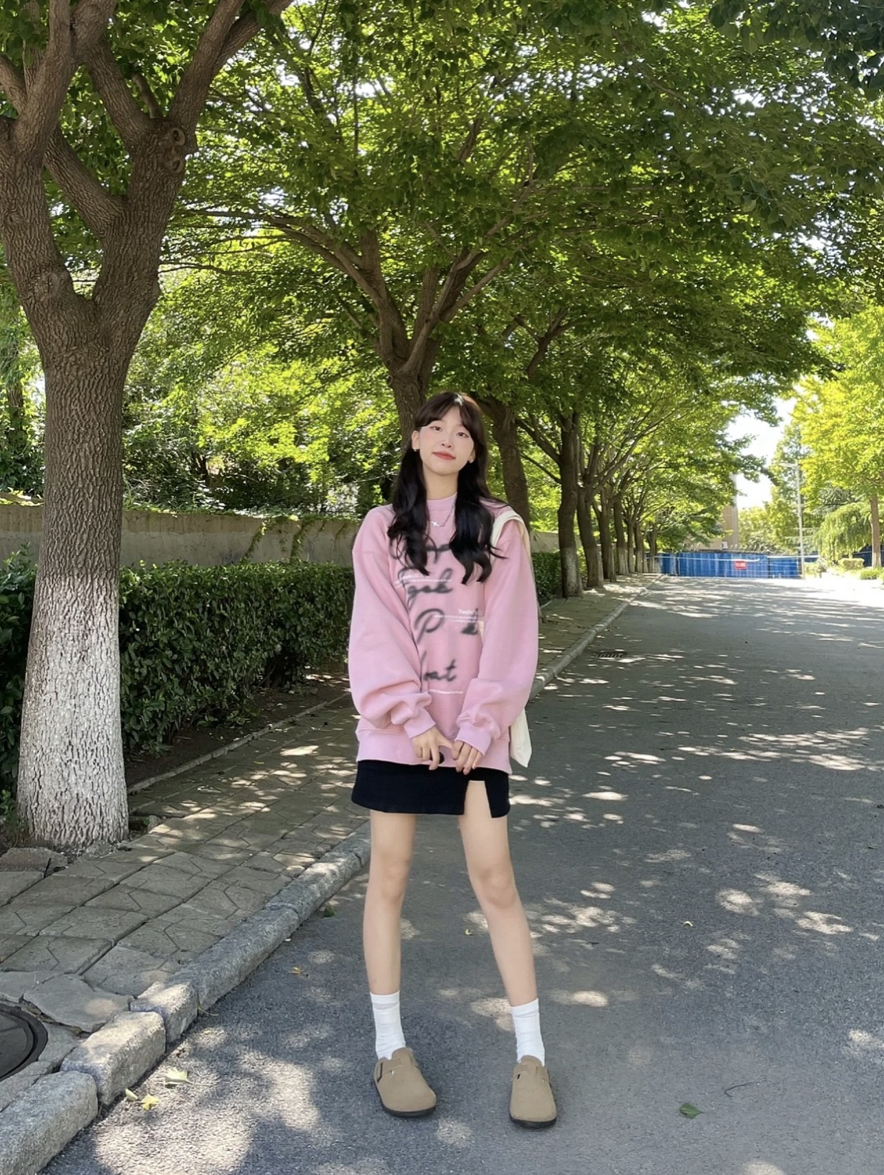 韓國ins穿搭博主字母印花粉色圓領套頭厚棉T鬼馬少女寬鬆百搭上衣