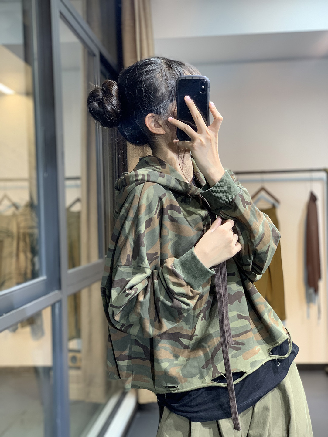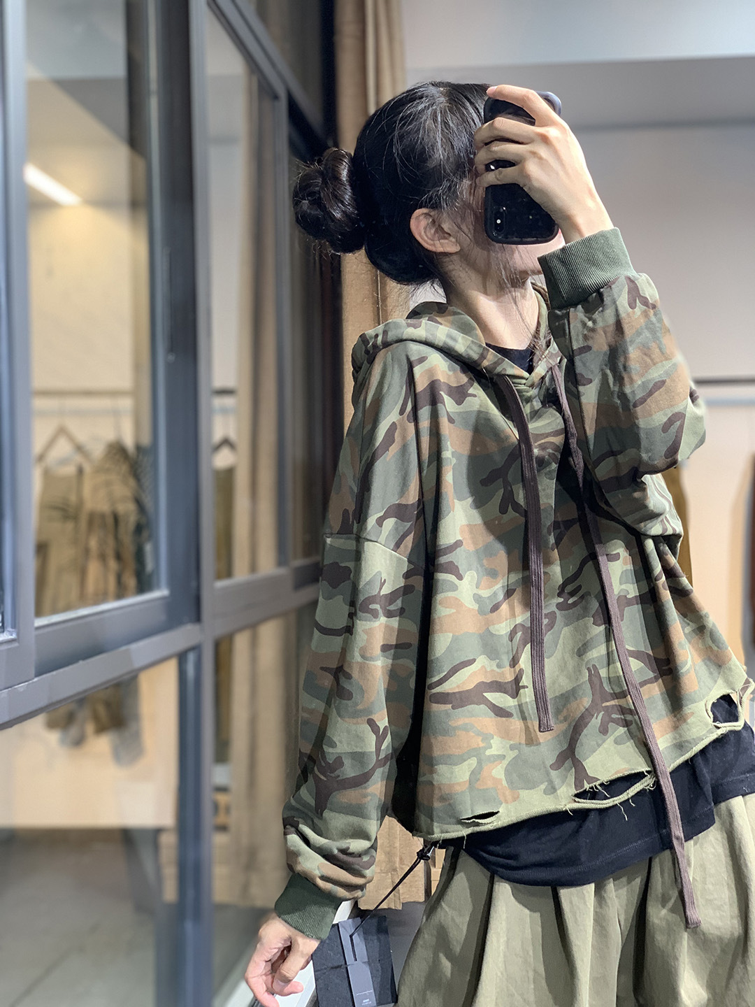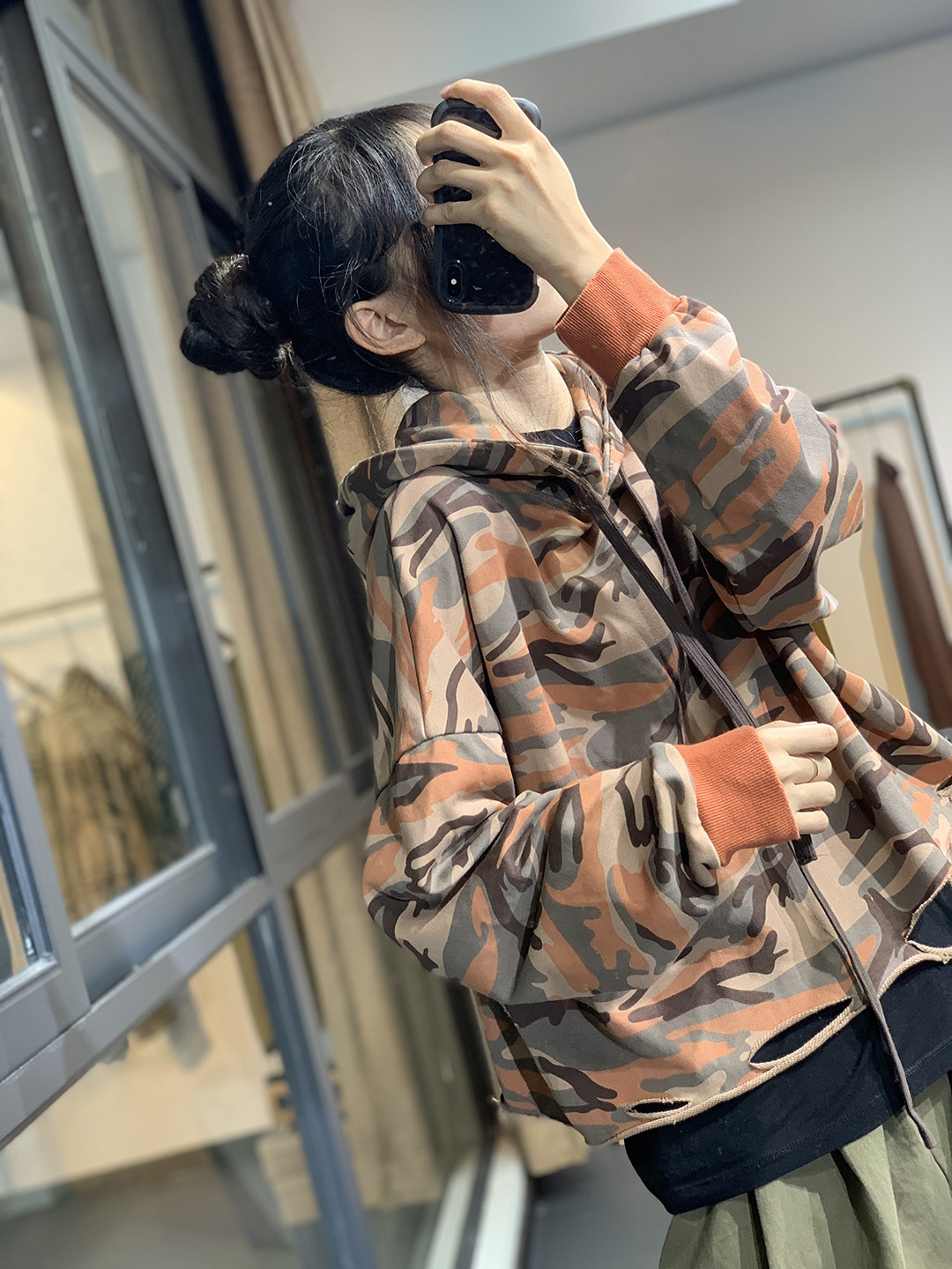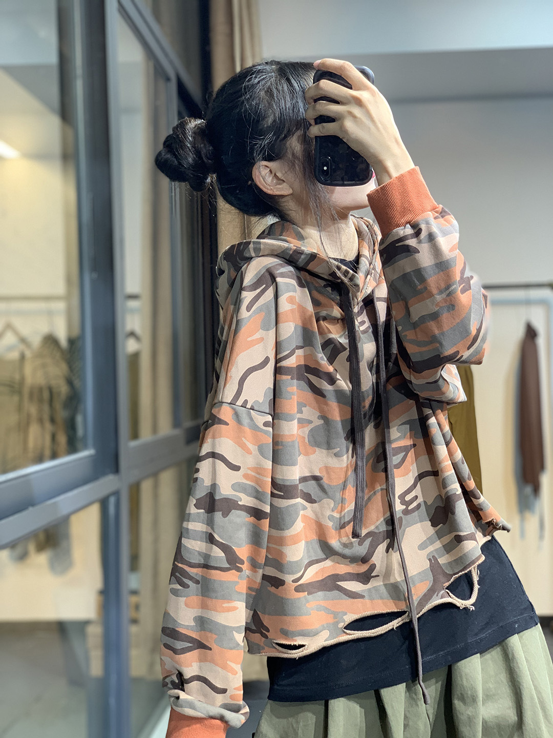 莫裏秋季原創韓版潮流文藝個性破洞寬鬆休閒減齡百搭連帽迷彩衛衣