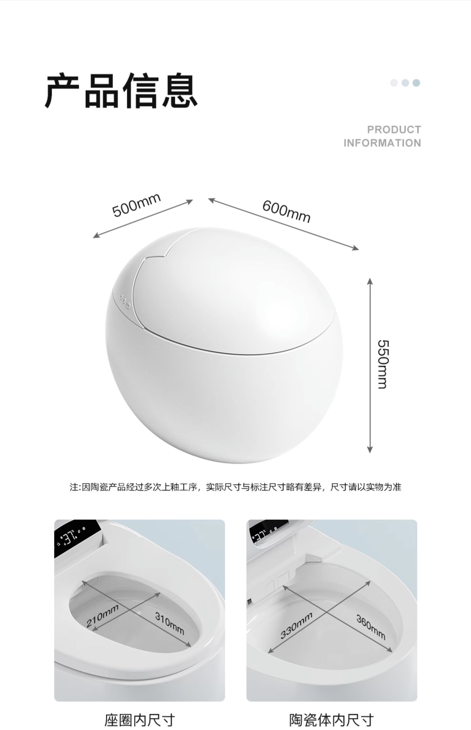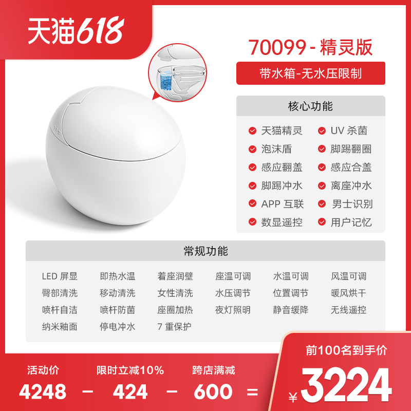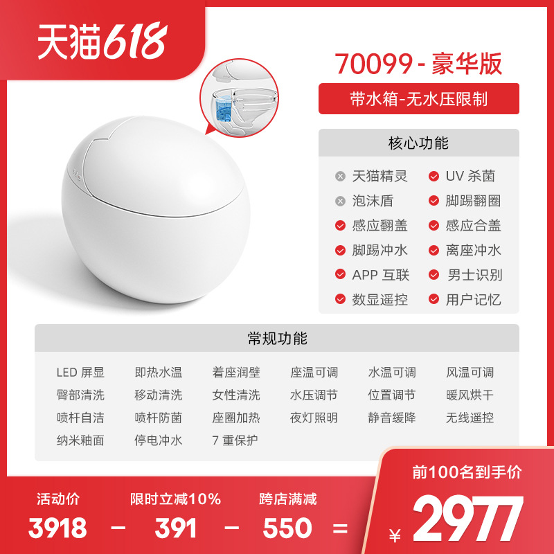 3TBW超短60cm小户型智能马桶无水压限制鸡蛋形全自动坐便器70099