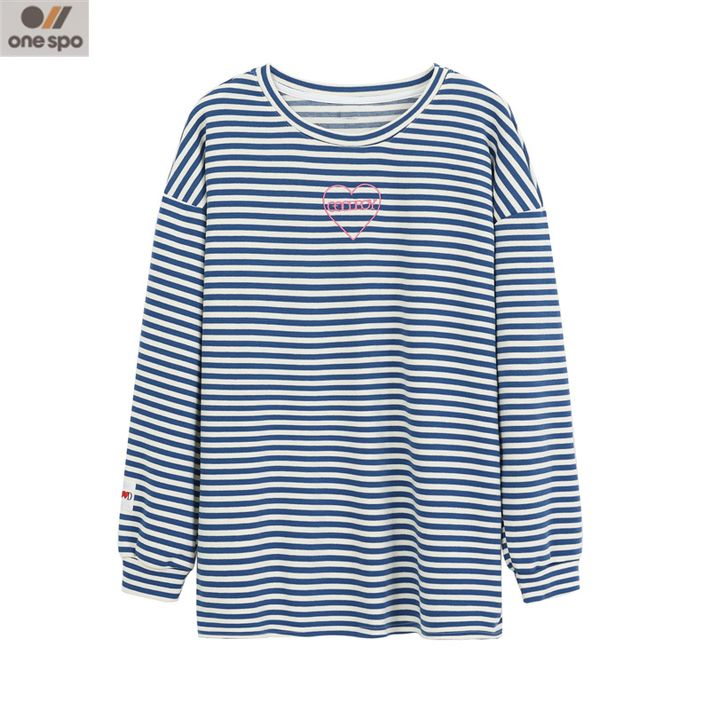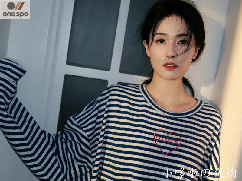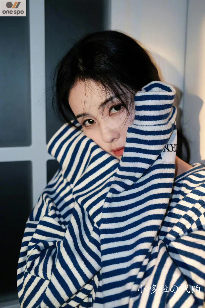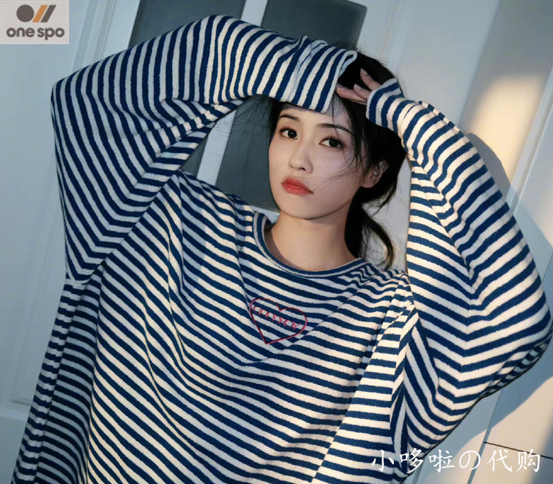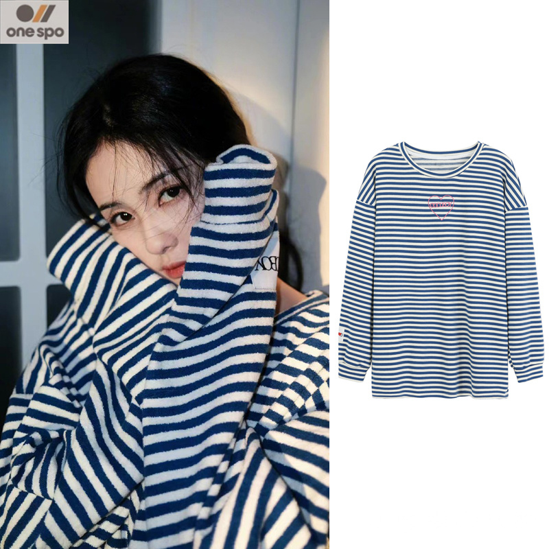 日本代購one spo明星白鹿同款衣服藍色條紋休閒上衣女oversize上衣潮
