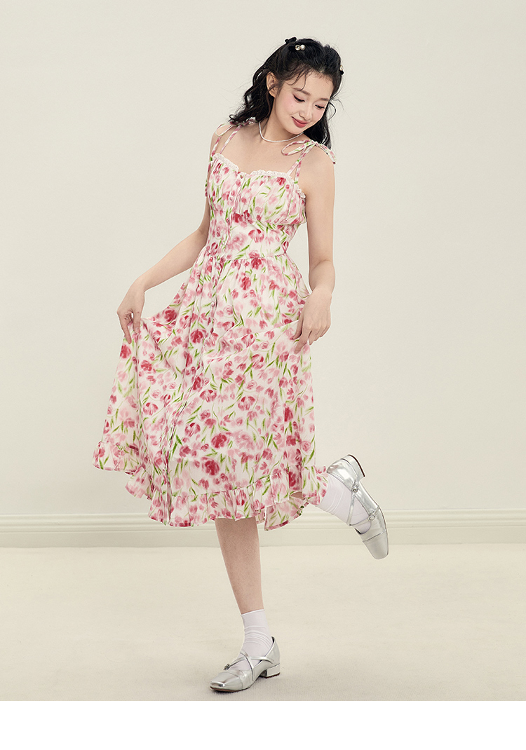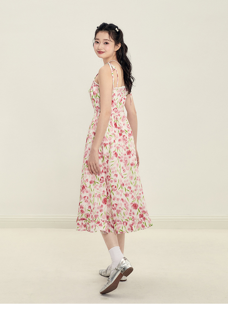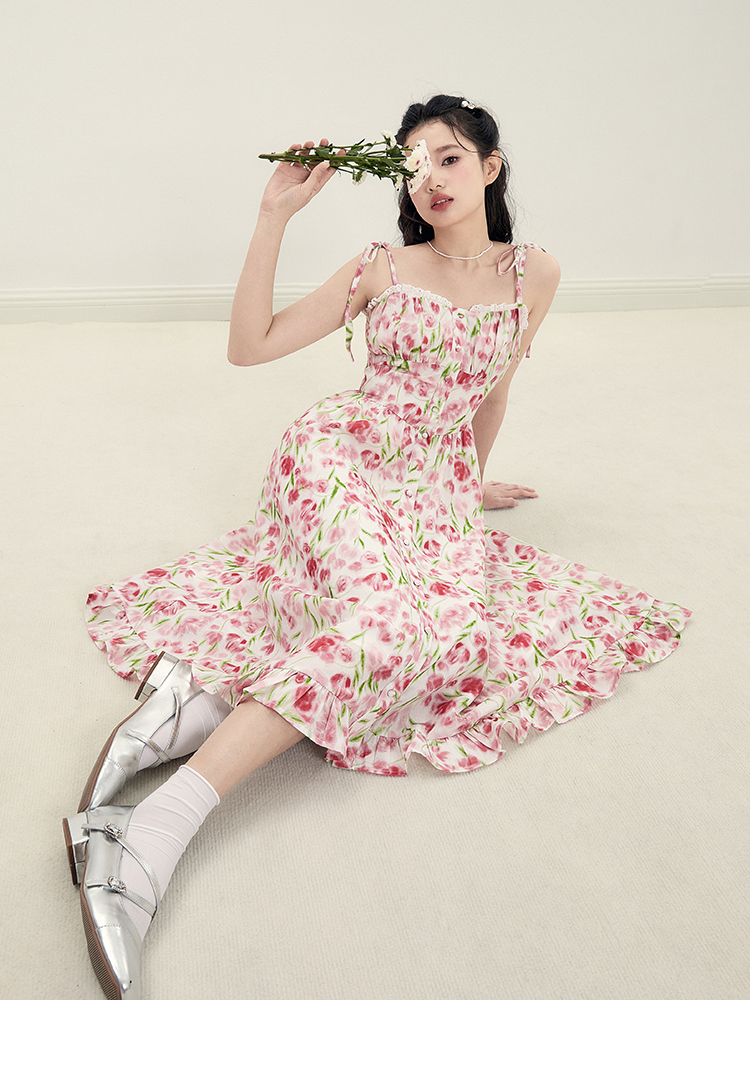 樂町甜茶玫瑰洋裝23年夏季新款女裝法式裙海邊度假風吊帶碎花裙