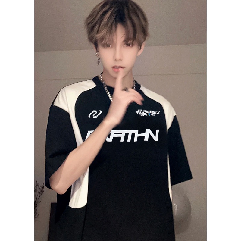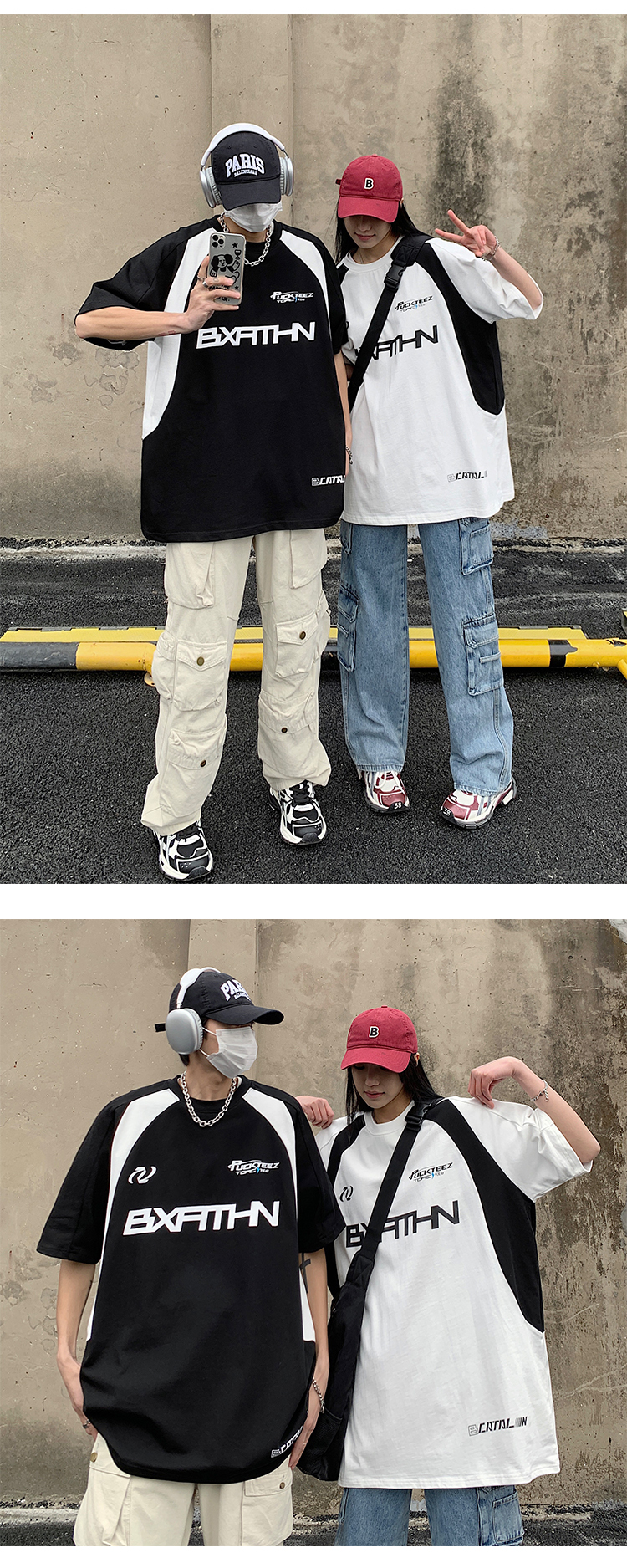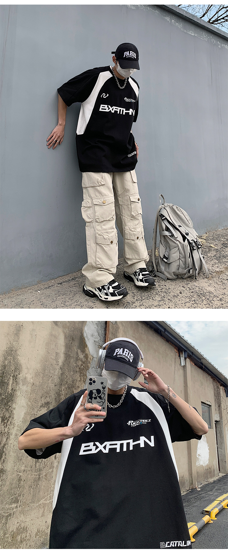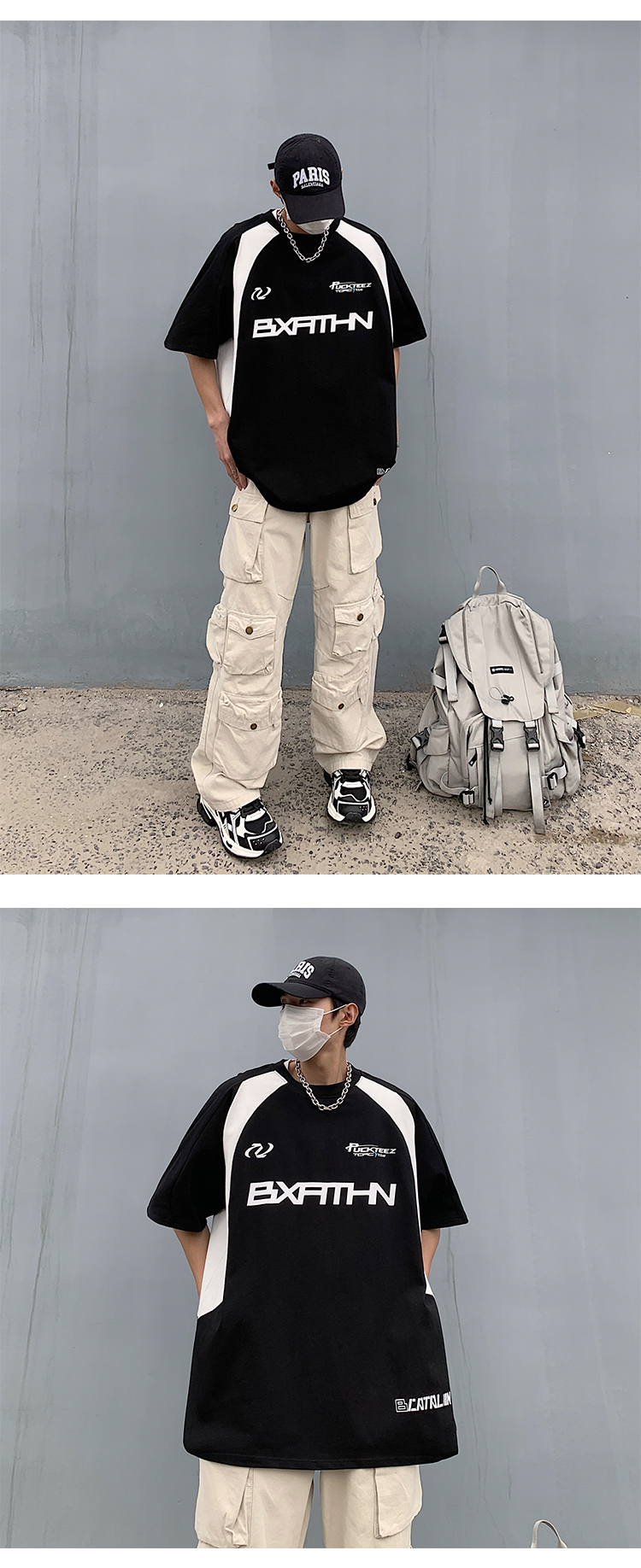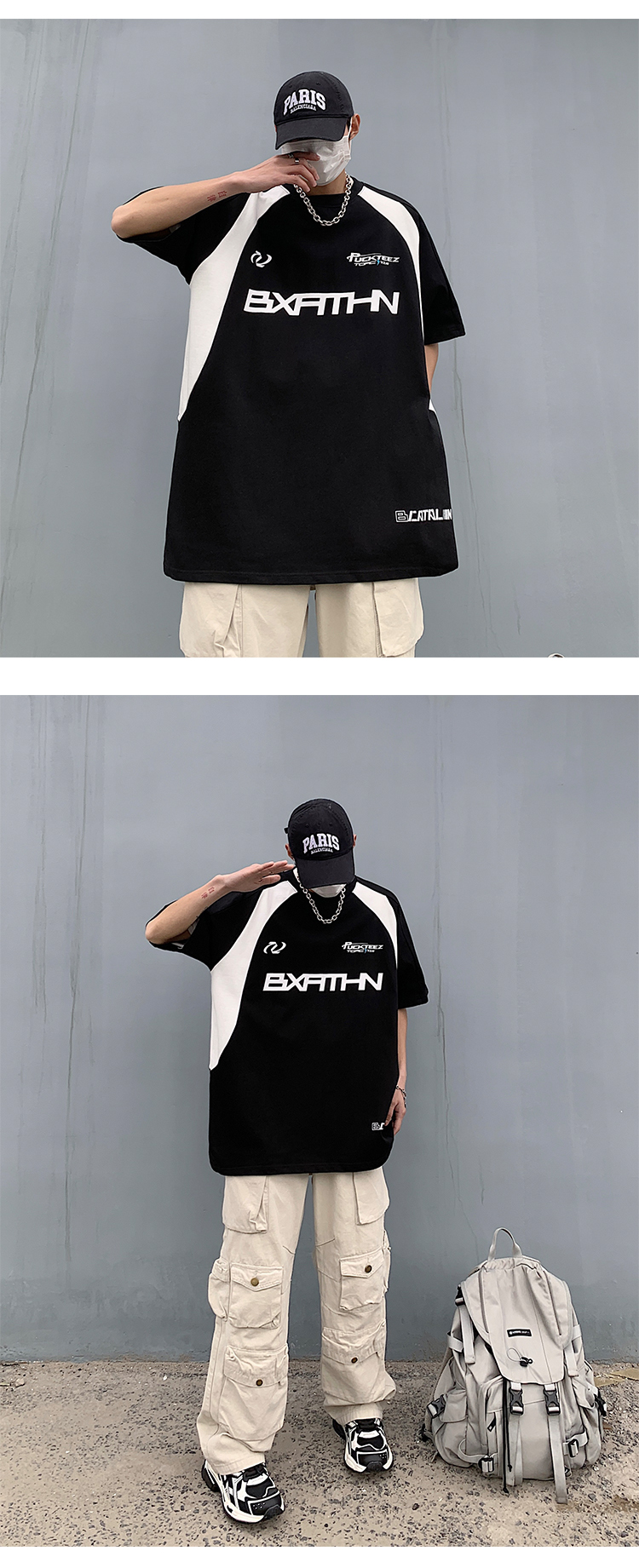 撞色拼接320g重磅T恤夏季潮牌高街半袖機車服短袖oversize七分袖
