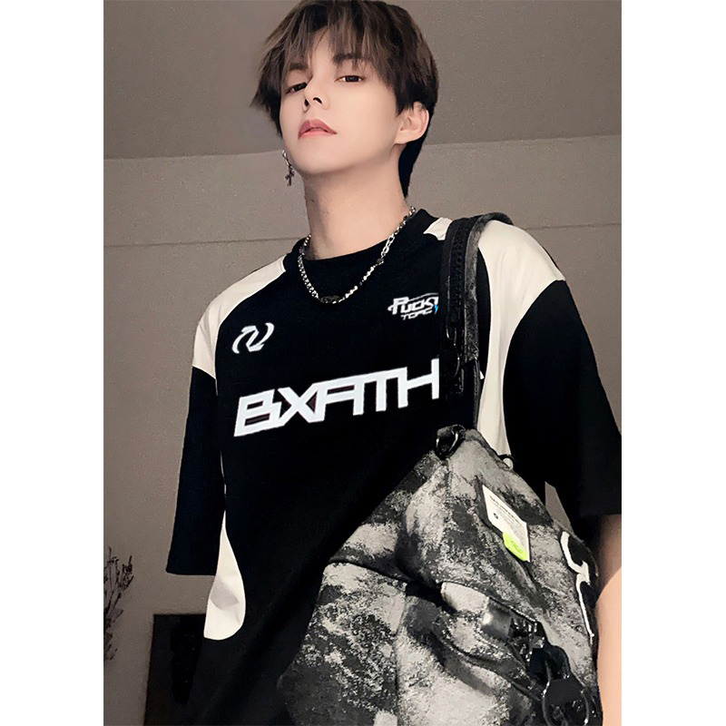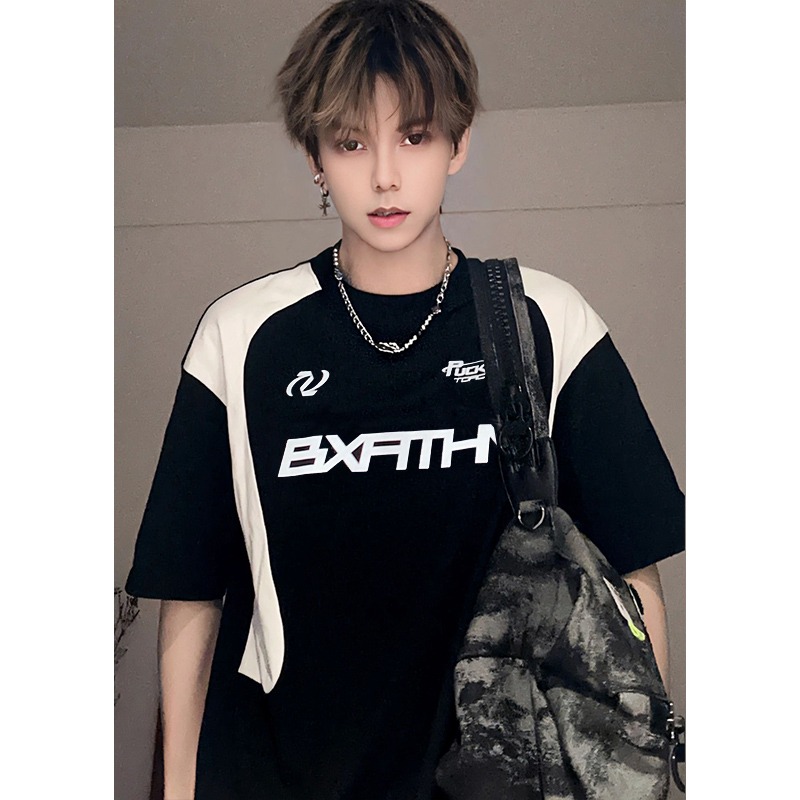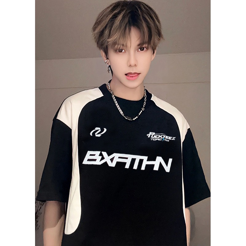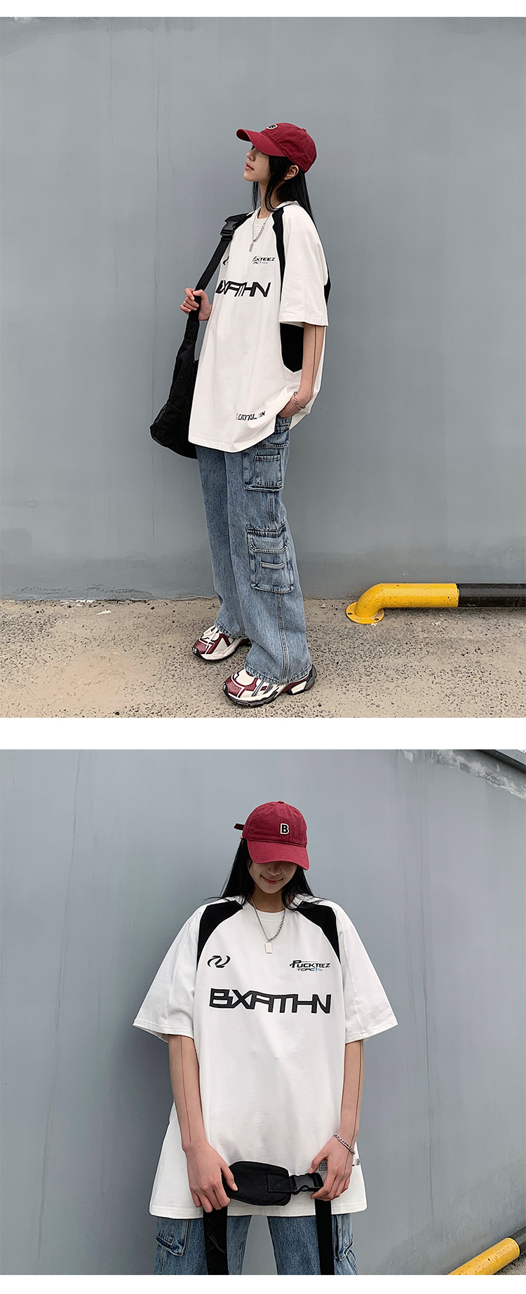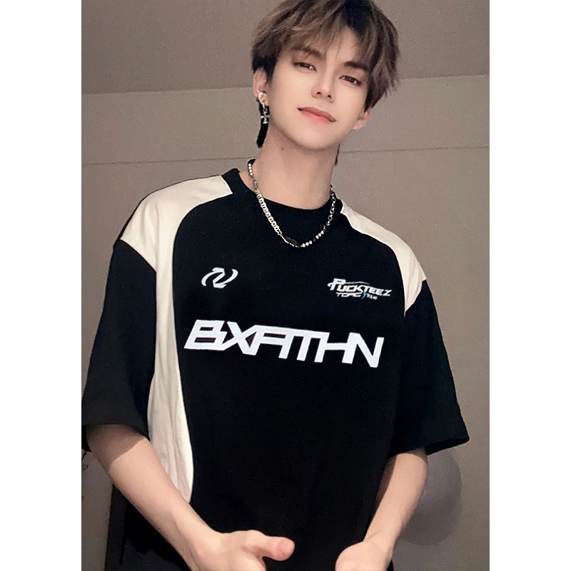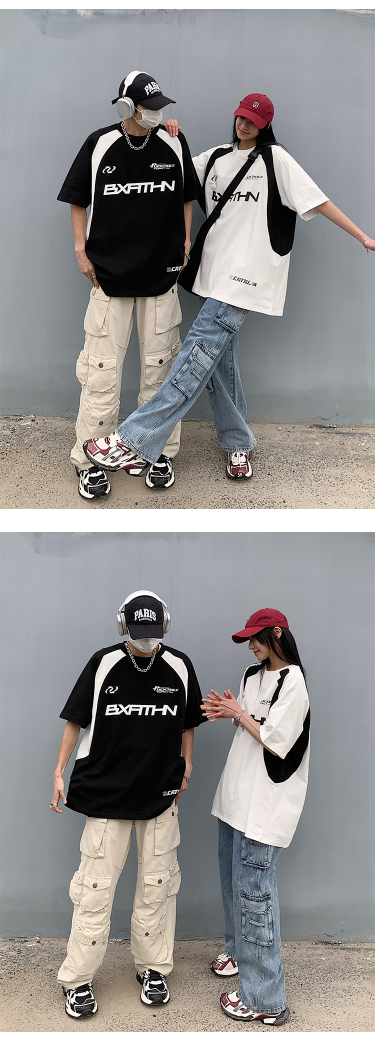 撞色拼接320g重磅T恤夏季潮牌高街半袖機車服短袖oversize七分袖
