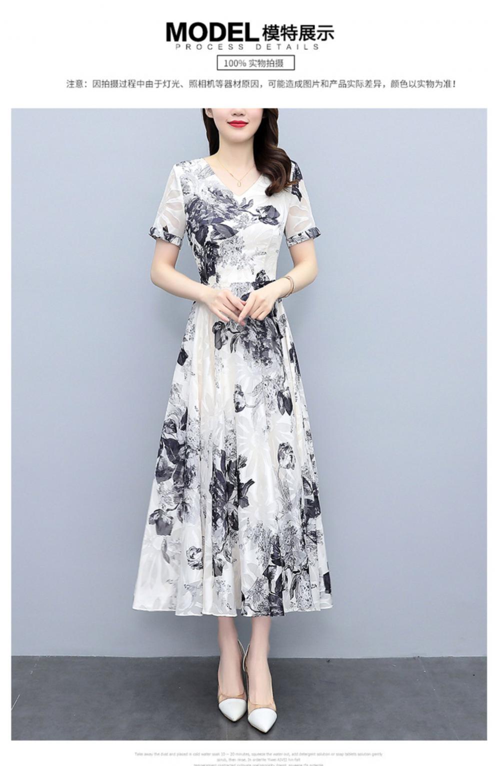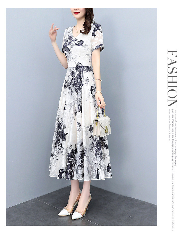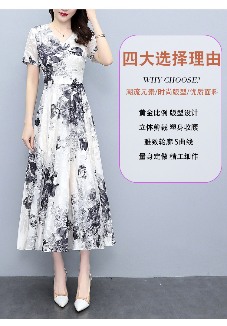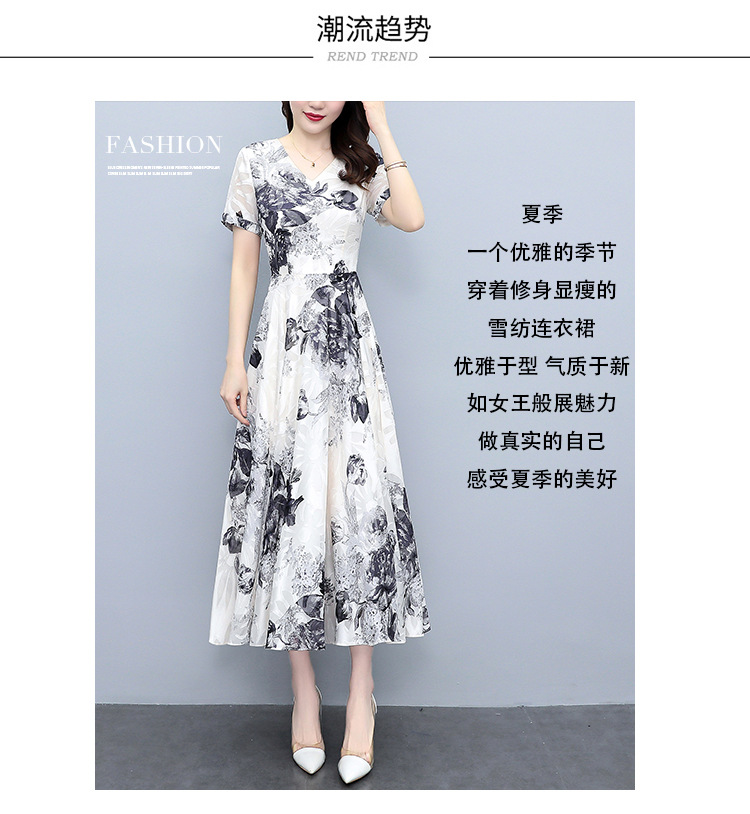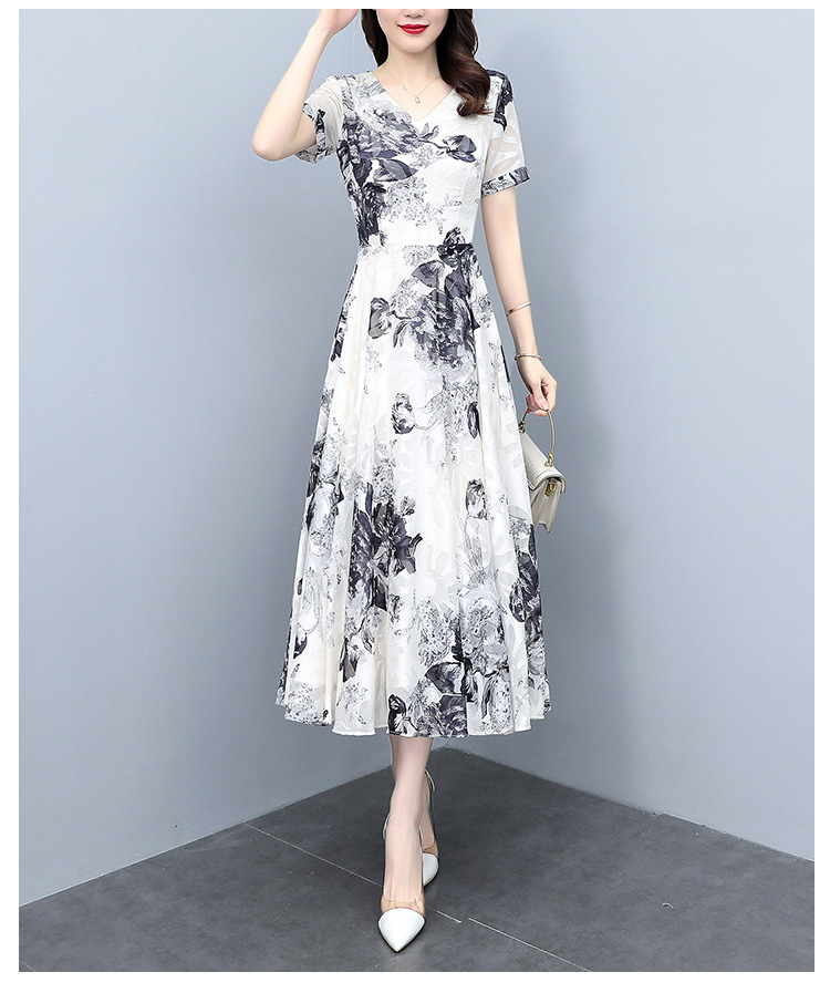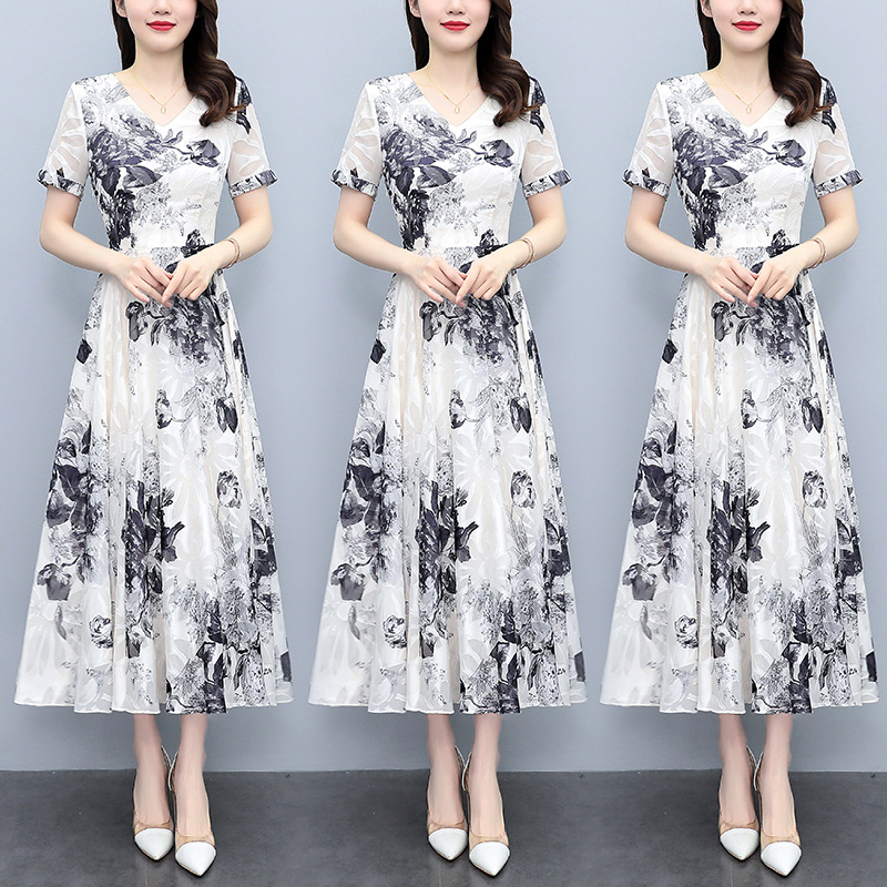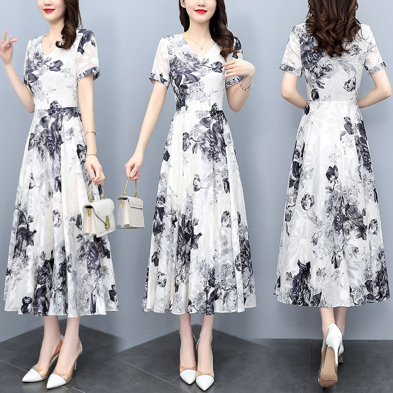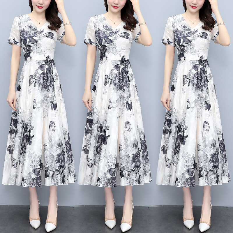 2023夏季新款剪花中国风水墨碎花连衣裙大码胖mm收腰显瘦遮肚长裙