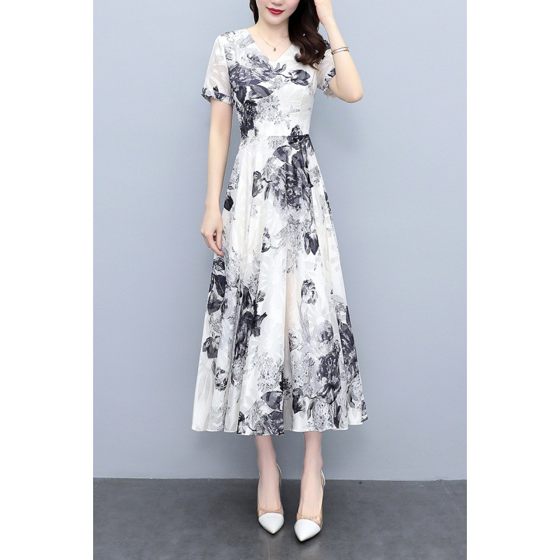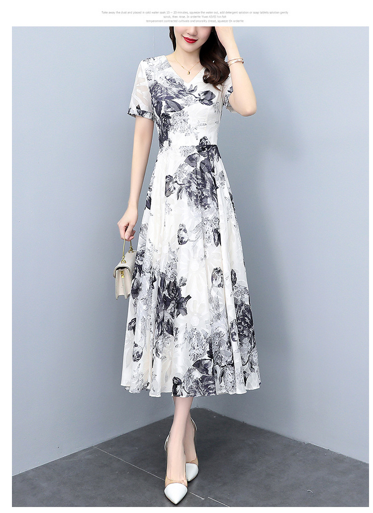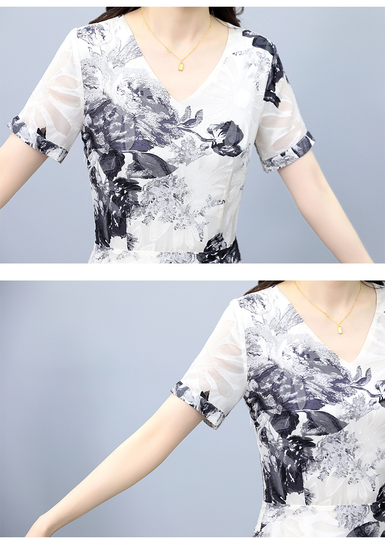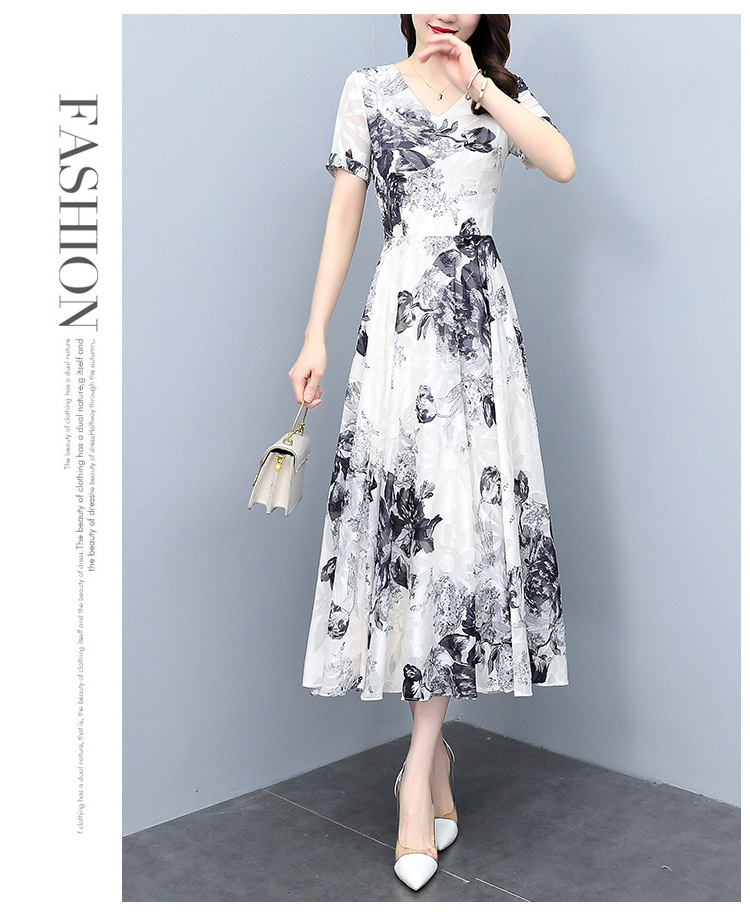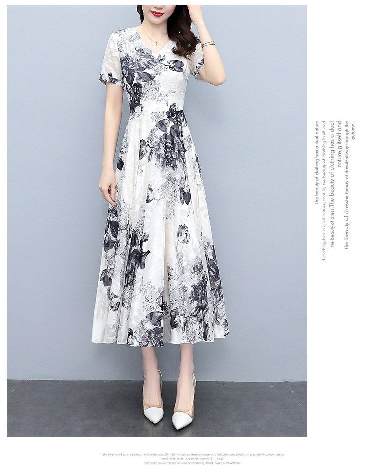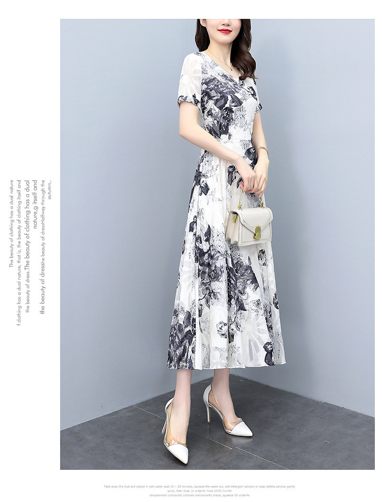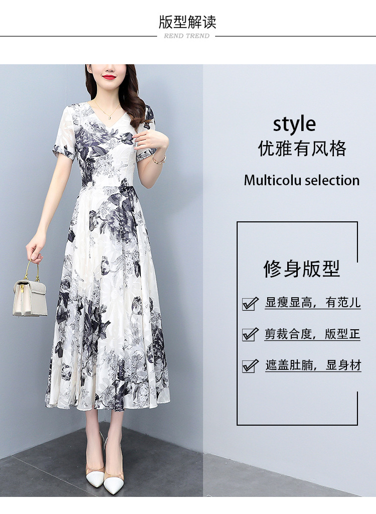 2023夏季新款剪花中国风水墨碎花连衣裙大码胖mm收腰显瘦遮肚长裙