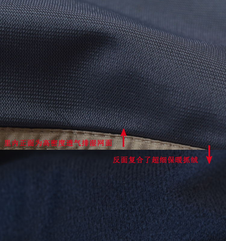 复合内胆(贴身一面是排汗透气网布光滑方便穿脱,反面复合了保暖抓绒)