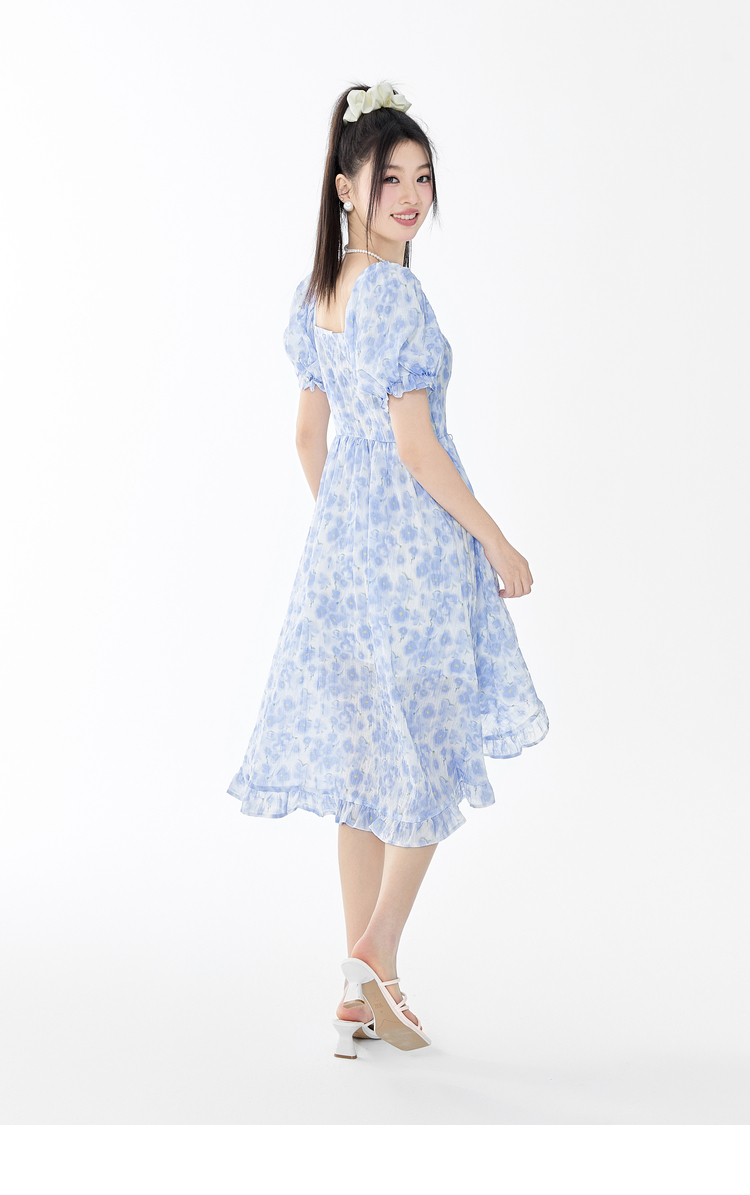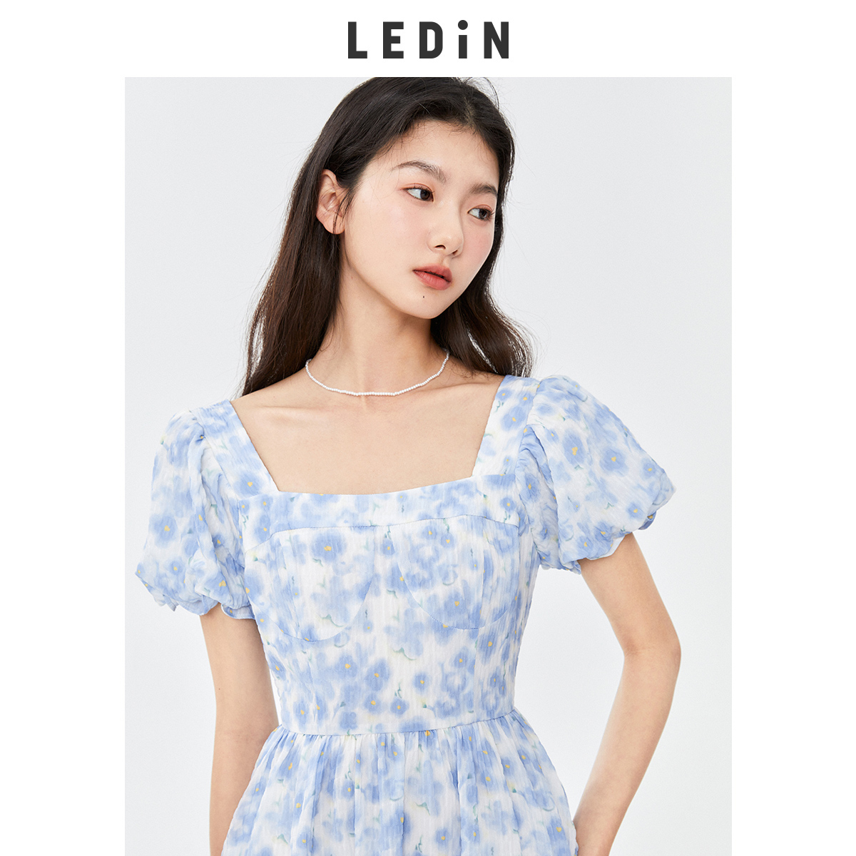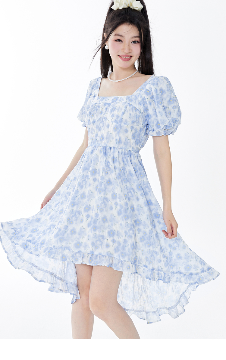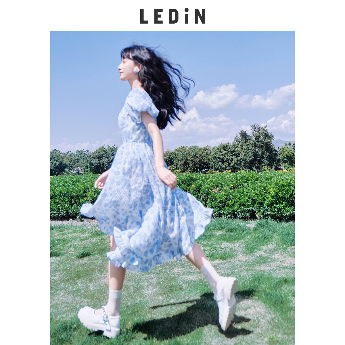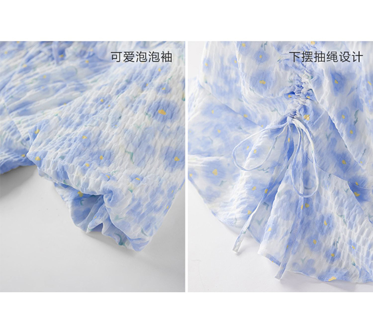 樂町海島來信洋裝2023夏季女裝初春雪紡法式長裙藍色碎花裙子