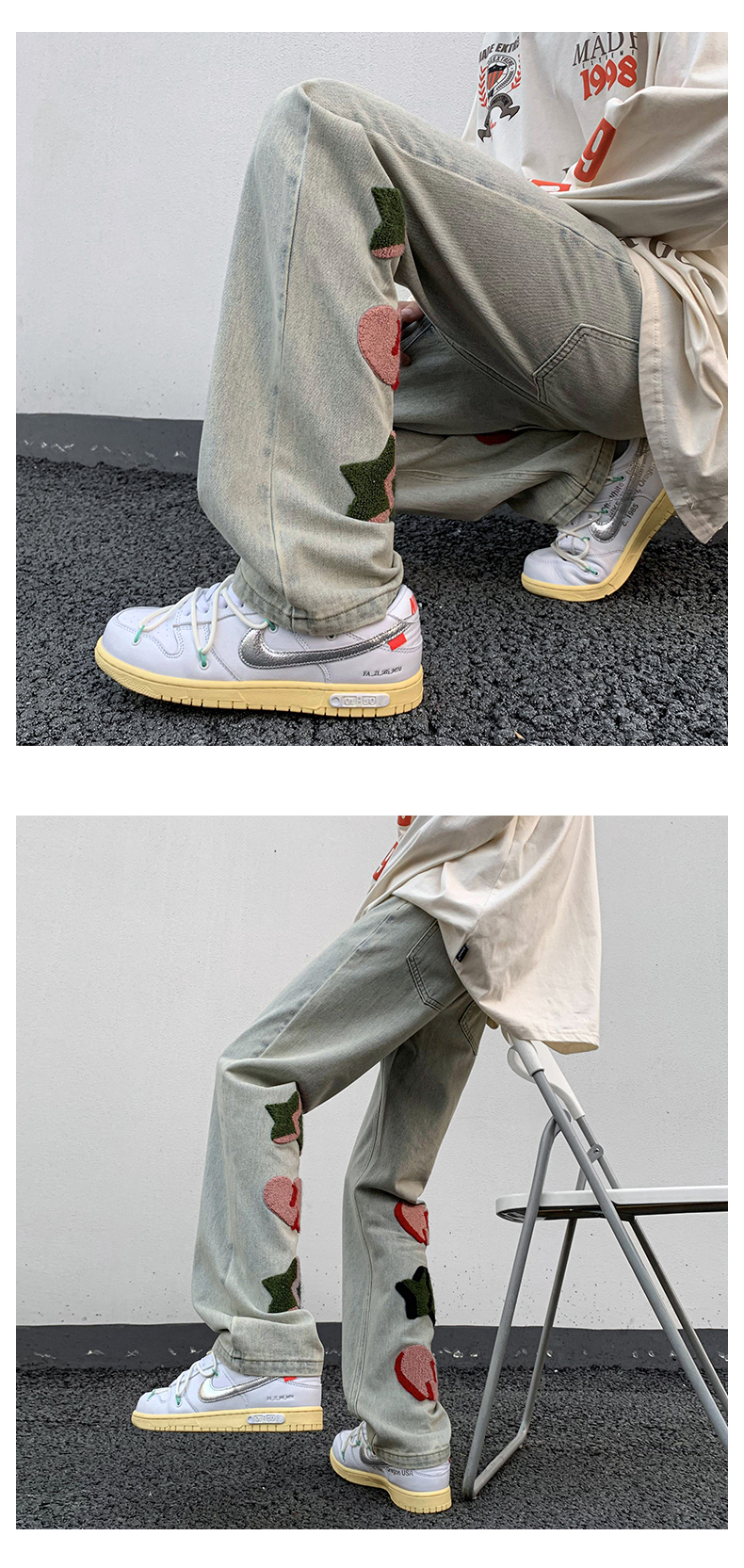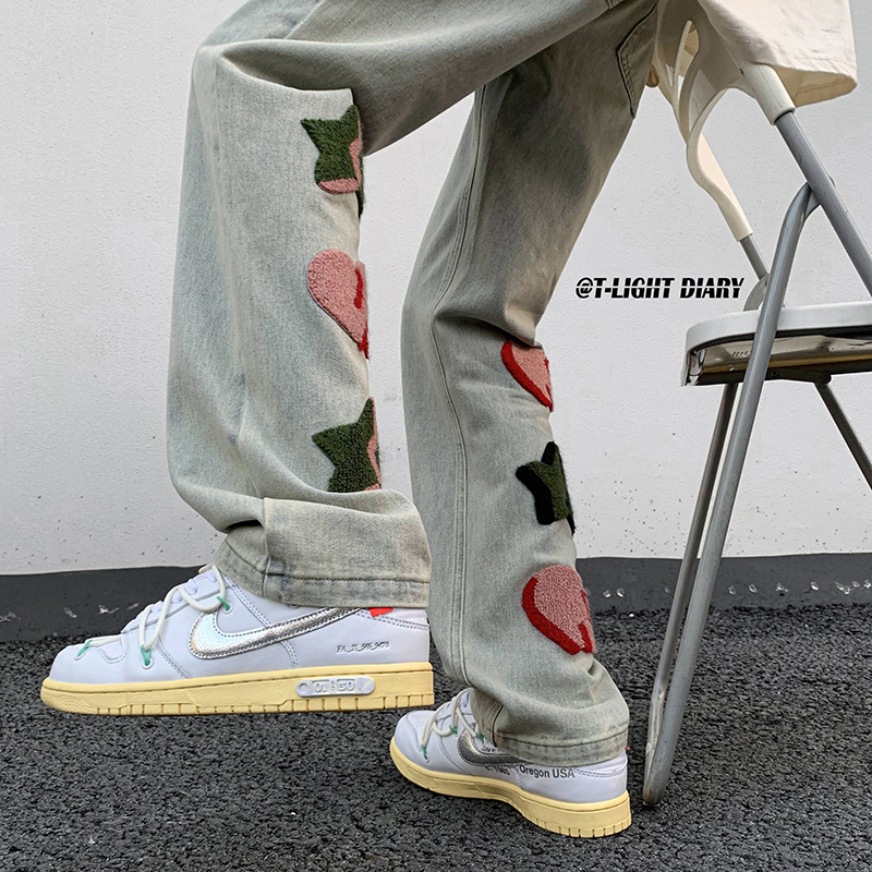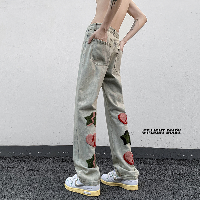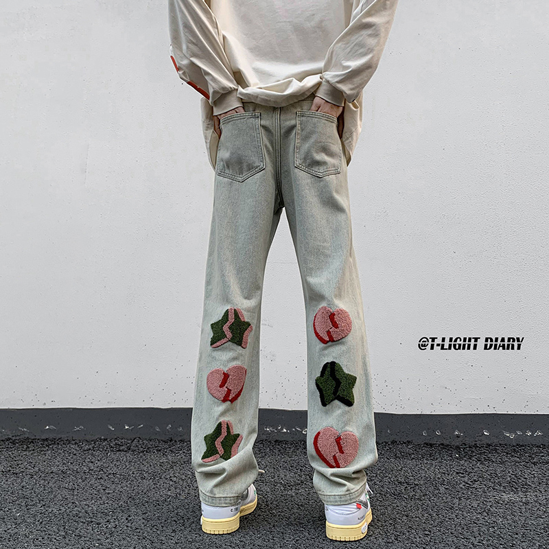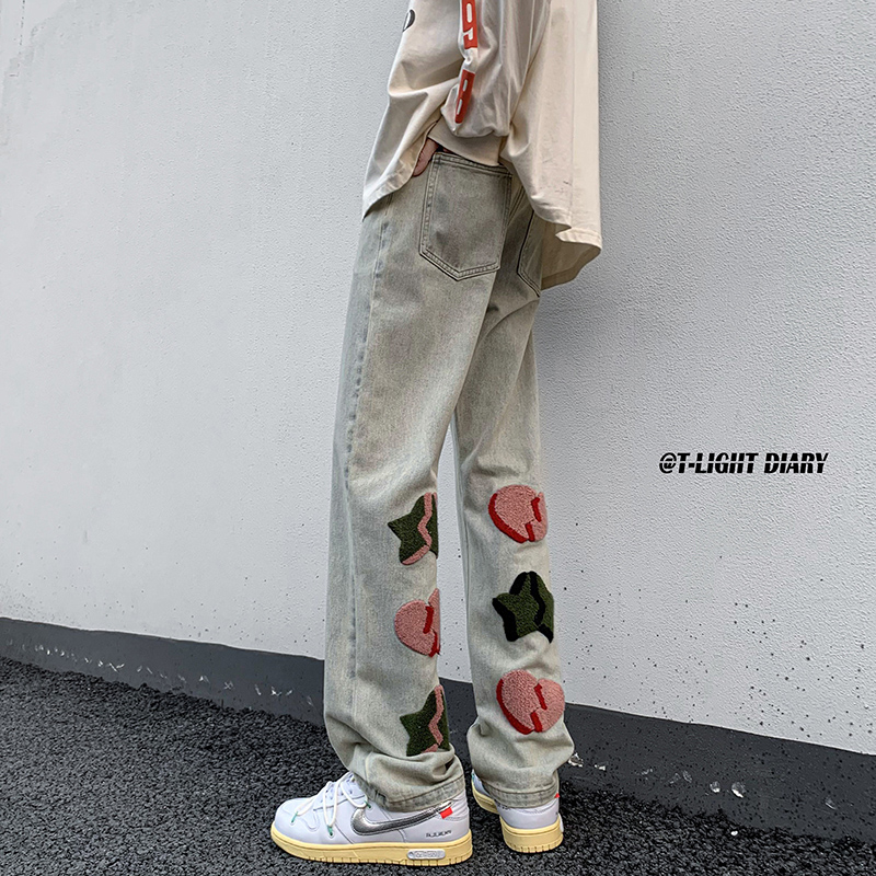 vibe歐美hiphop褲子高街ins潮男美式小眾情侶款毛巾繡直筒牛仔褲