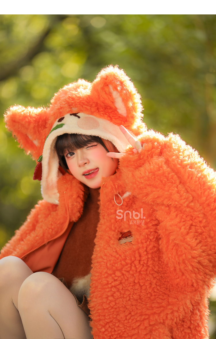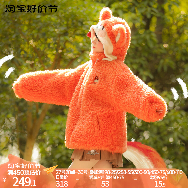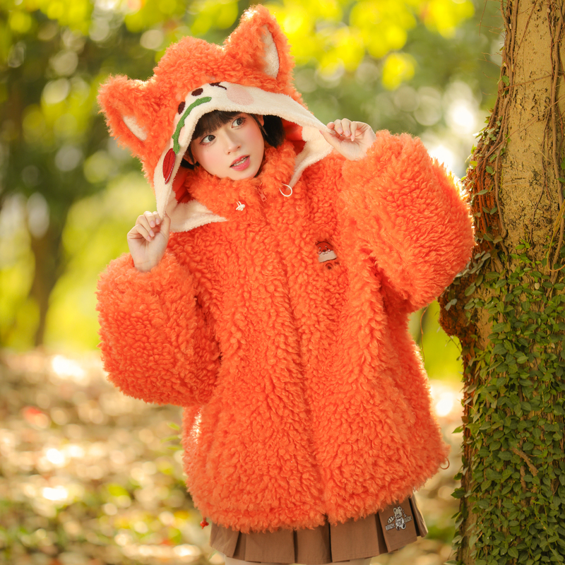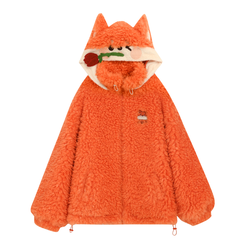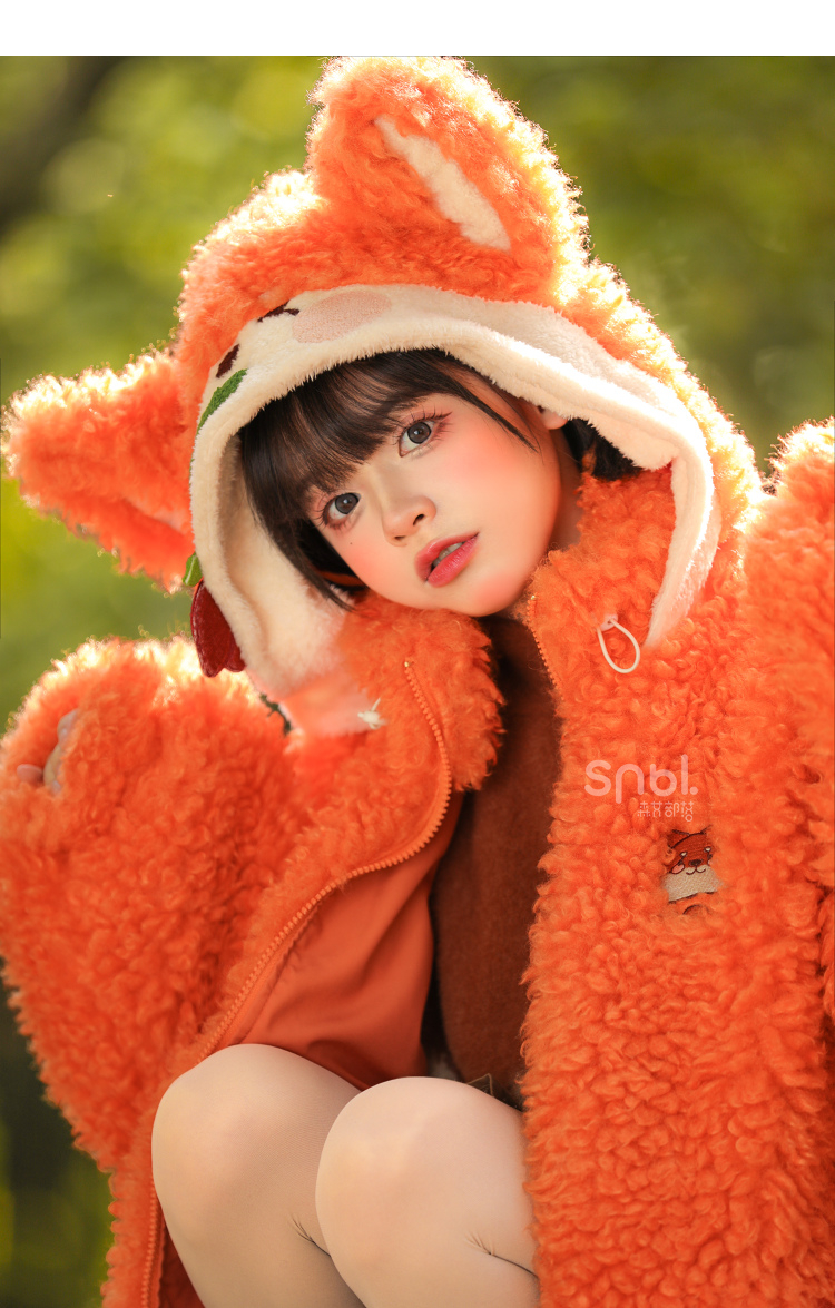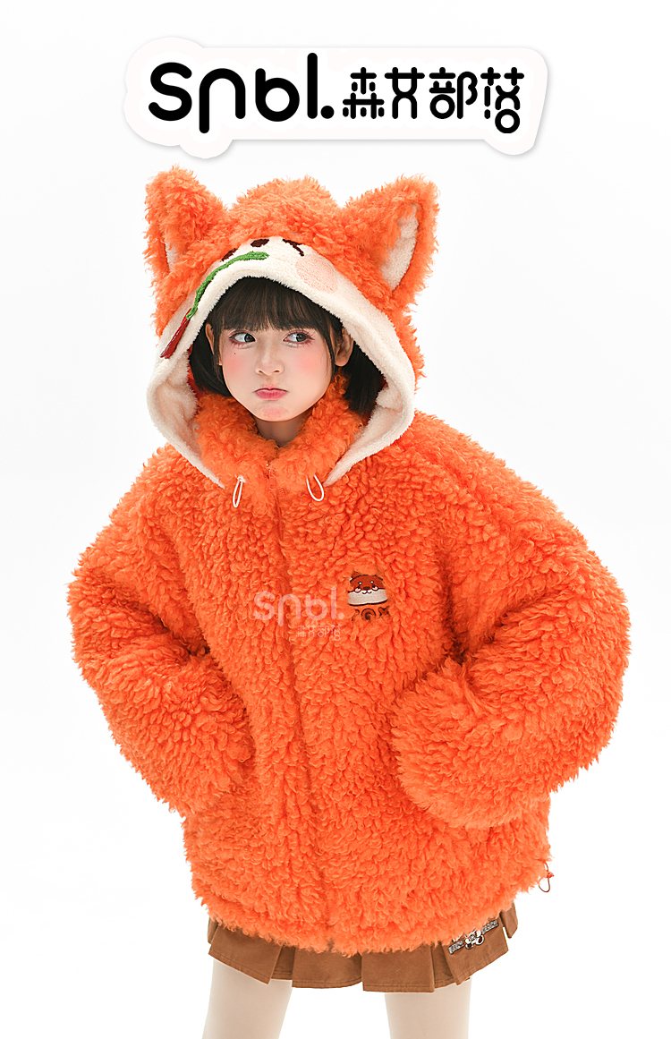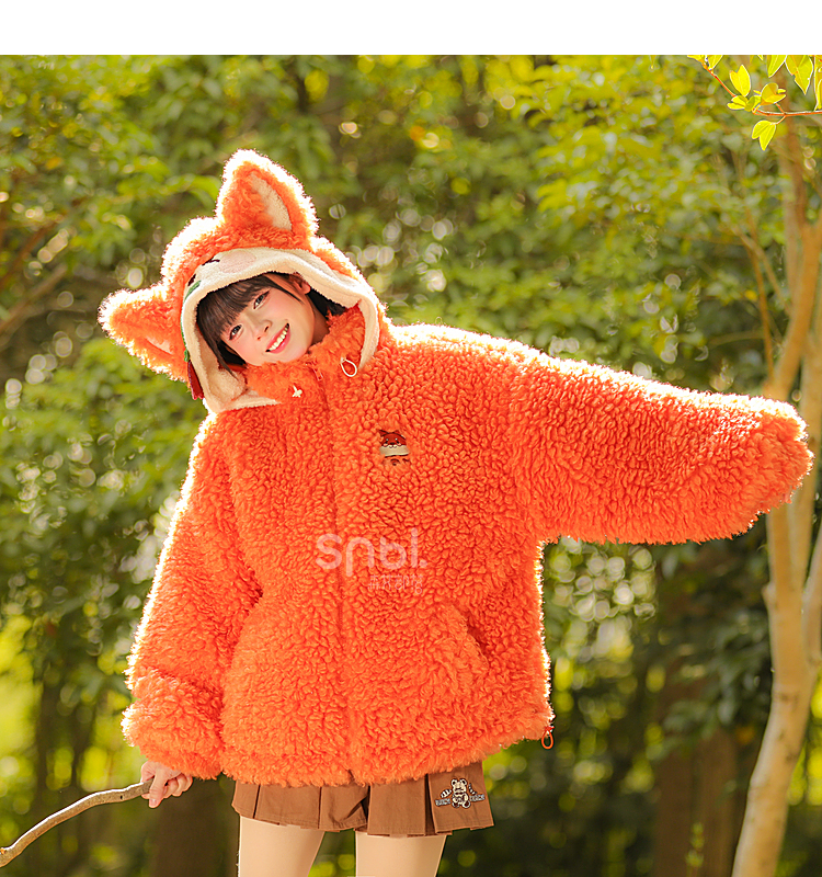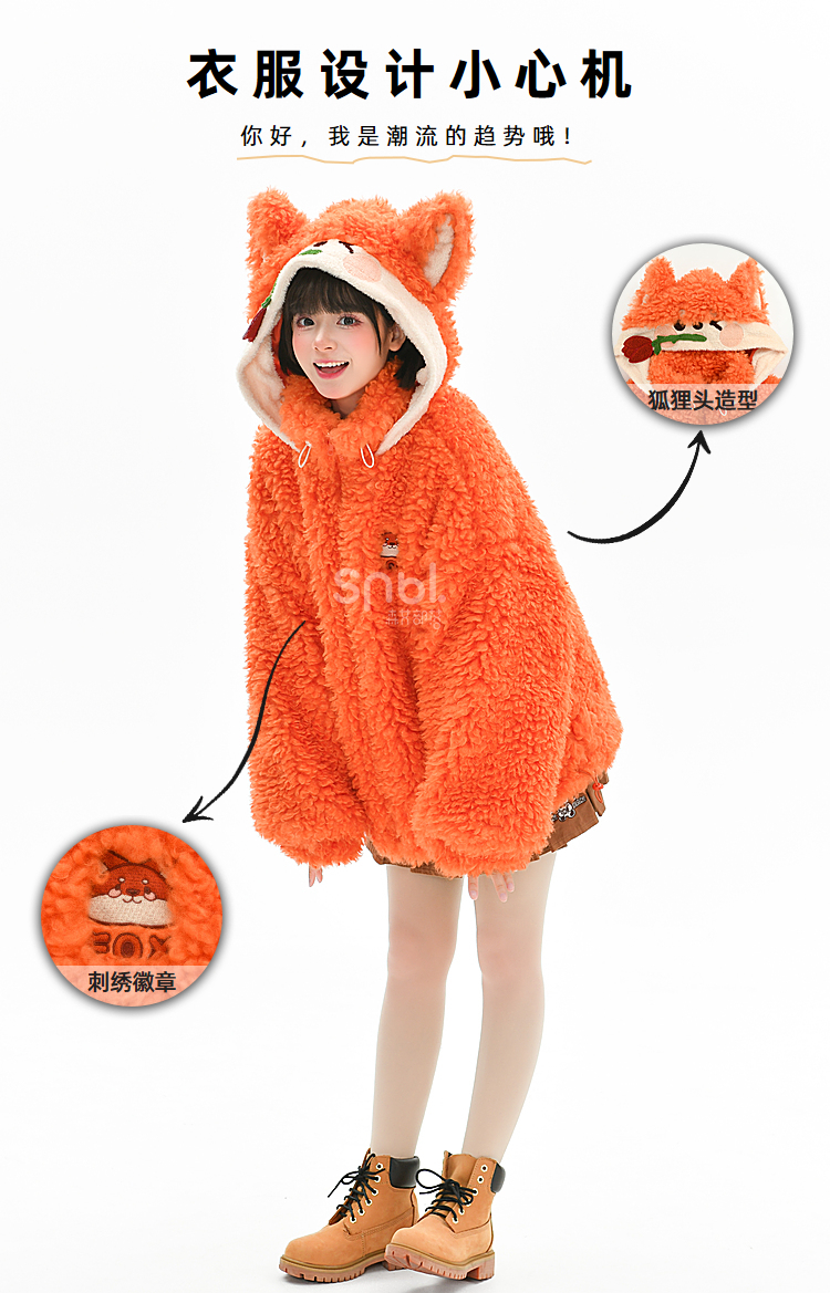 原創森女部落小眾設計感可愛萌趣風小狐狸連帽絨衫厚外套冬季新款