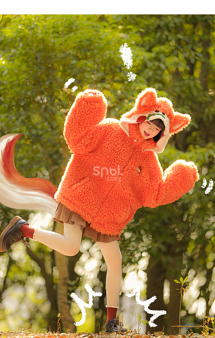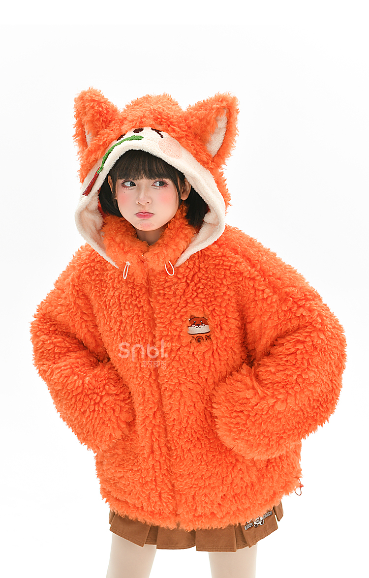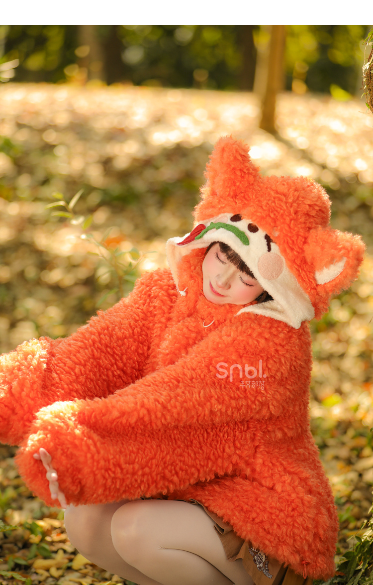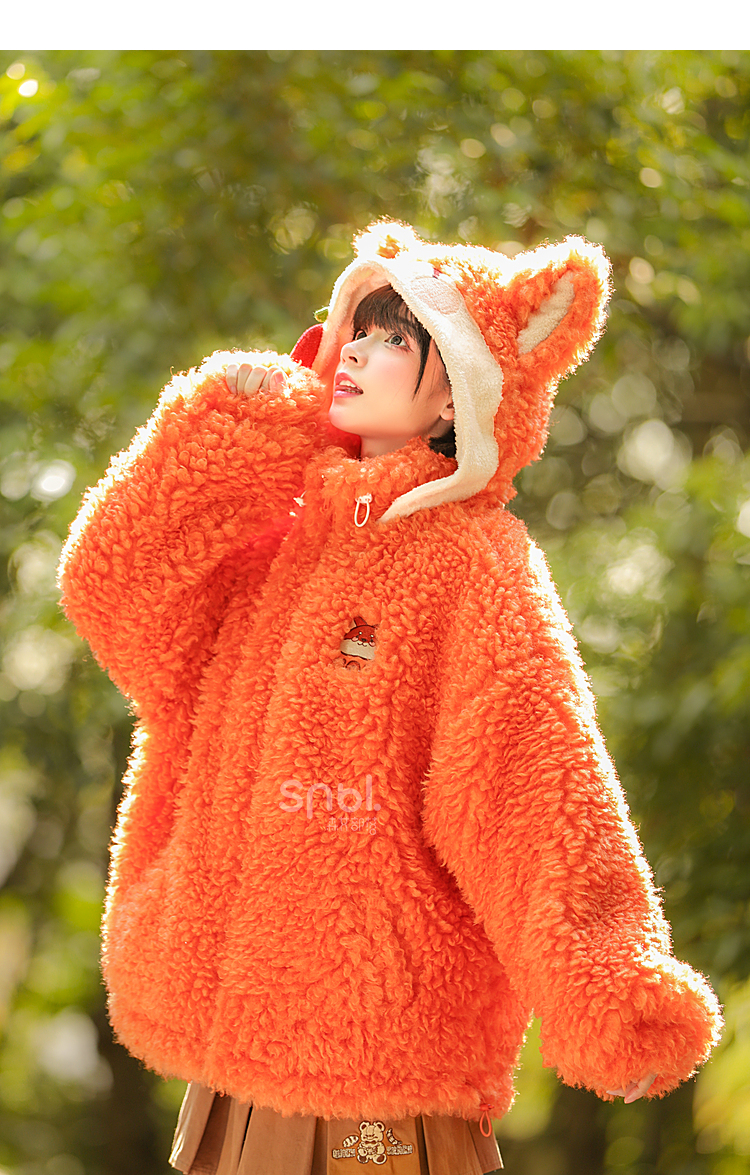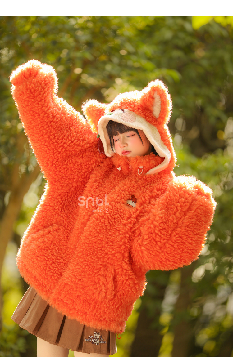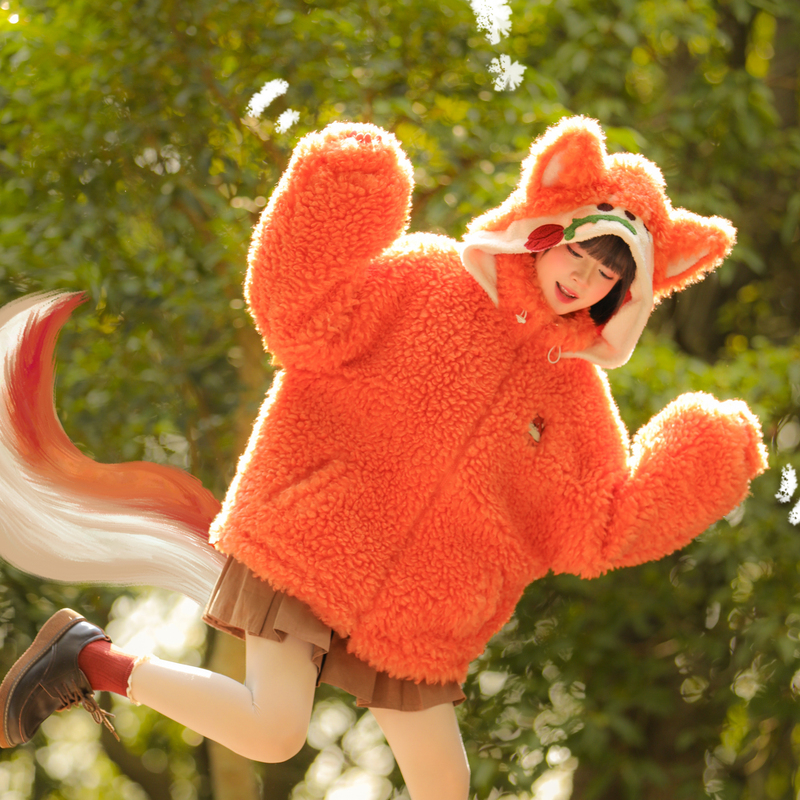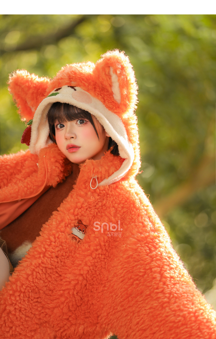 原創森女部落小眾設計感可愛萌趣風小狐狸連帽絨衫厚外套冬季新款