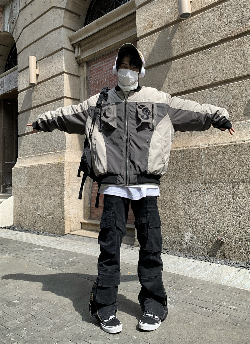 包醬鋪 美式拼色重磅機能刺繡飛行員棉衣男寬鬆百搭休閒鋪棉外套