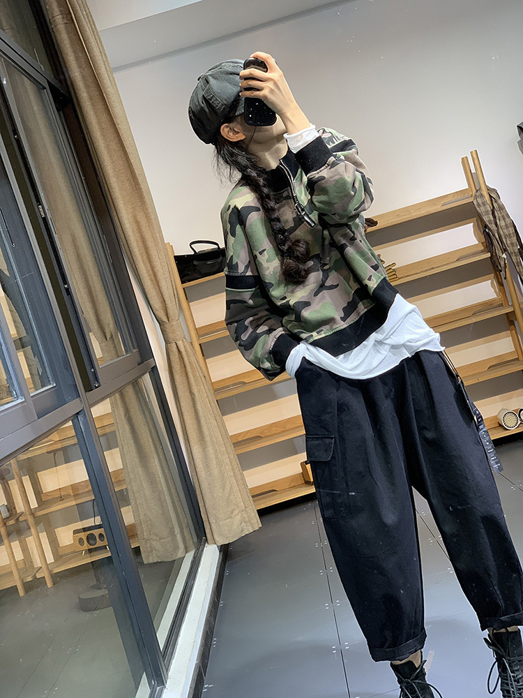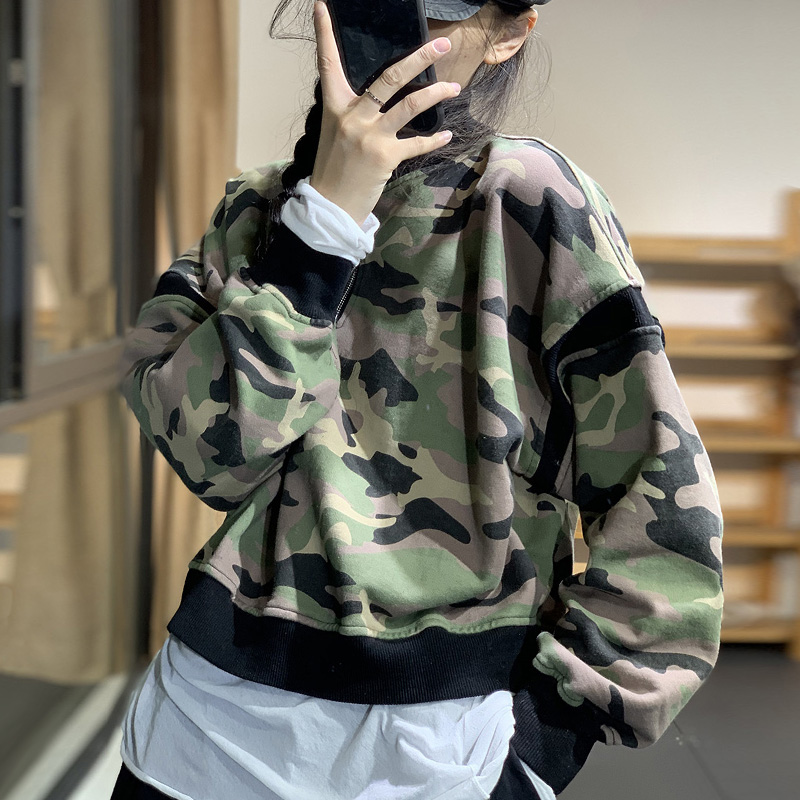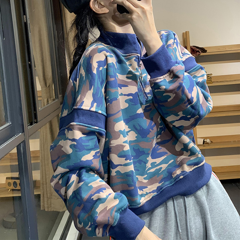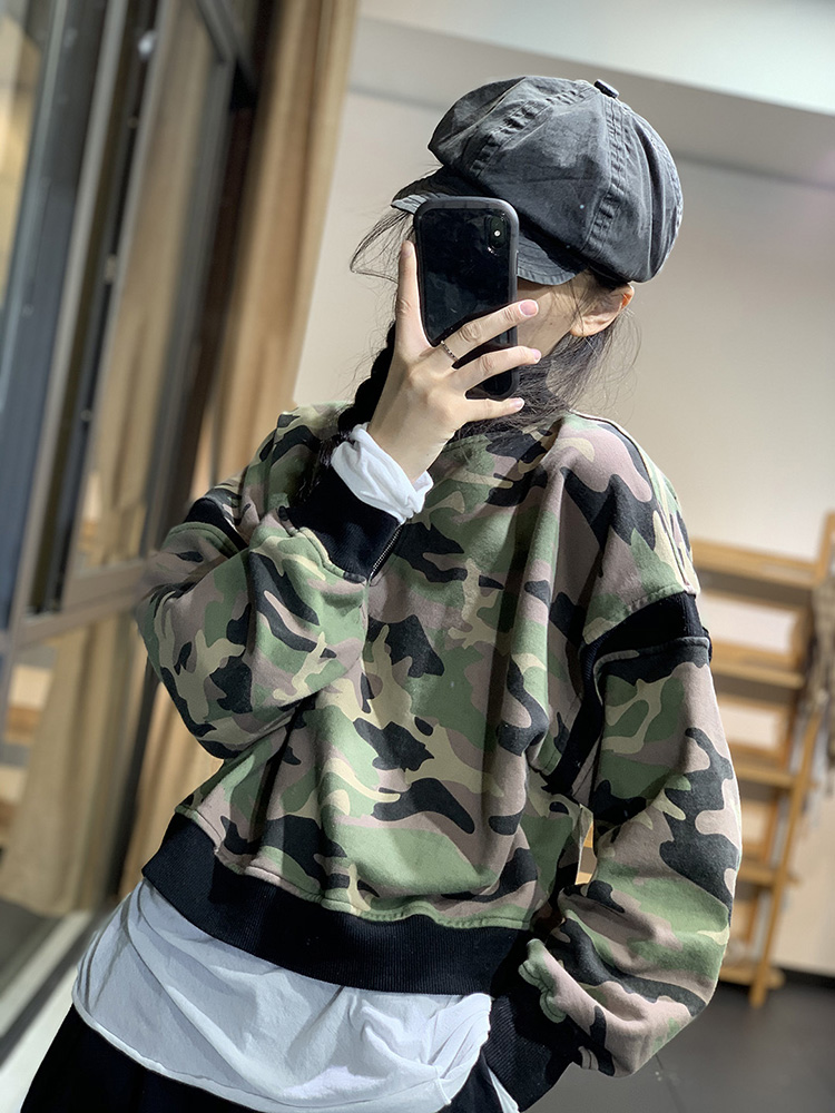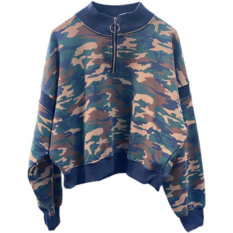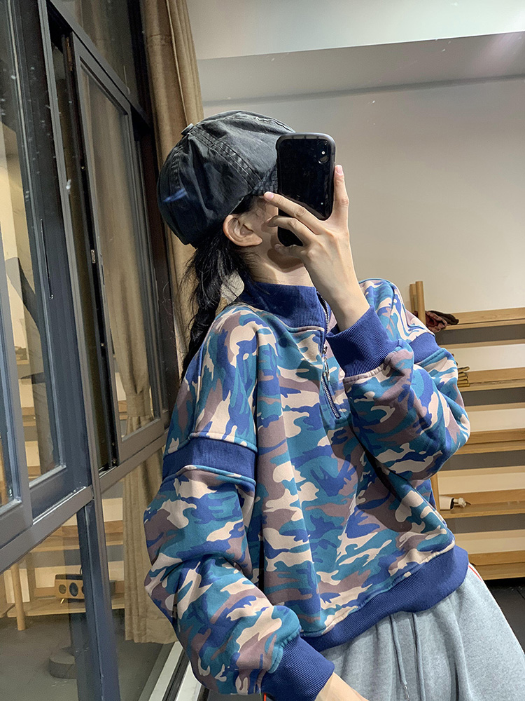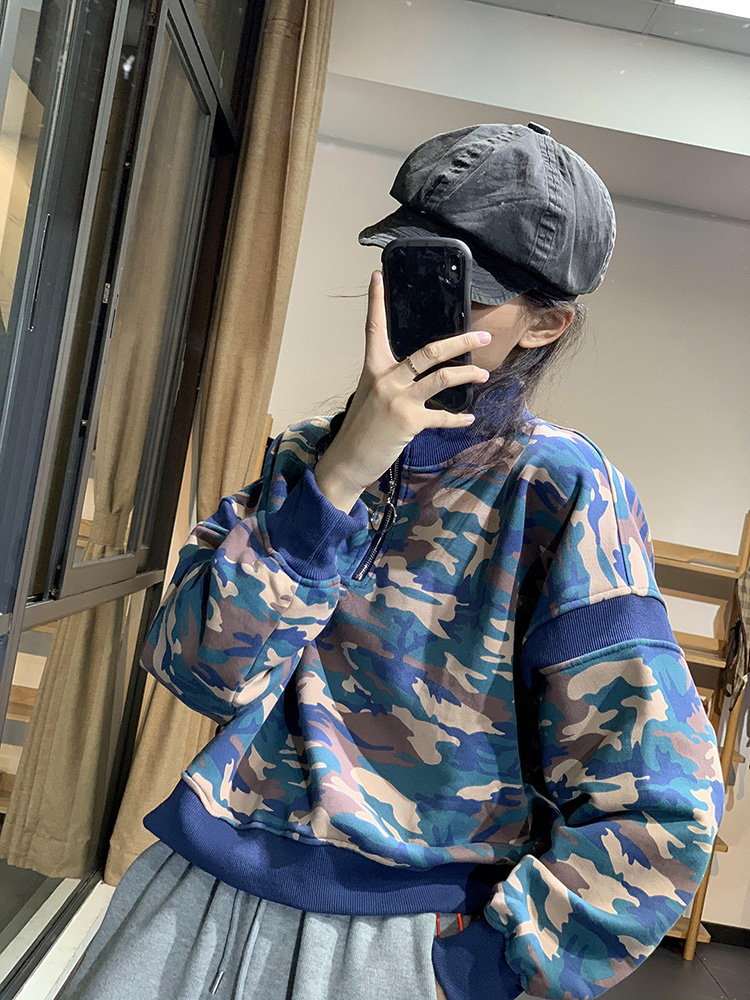 古與色冬季韓版時尚寬鬆百搭休閒短款長袖迷彩拉鍊套頭加絨衛衣女