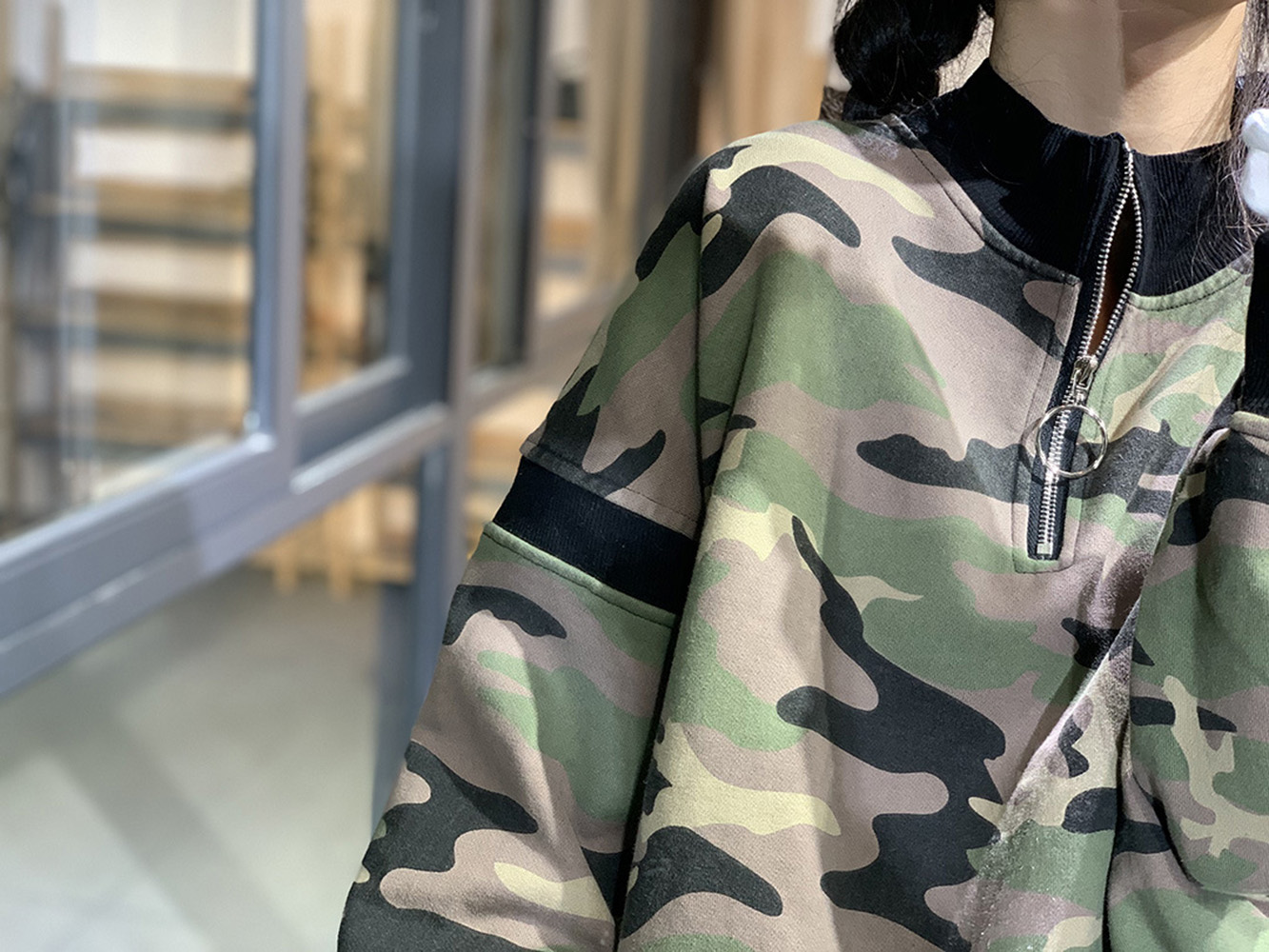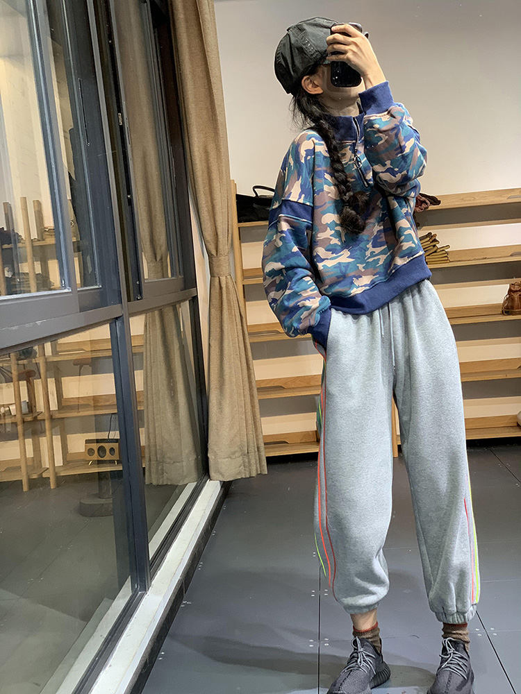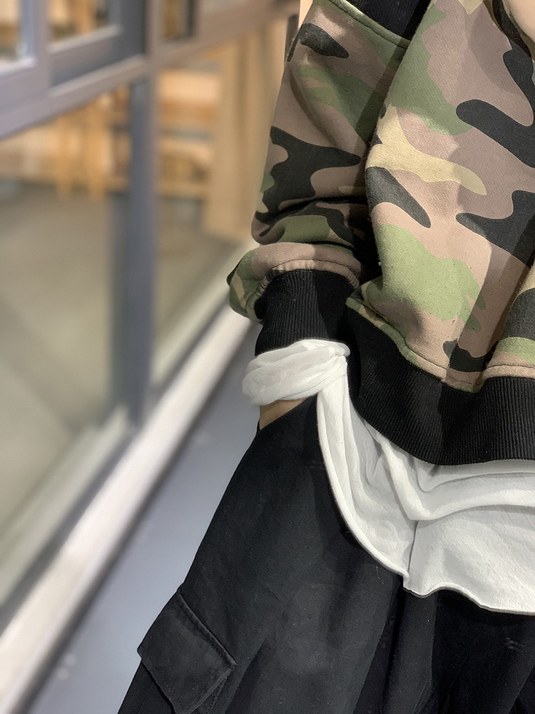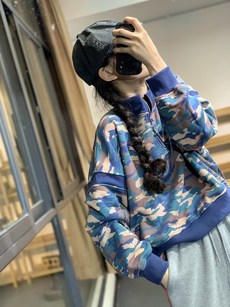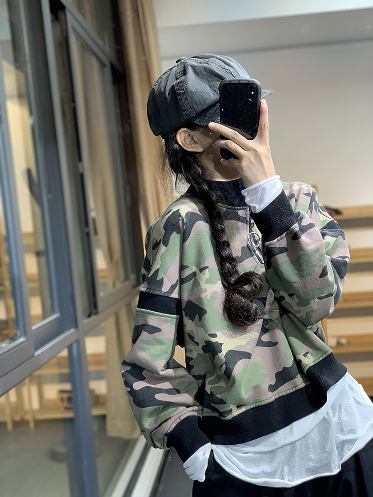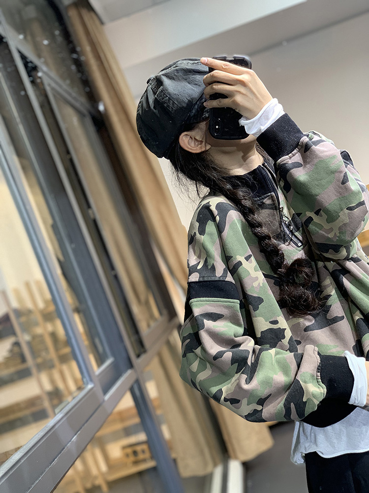 古與色冬季韓版時尚寬鬆百搭休閒短款長袖迷彩拉鍊套頭加絨衛衣女