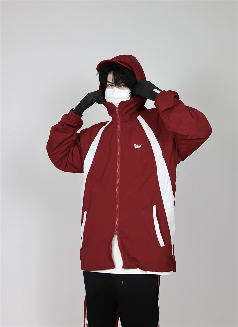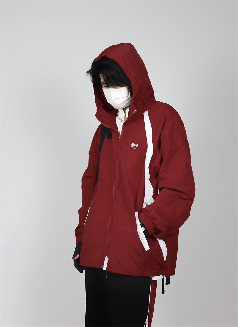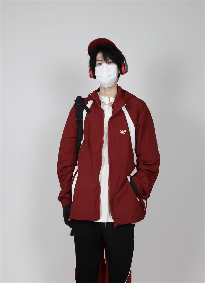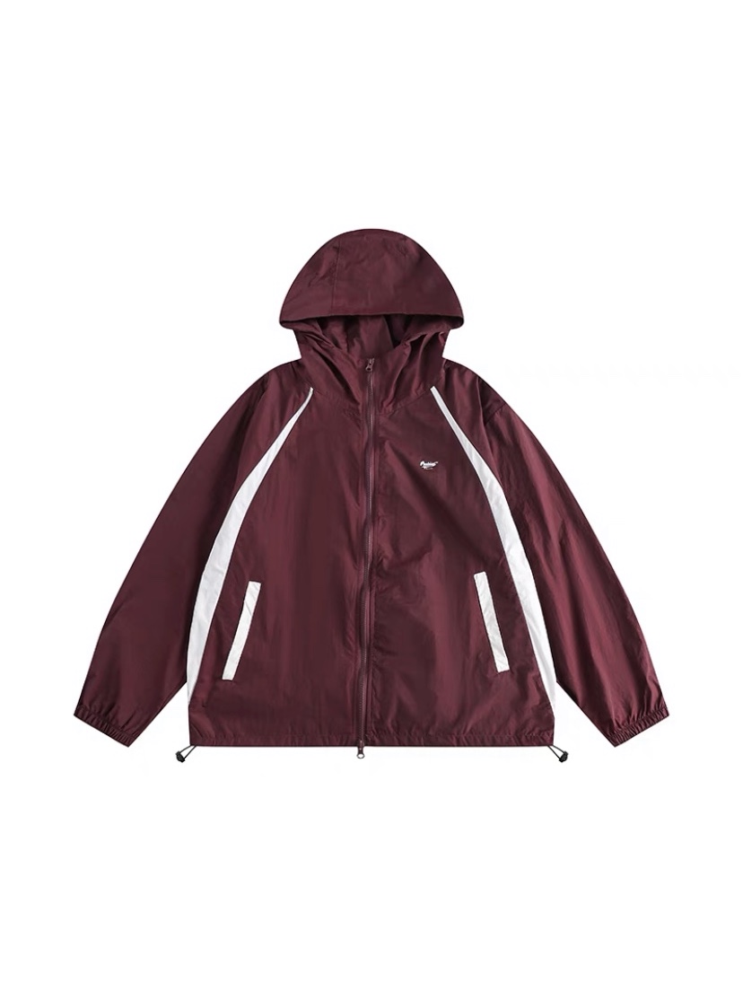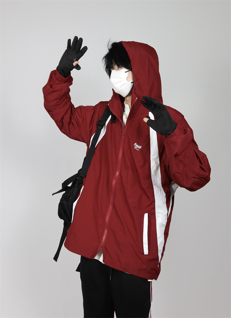 包醬鋪 美式夏季戶外酒紅色防曬衣薄寬鬆印花連帽衝鋒衣外套男女