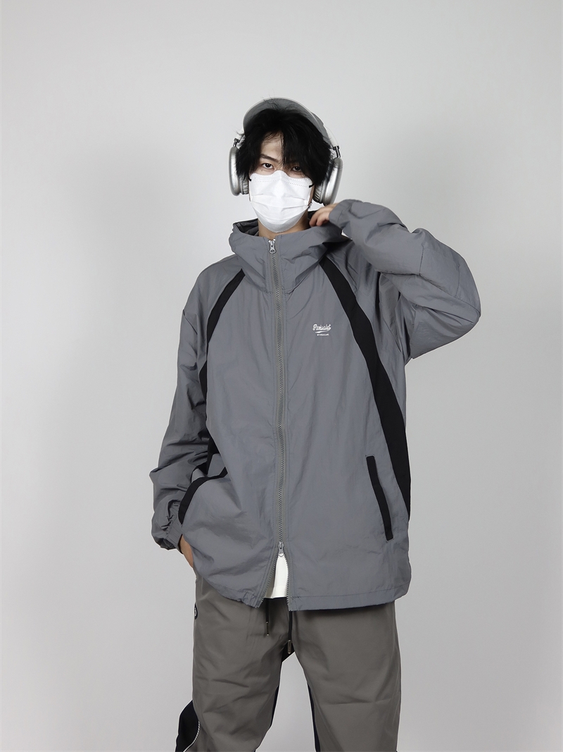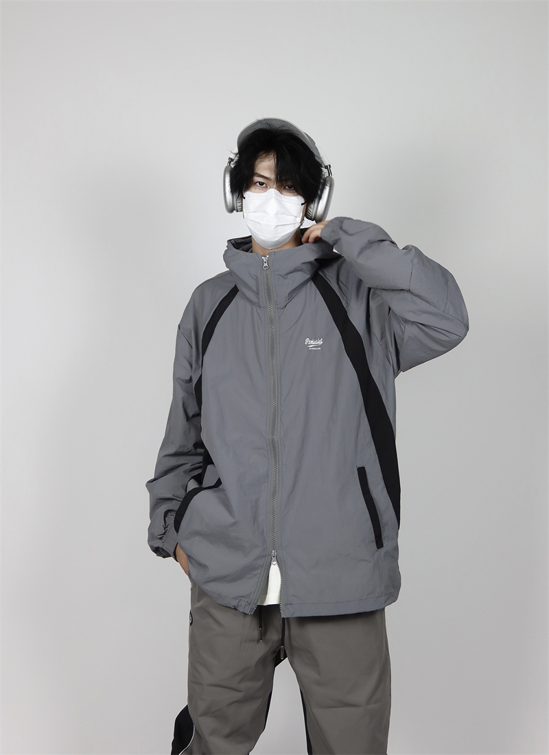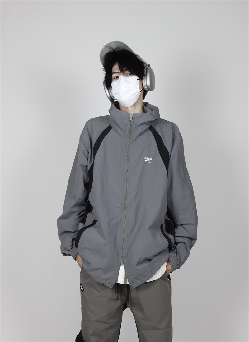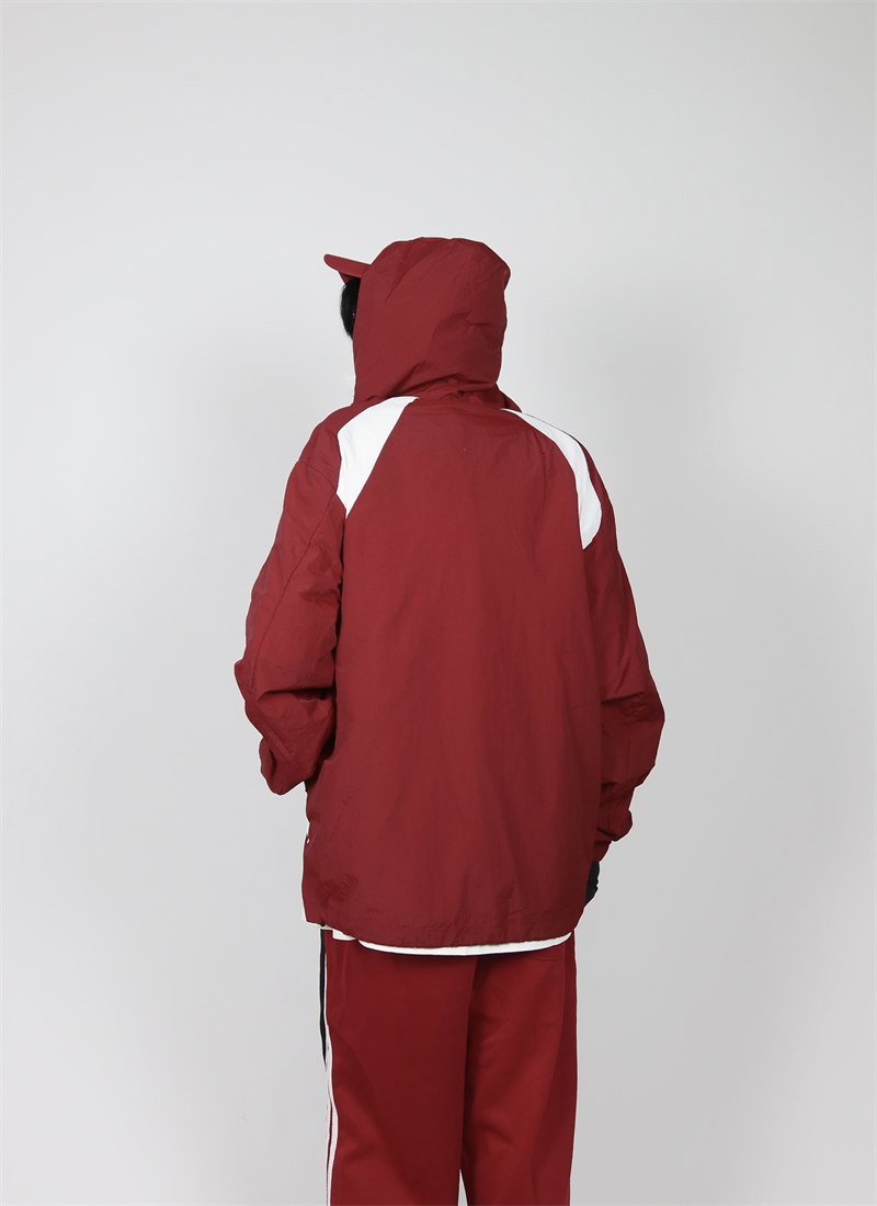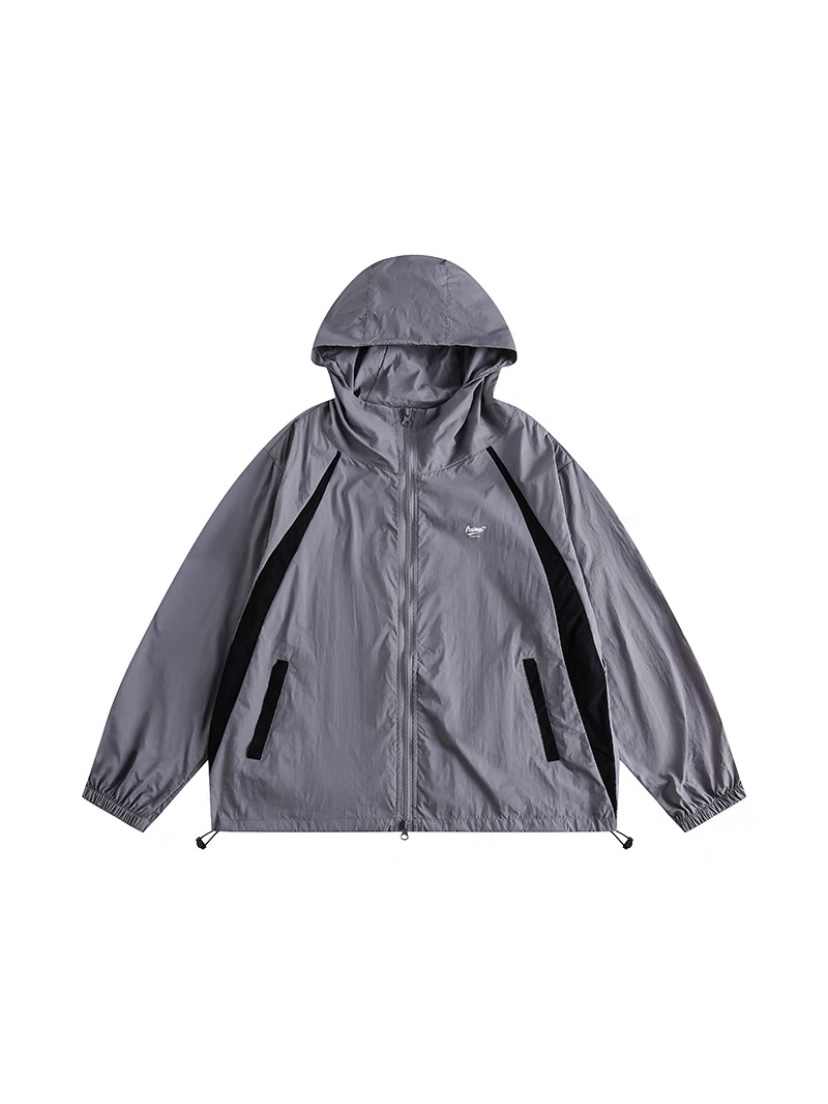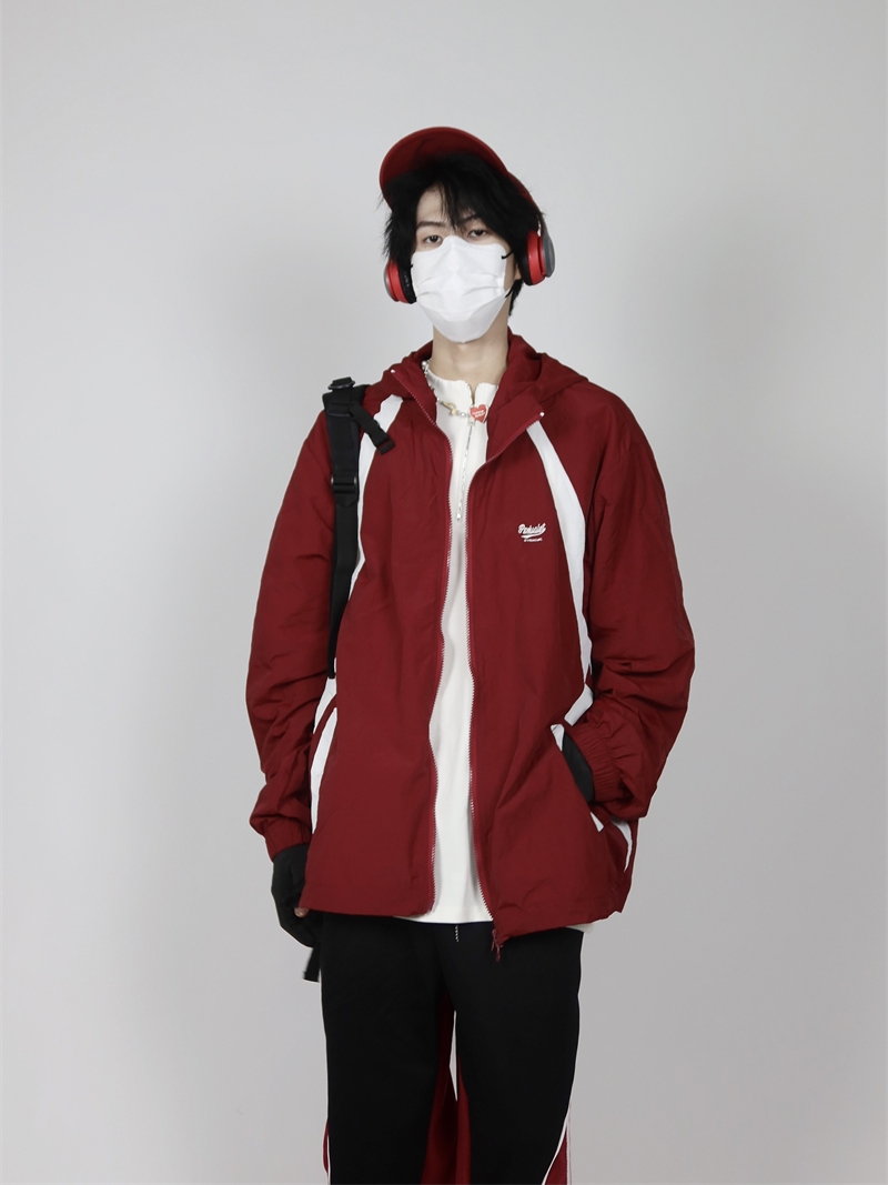 包醬鋪 美式夏季戶外酒紅色防曬衣薄寬鬆印花連帽衝鋒衣外套男女