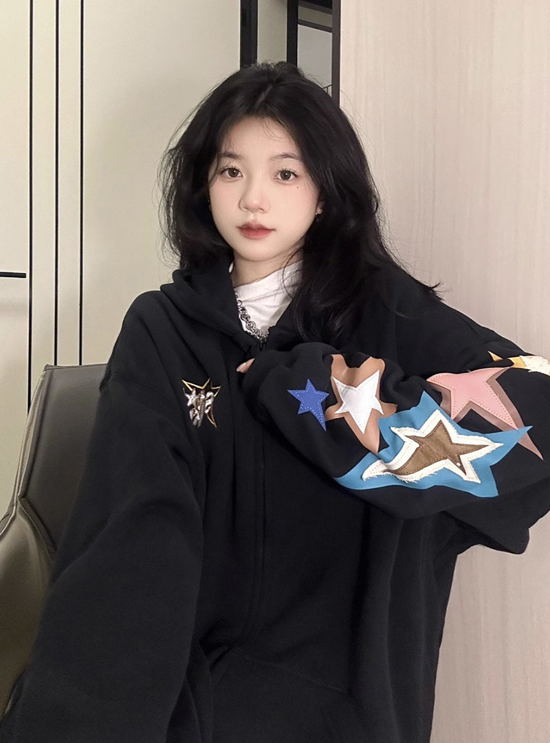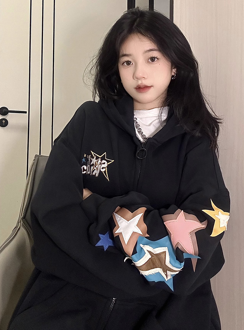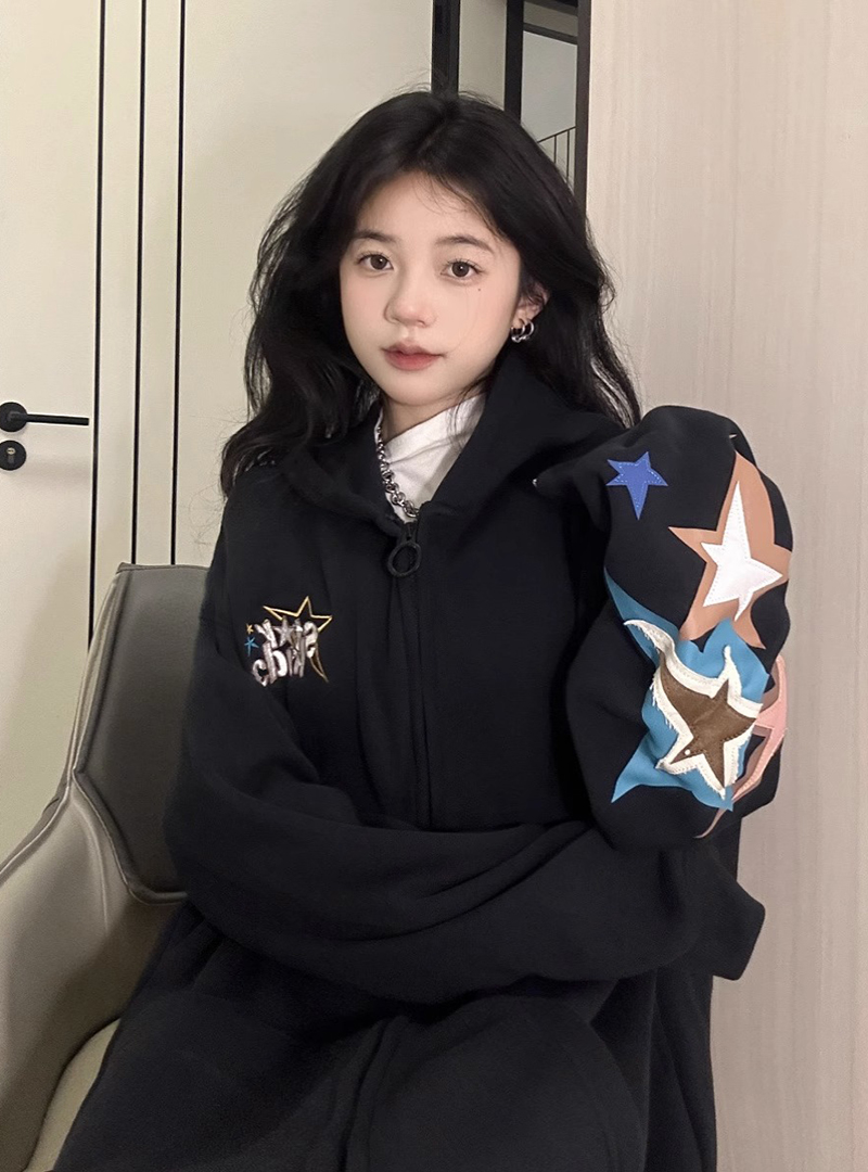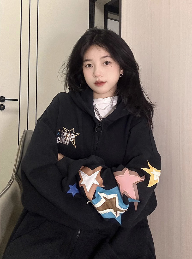 美式hiphop星星字母開衫拉鍊衛衣女春秋寬鬆原宿風氣質百搭外套潮