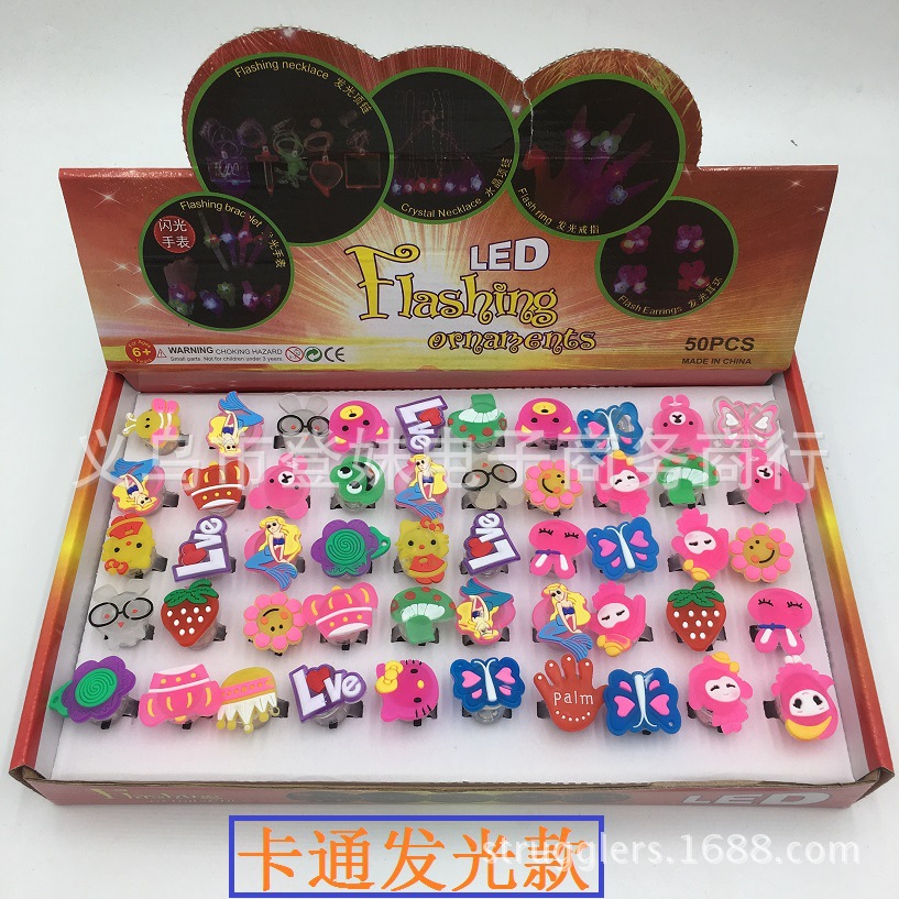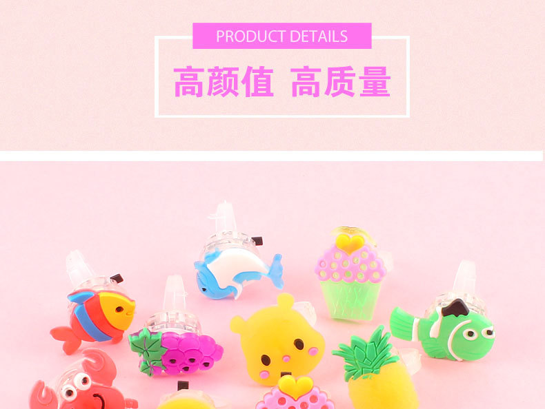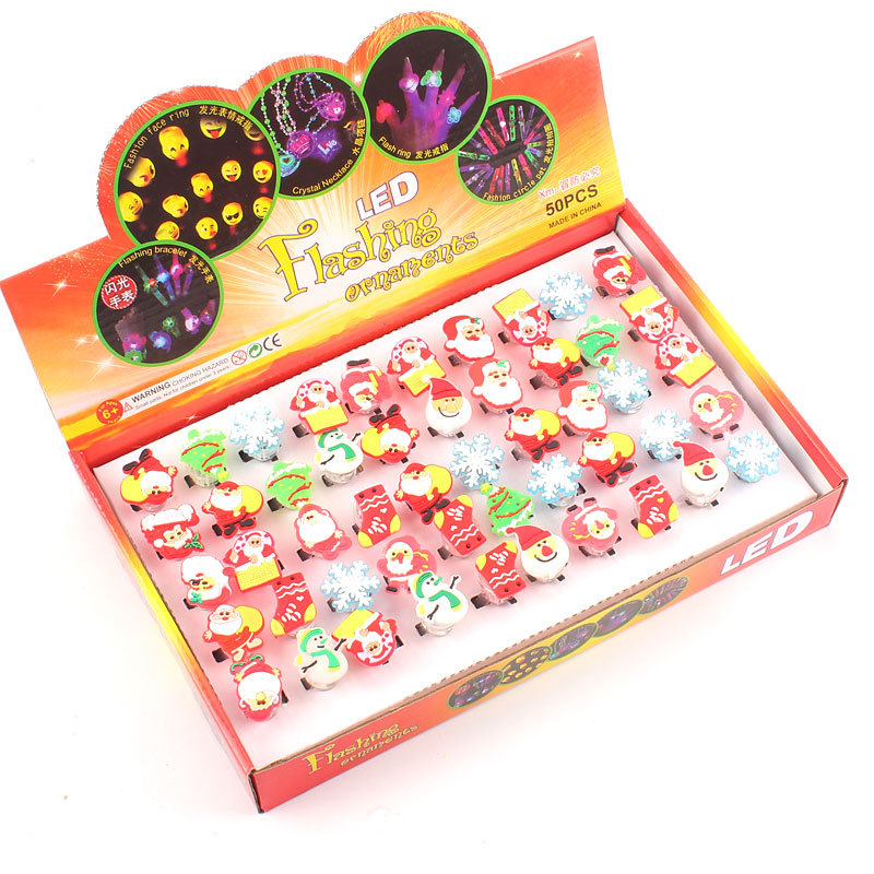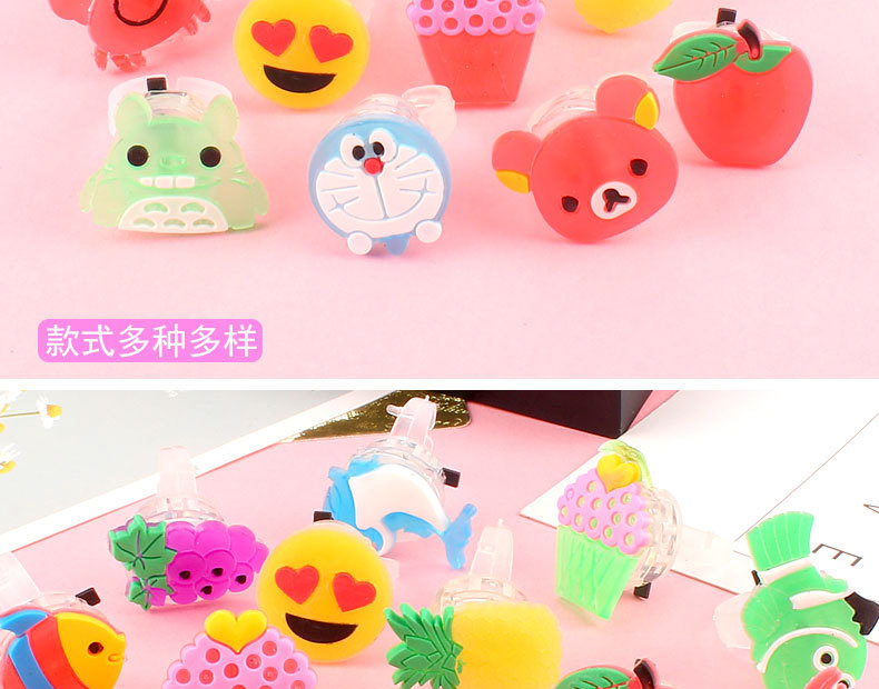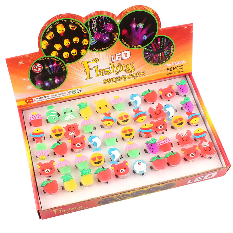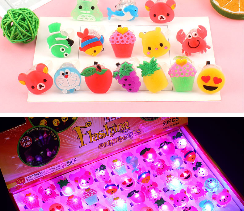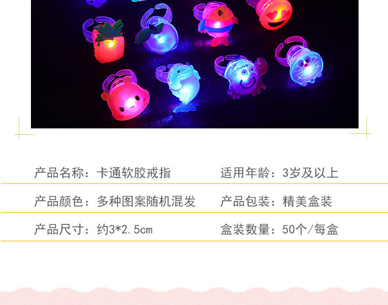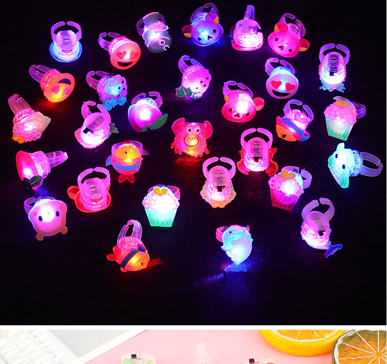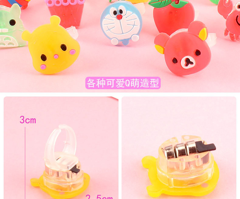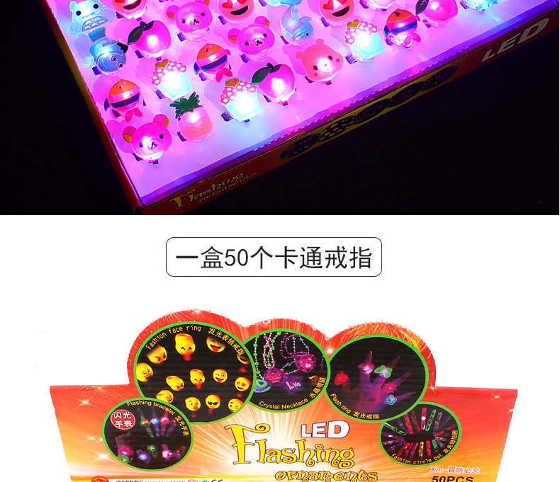 用    途:闪光戒指是您朋友聚会、生日、结婚和参演唱会的佳选择的高性价比装备!有各种款式形状,可以发出耀眼闪烁的光芒,在暗处闪亮起来是100%吸引别人的眼球!在婚礼,生日,朋友聚会,演唱会,各种partty 、KTV等,来宾一人分一个,十分的有气氛哦,远远胜过玫瑰花和其它饰品带来的效果啦!让您成为耀眼的闪亮   之星   默认发卡通款,要圣诞提前说,圣诞戒指过了圣诞节无法做退换货处理