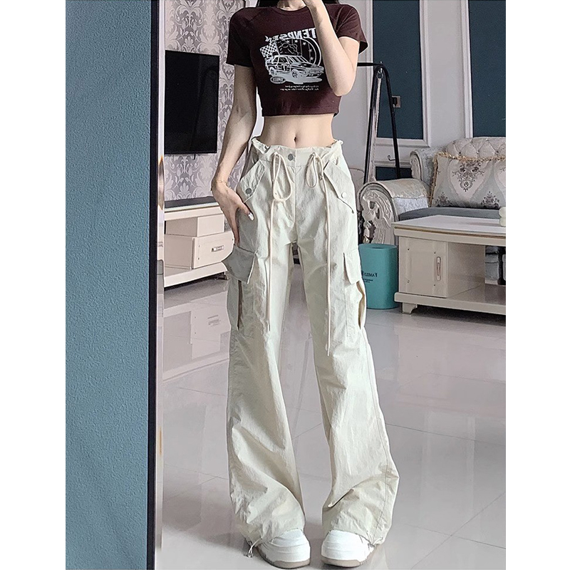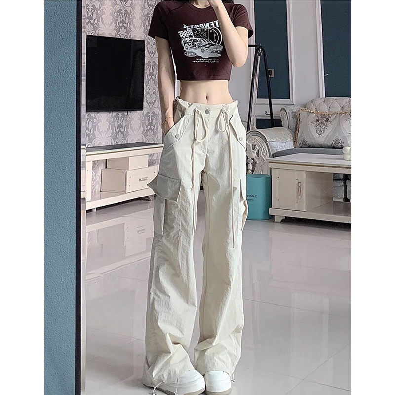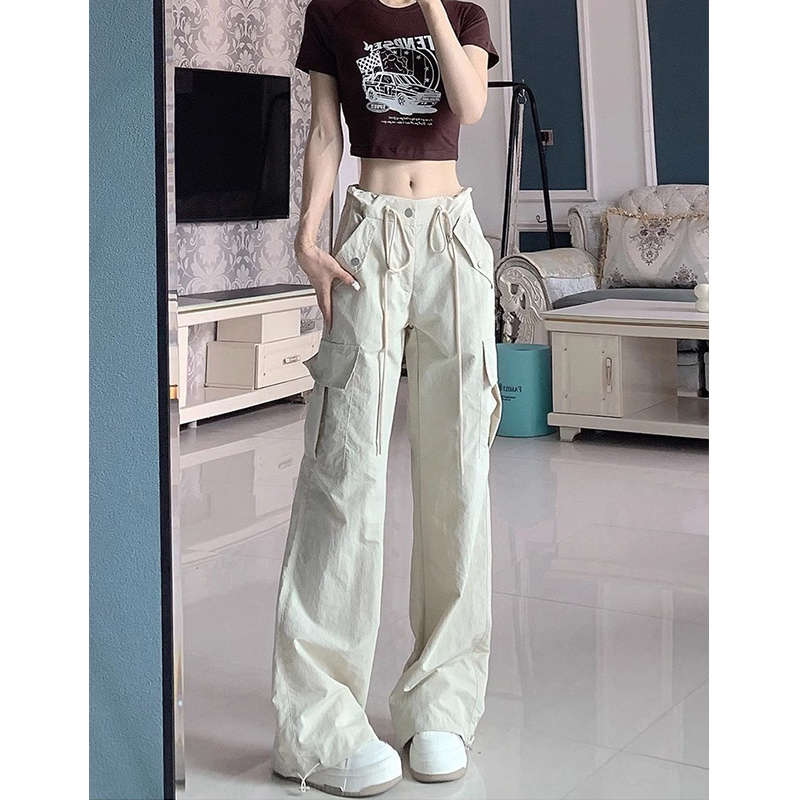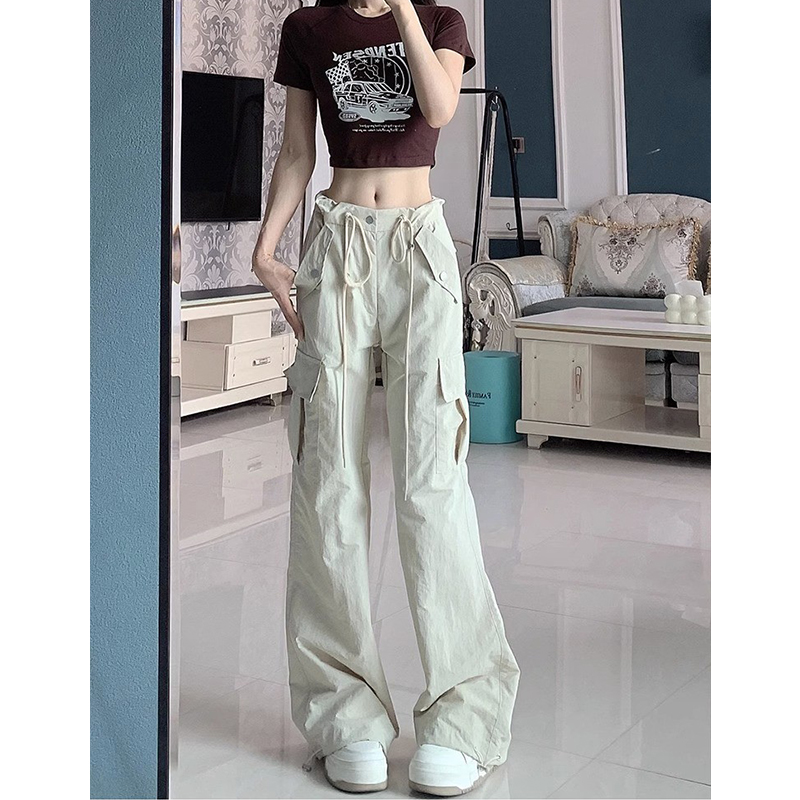 美式復古降落傘休閒工作服褲女夏季薄款高腰小個子速乾直筒闊腿長褲
