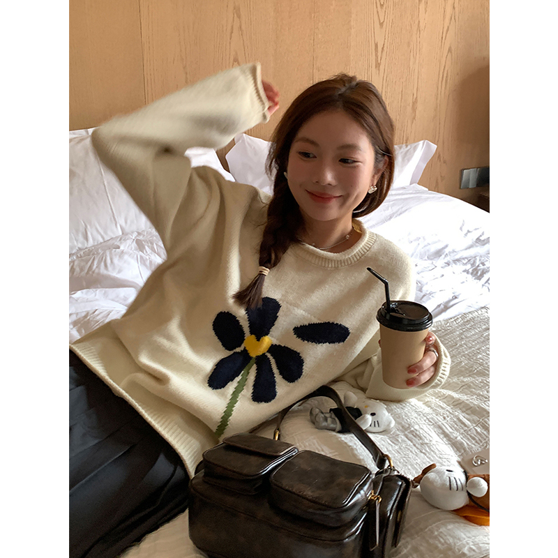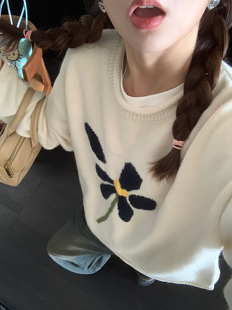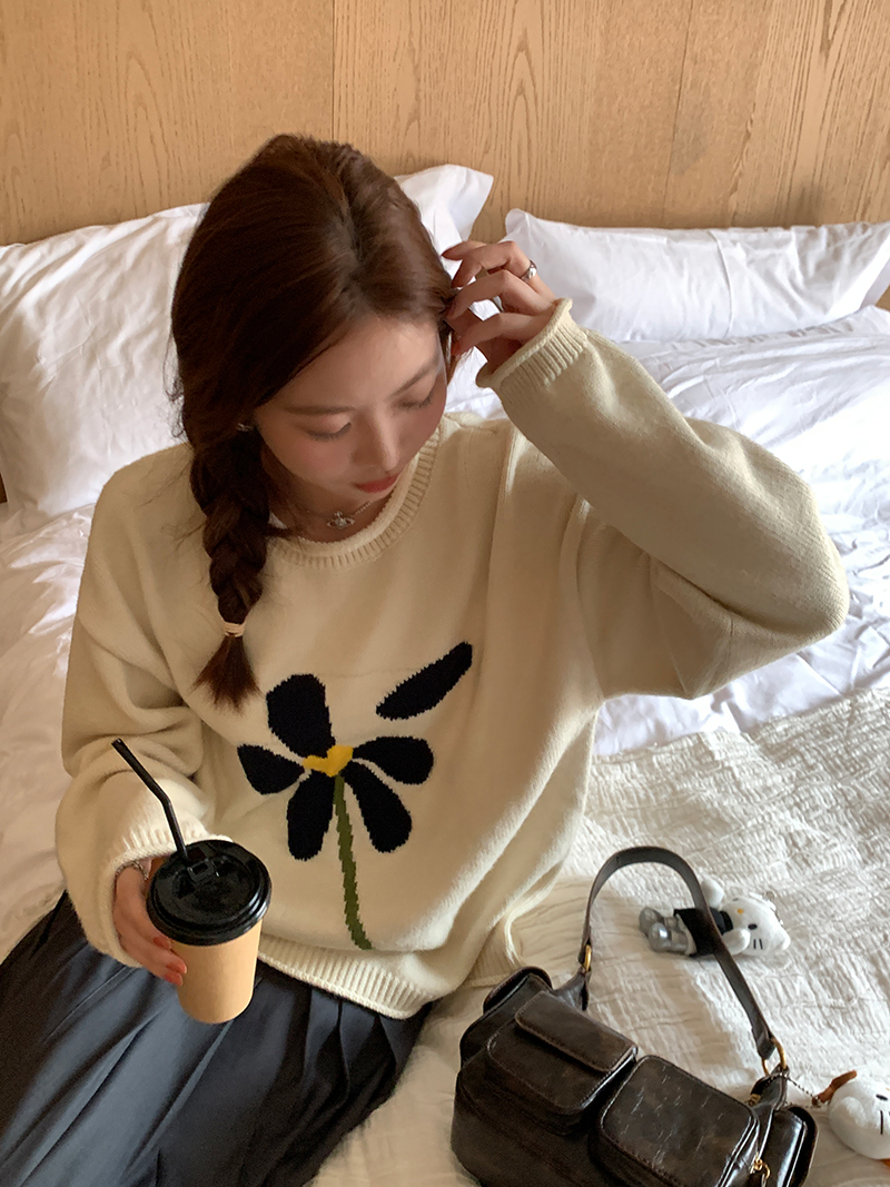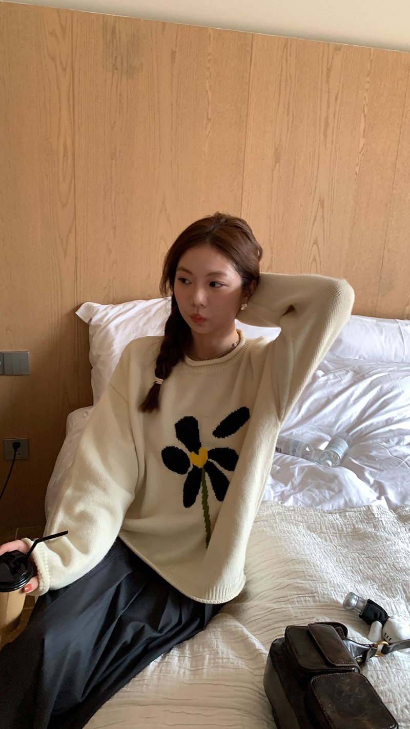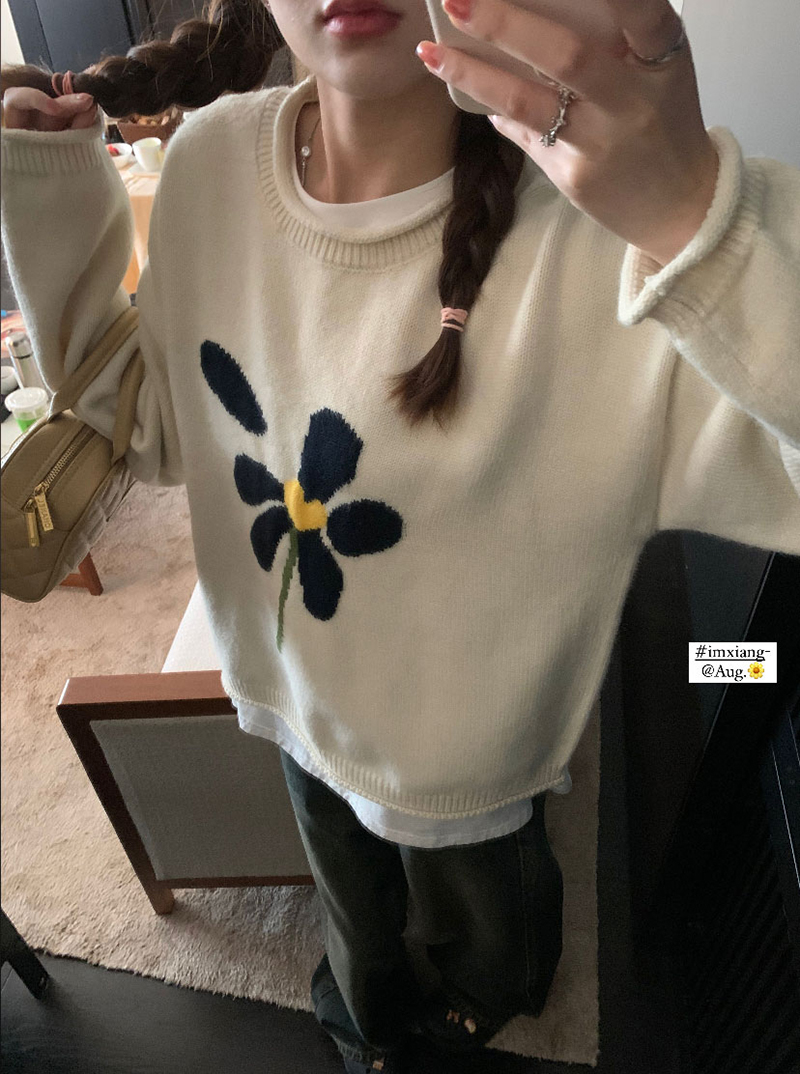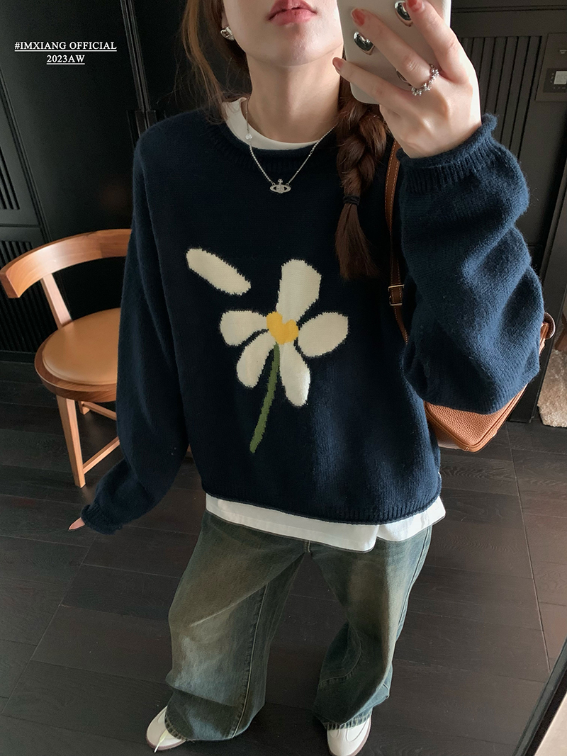 im向 小岞美術館 早秋趣味提花套頭毛衣女寬鬆慵懶撞色花朵針織衫