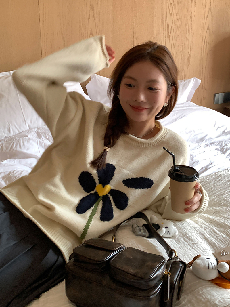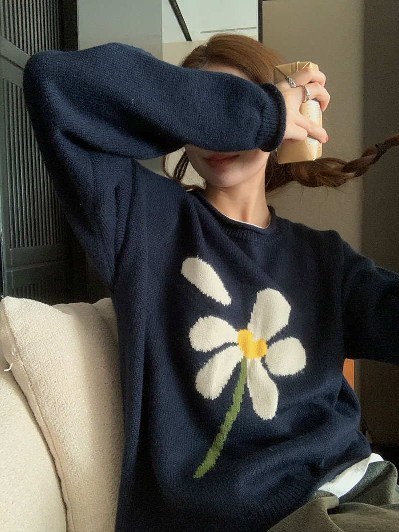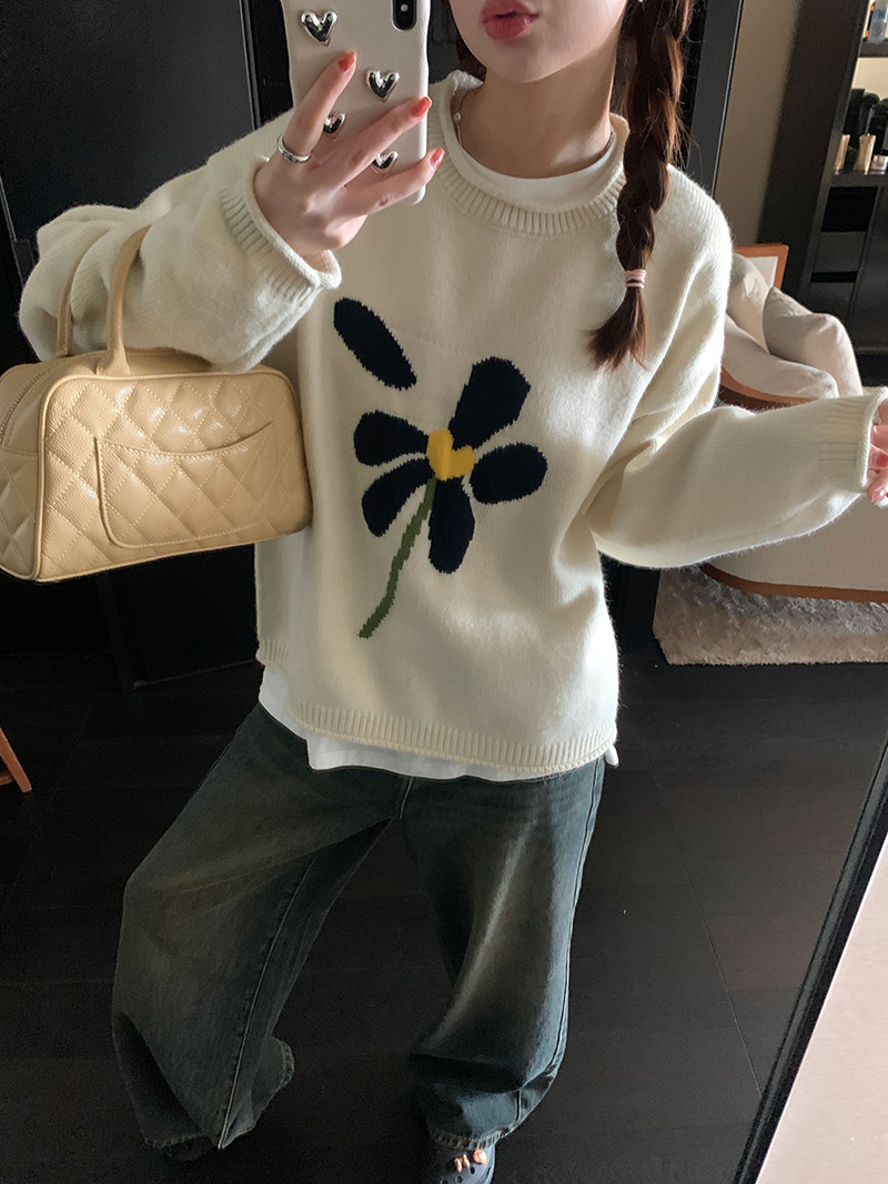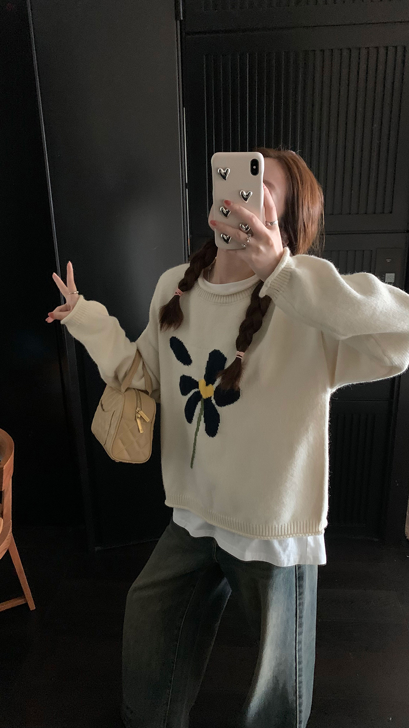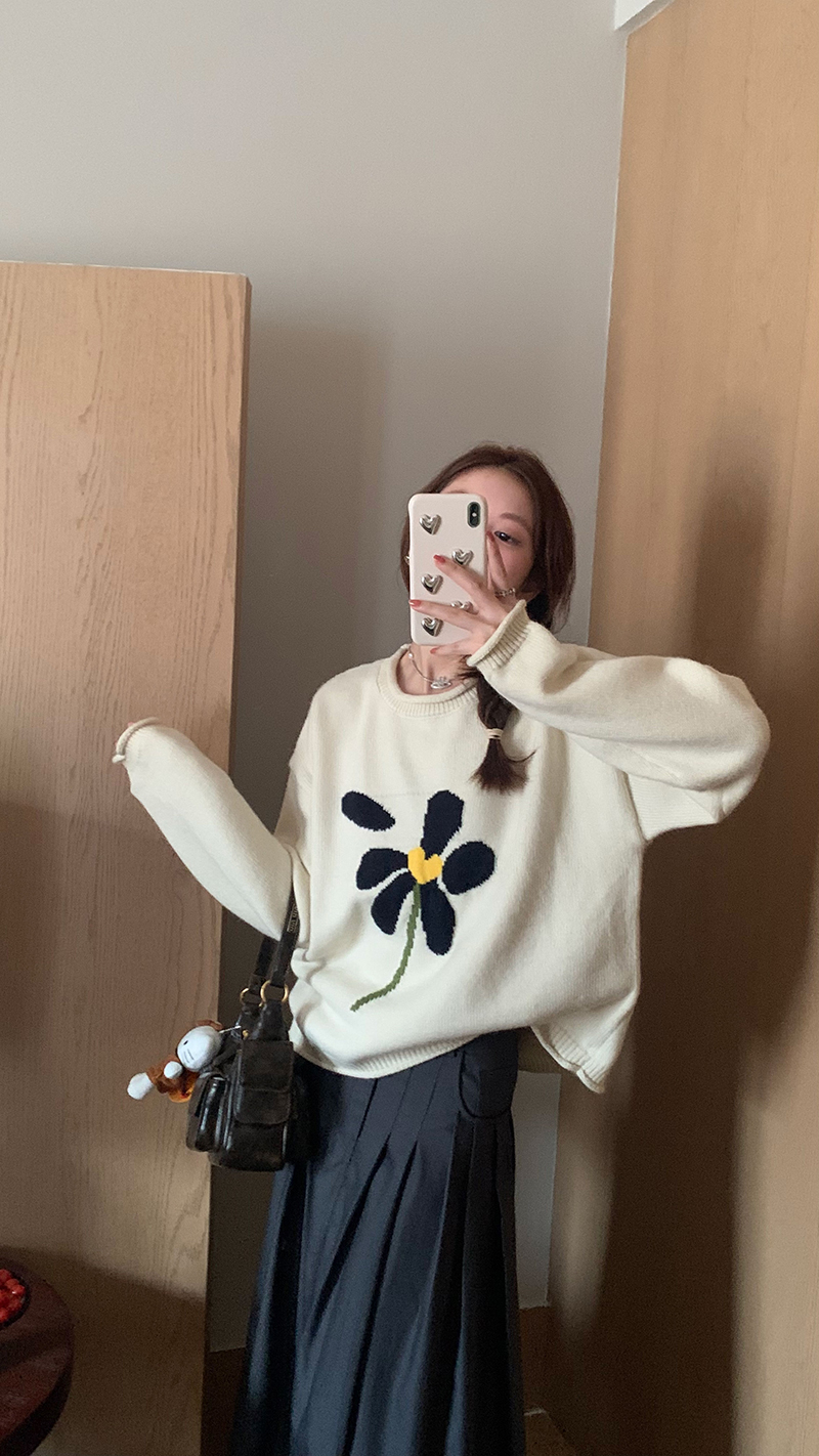 im向 小岞美術館 早秋趣味提花套頭毛衣女寬鬆慵懶撞色花朵針織衫