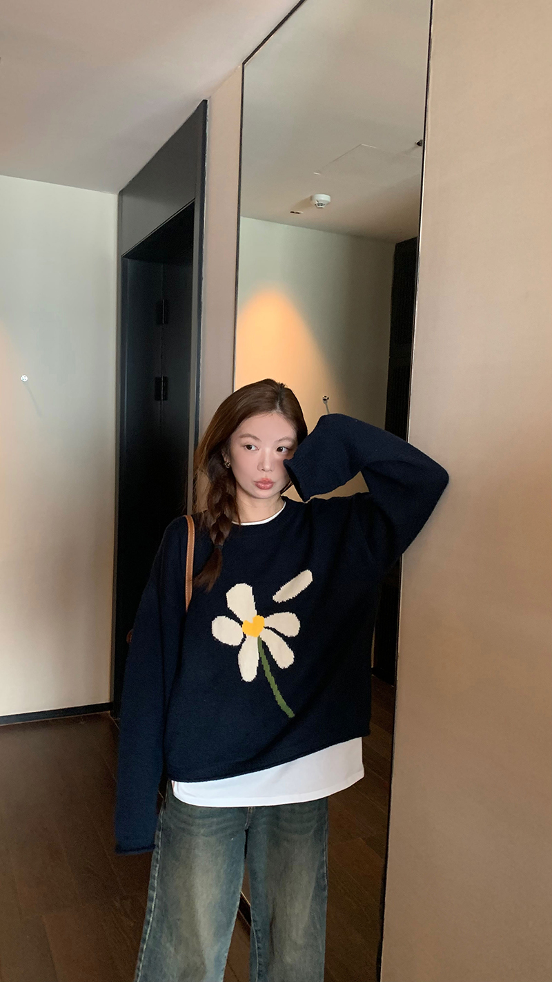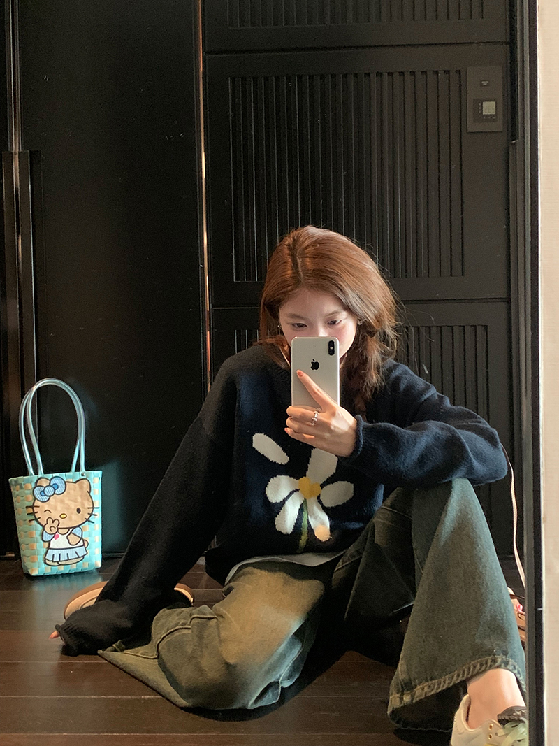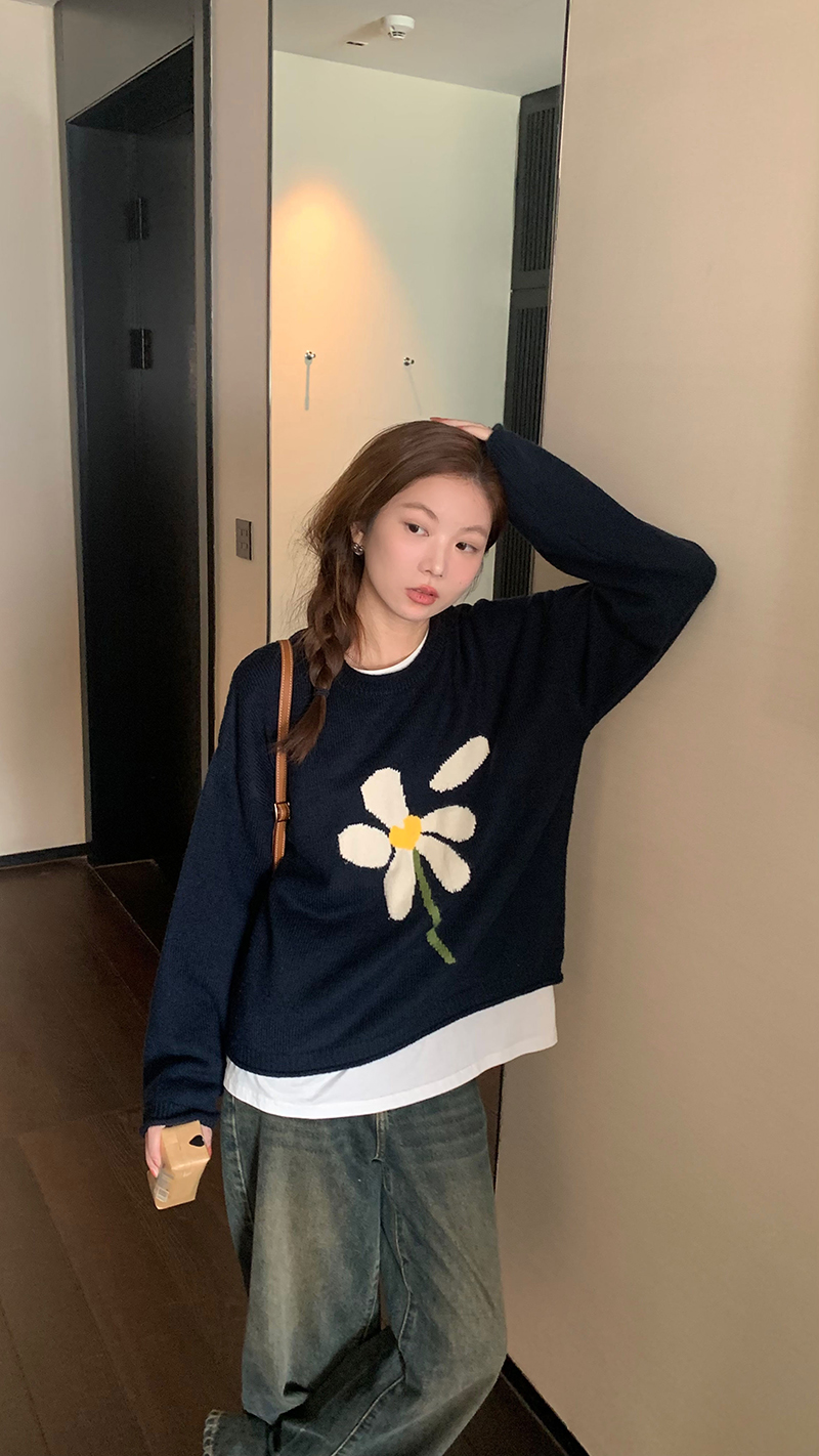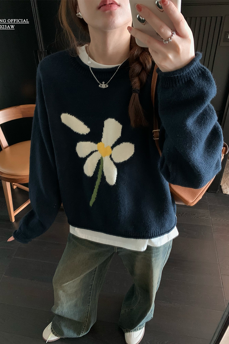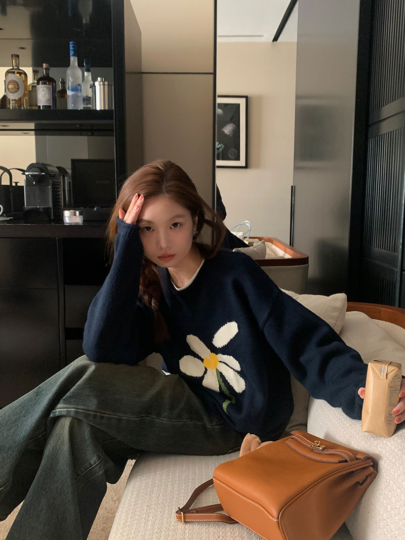 im向 小岞美術館 早秋趣味提花套頭毛衣女寬鬆慵懶撞色花朵針織衫