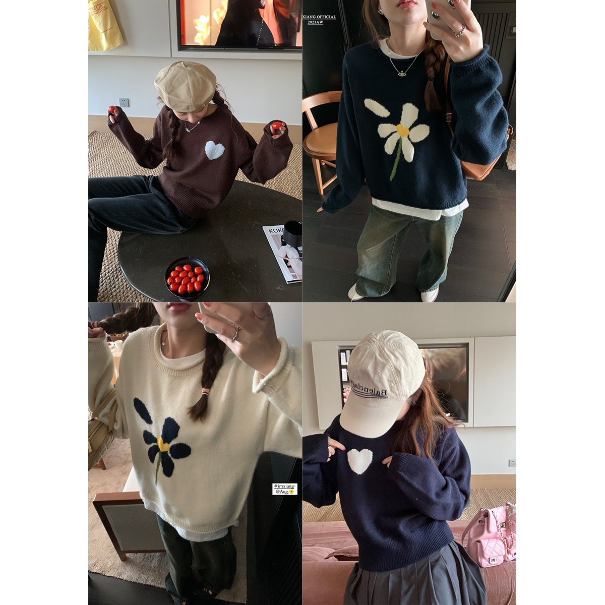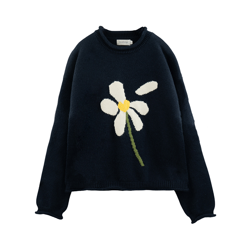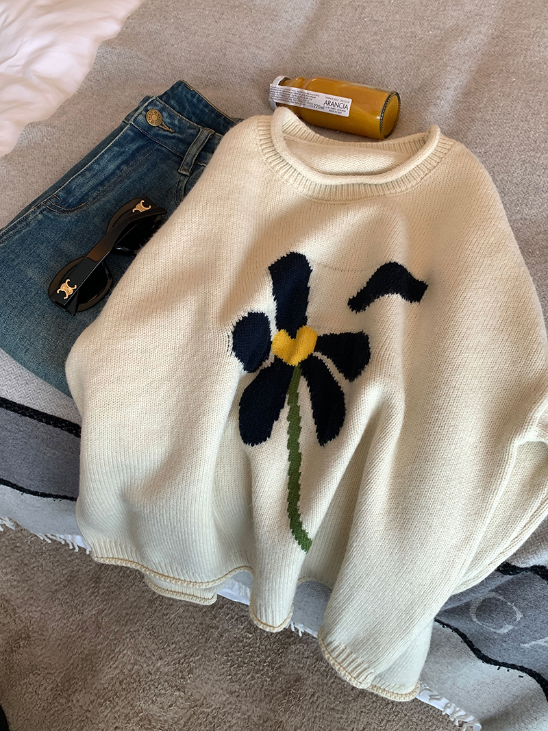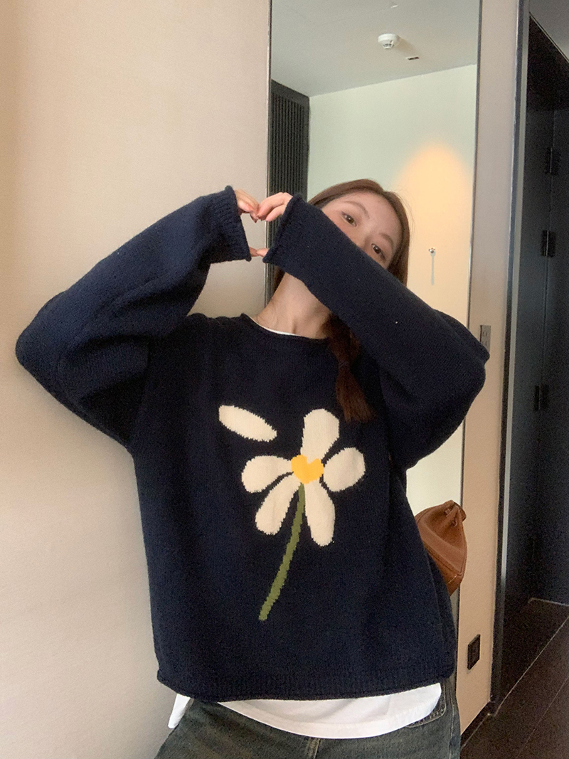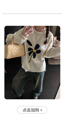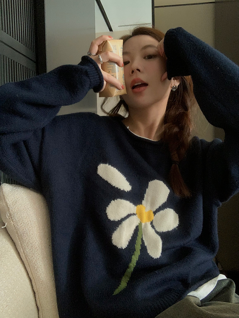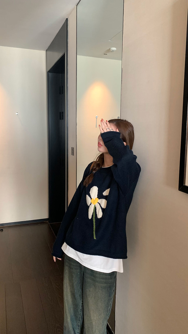 im向 小岞美術館 早秋趣味提花套頭毛衣女寬鬆慵懶撞色花朵針織衫