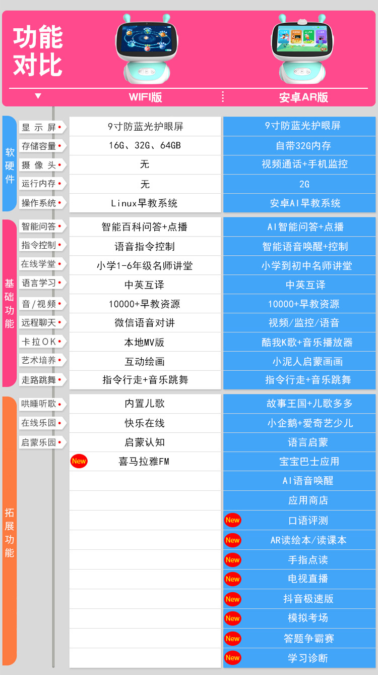 颜色 WIFI版蓝色16G+双话筒,WIFI版粉色16G+双话筒,WIFI版蓝色32G+双话筒,WIFI版粉色32G+双话筒,WIFI版蓝色64G+双话筒,WIFI版粉色64G+双话筒,安卓版蓝色(1+16)+双话筒,安卓版粉色(1+16)+双话筒,安卓版蓝色(2+32)+双话筒,安卓版粉色(2+32)+双话筒