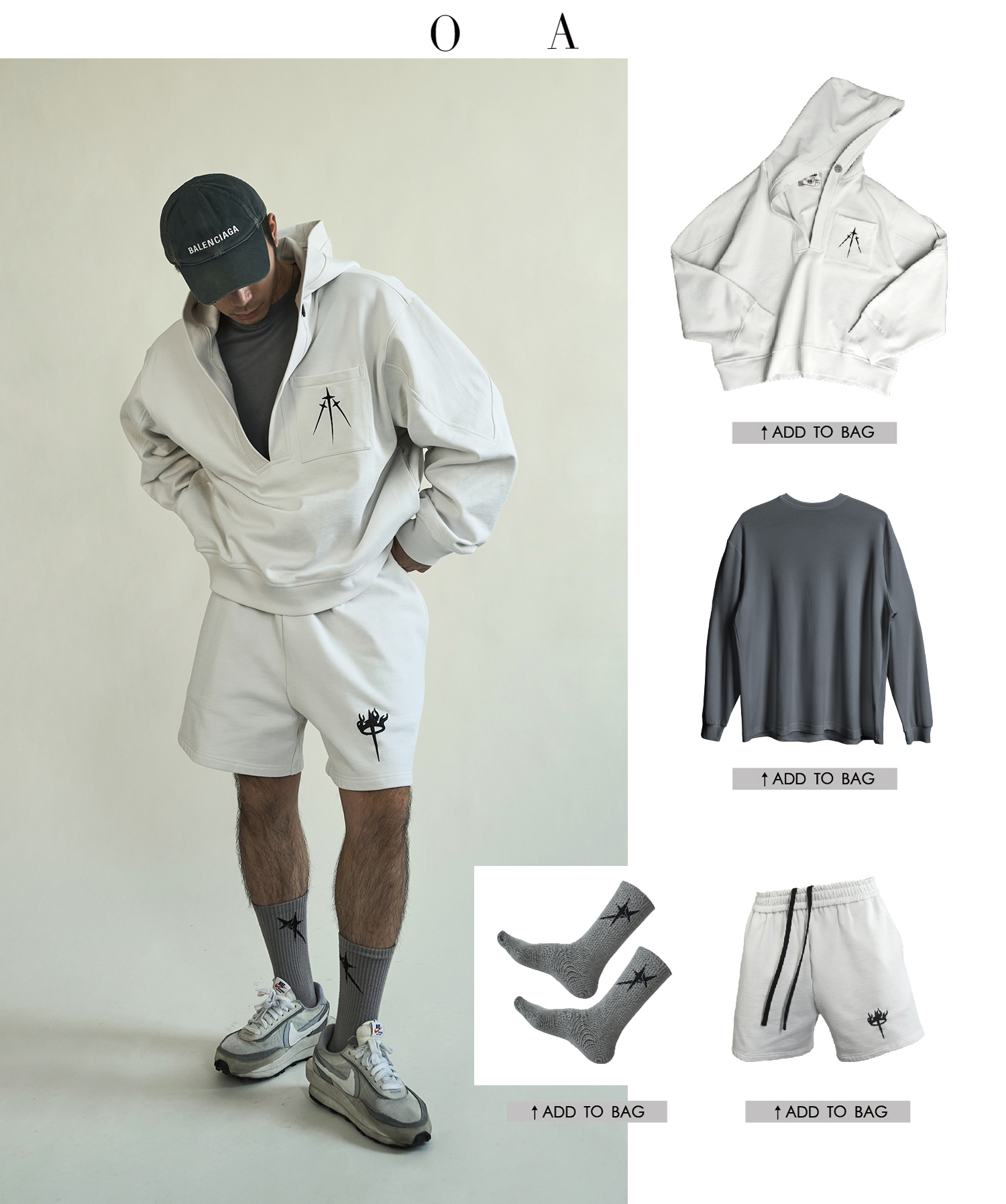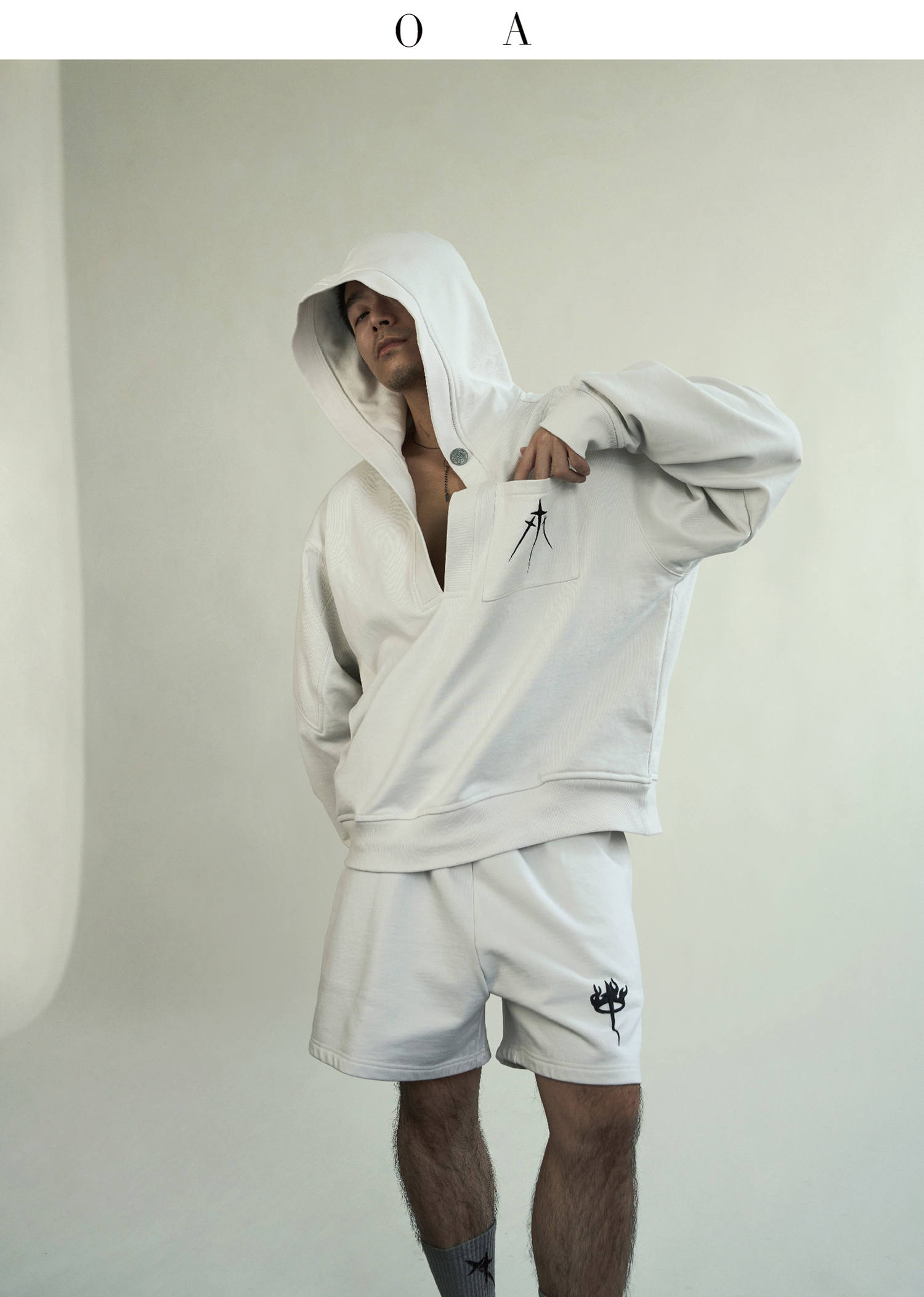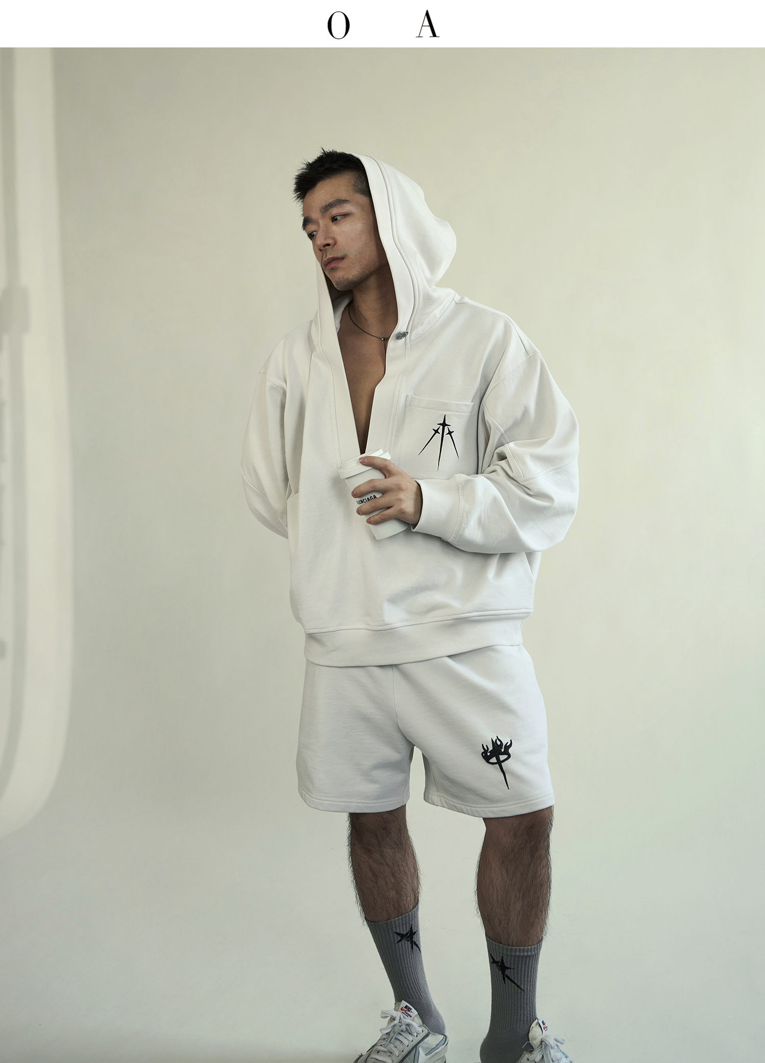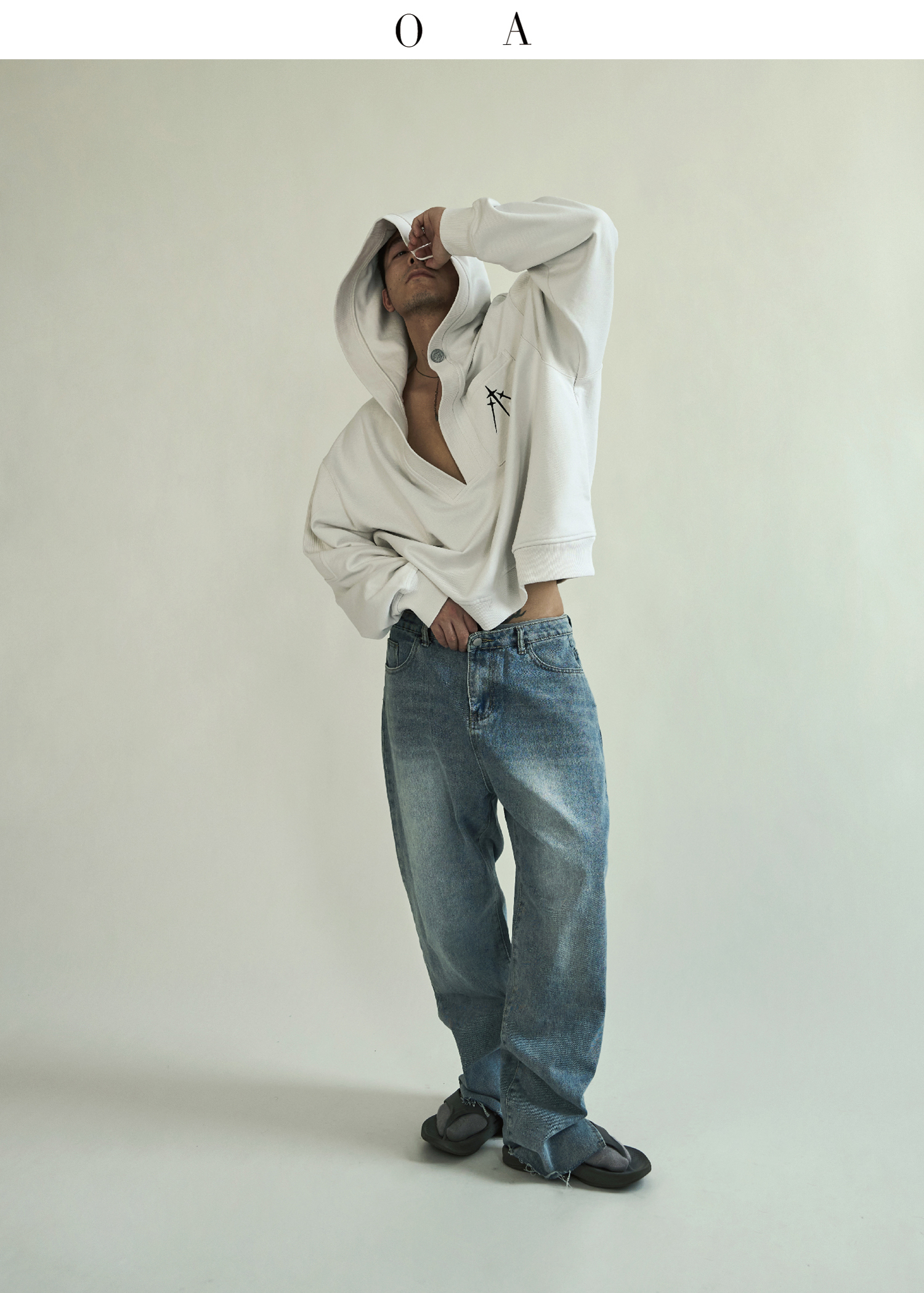 BLUECAP STUDIO 2022AW OA11深領刺繡字母水洗白廓形連帽運動衫外套