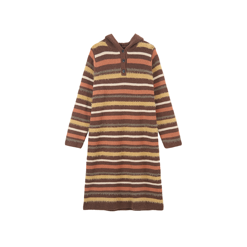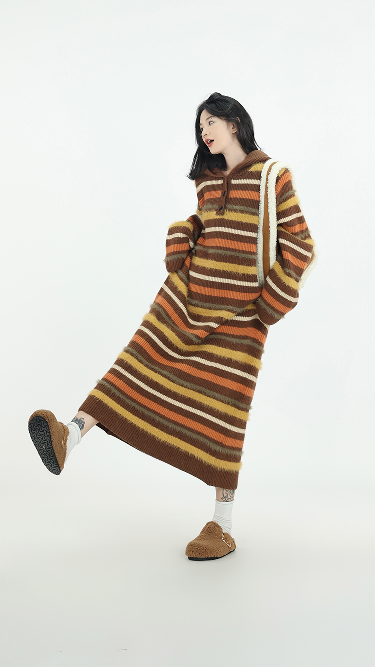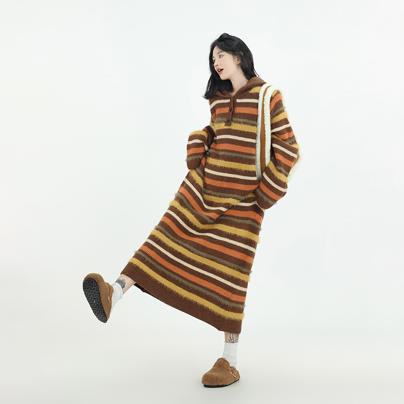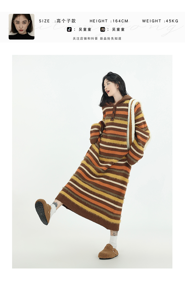 吳童自制 撞色條紋休閒上衣連帽洋裝女秋冬韓系直筒寬鬆長版毛衣裙