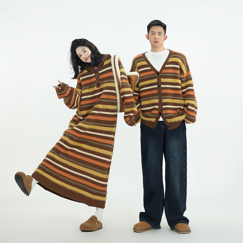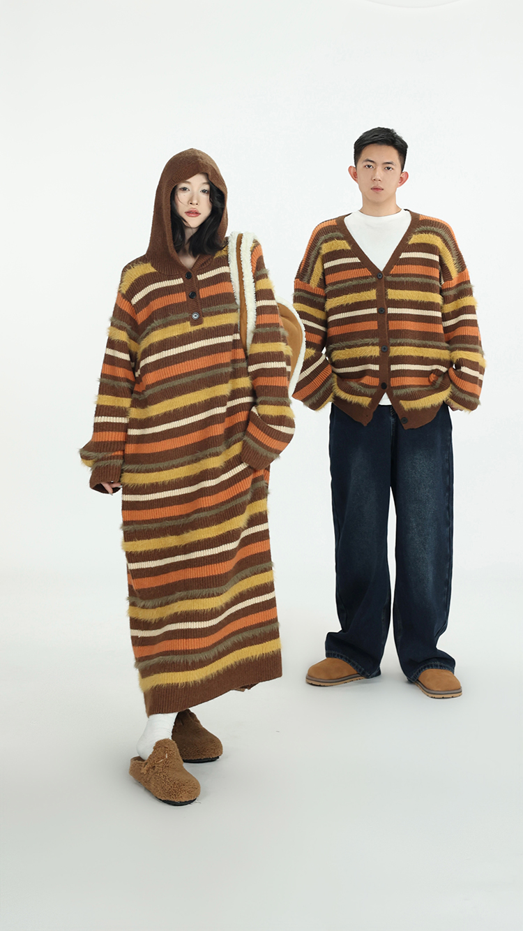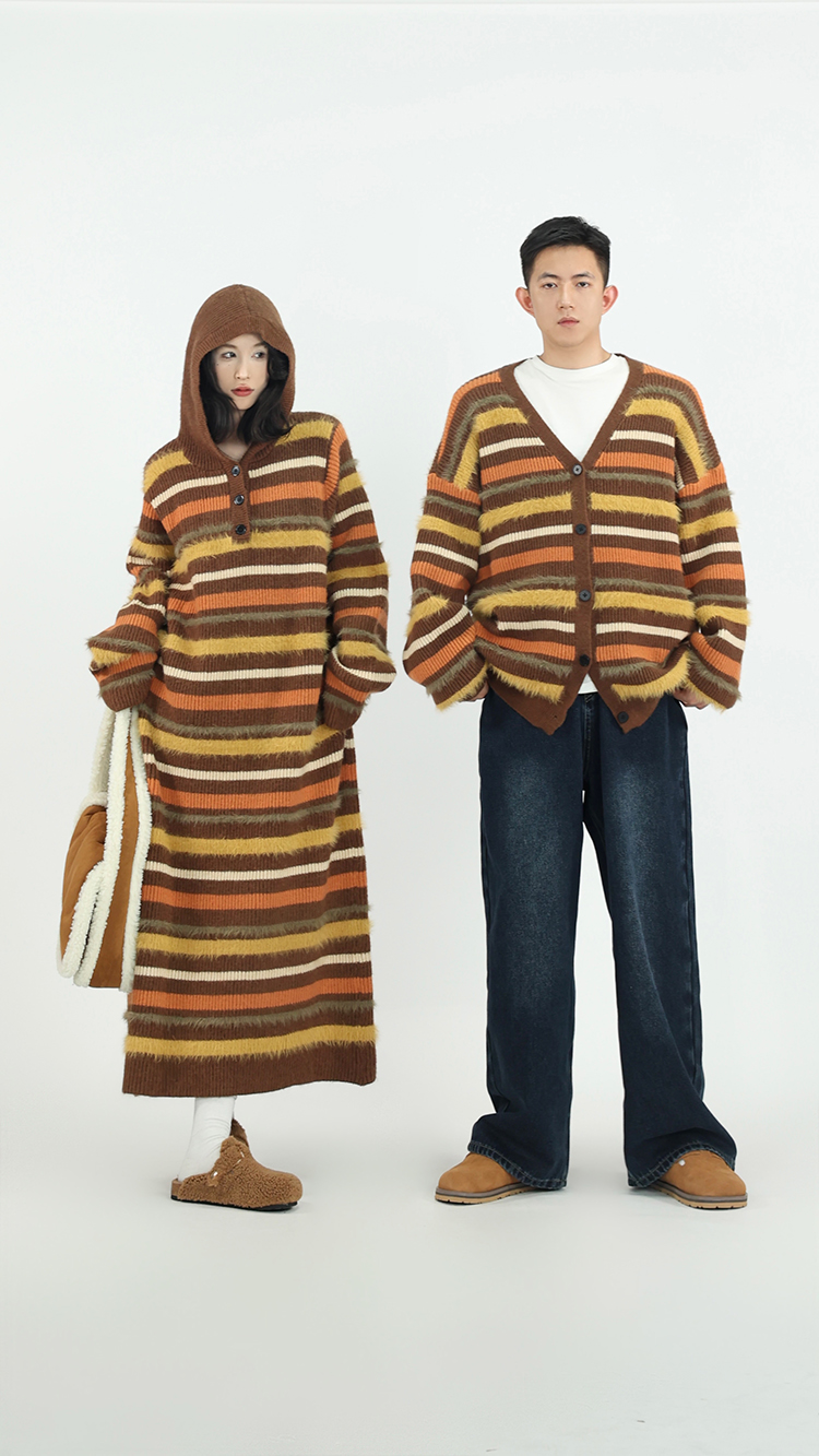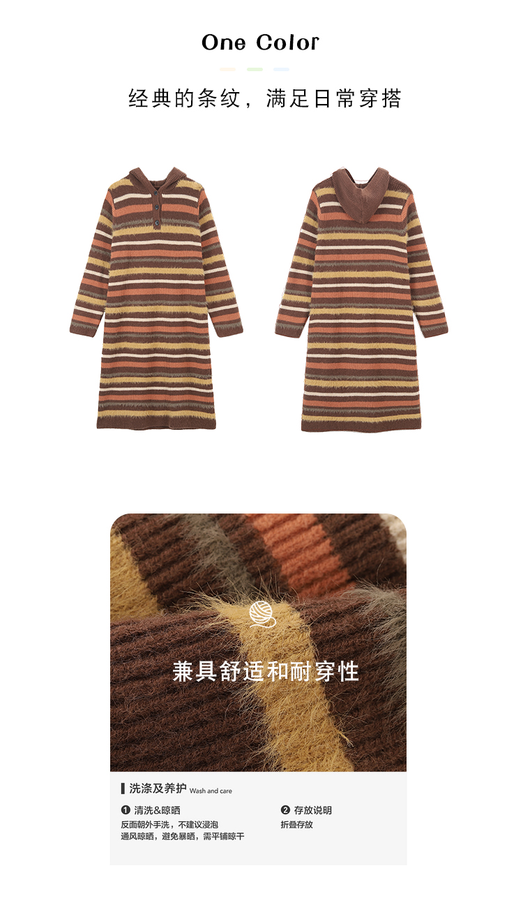 吳童自制 撞色條紋休閒上衣連帽洋裝女秋冬韓系直筒寬鬆長版毛衣裙