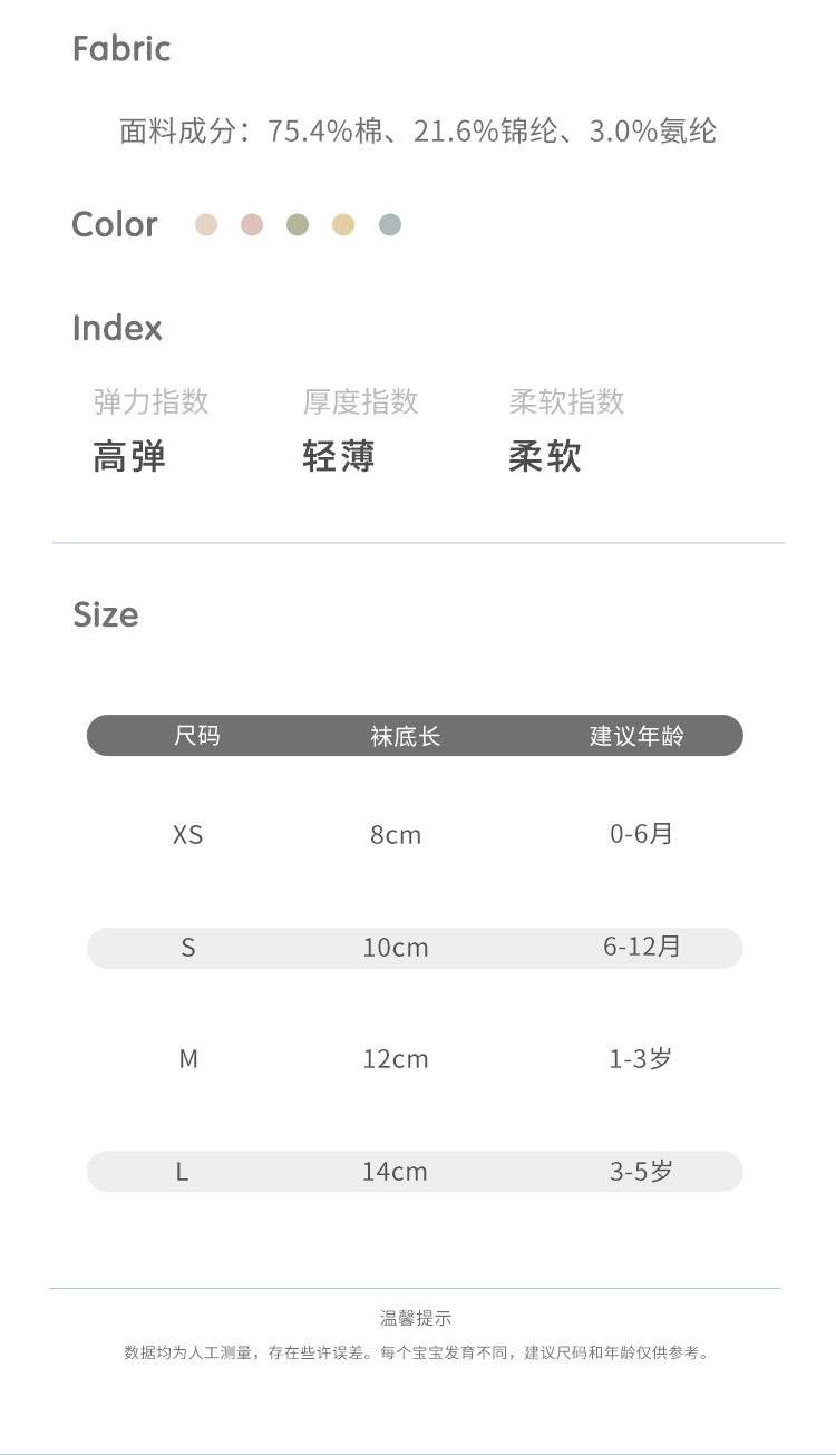 童袜尺码 XS码0-6个月,S码6-12个月,M码1-3岁,L码3-5岁