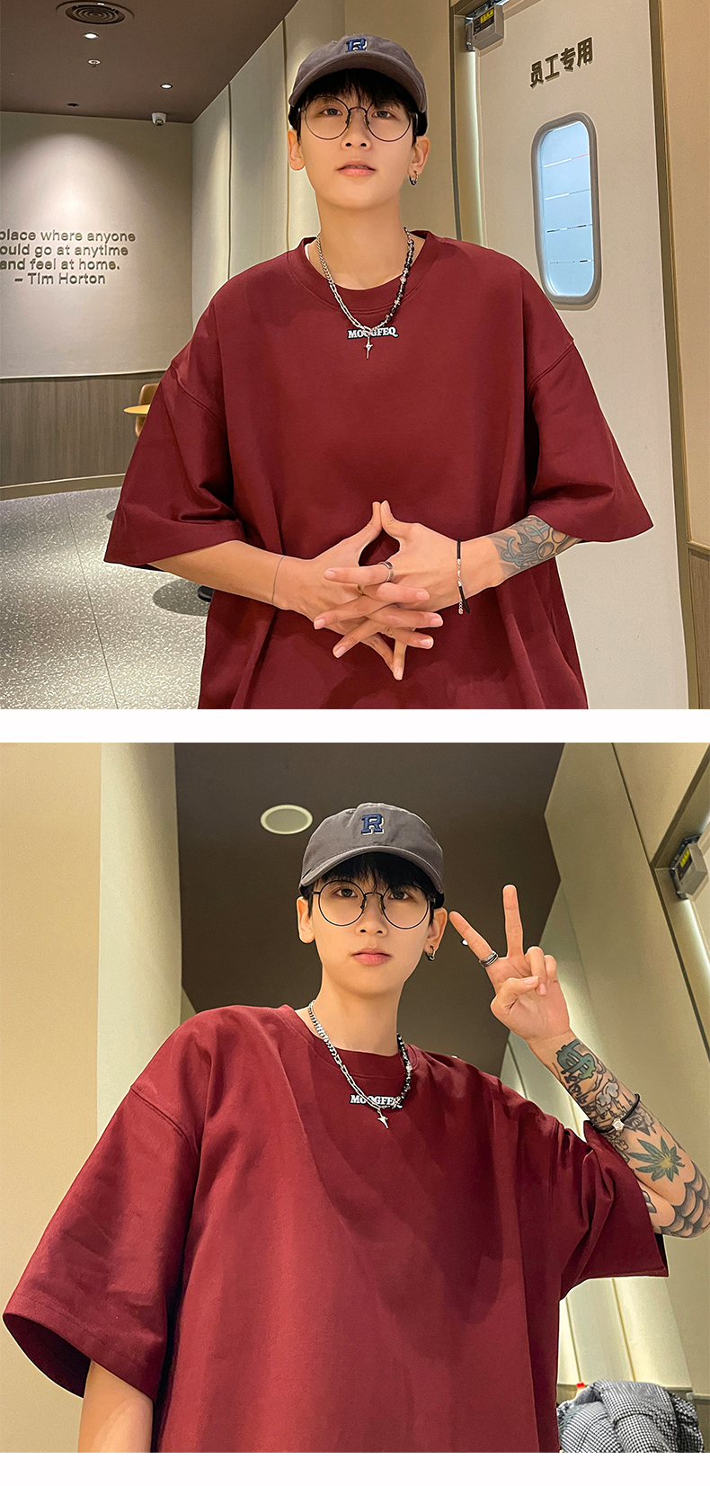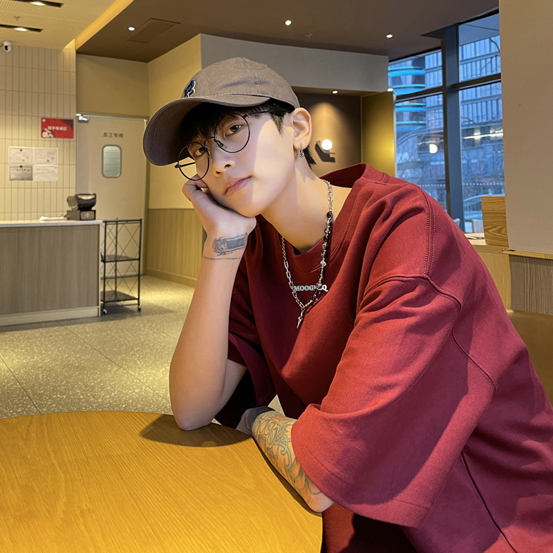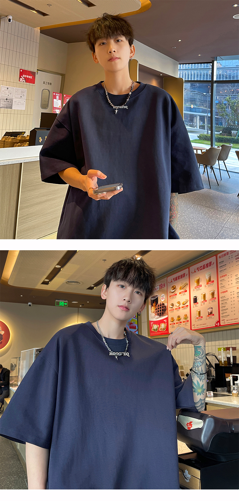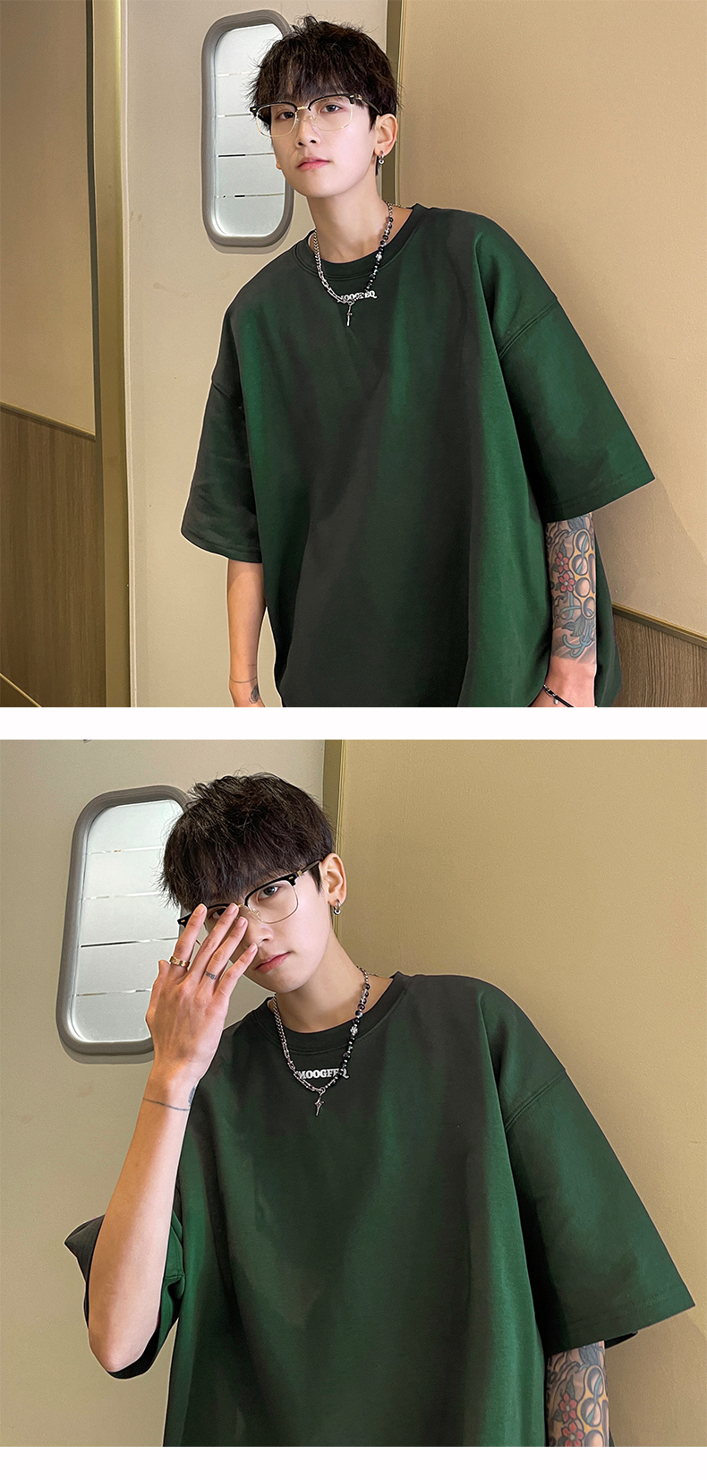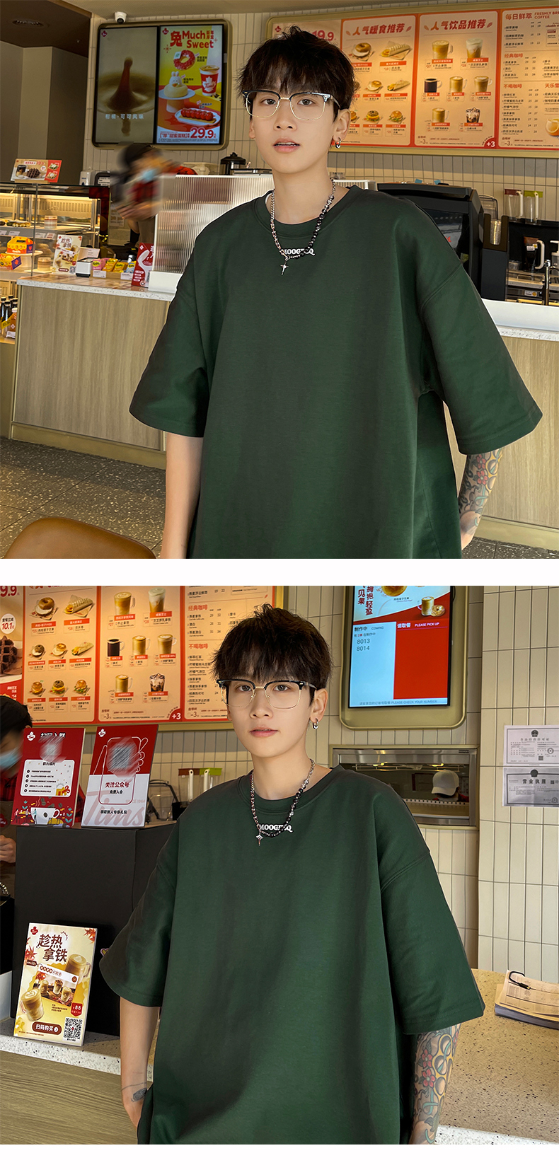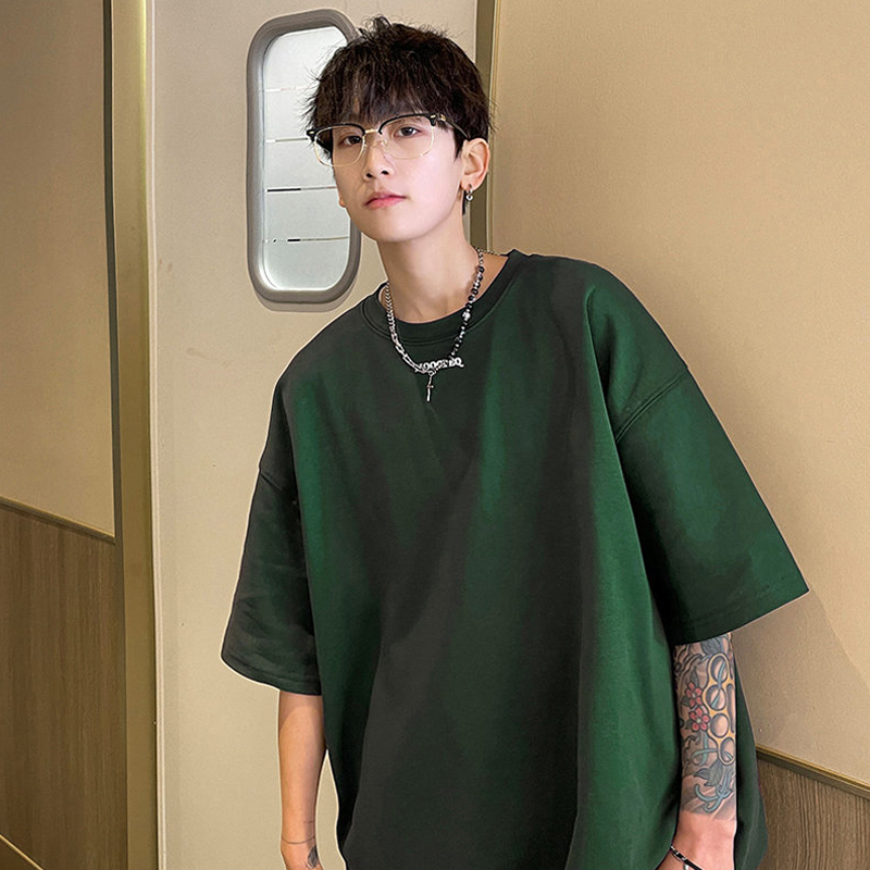 墨綠色300克純棉重磅高克重T恤男美式復古oversize短袖情侶七分袖