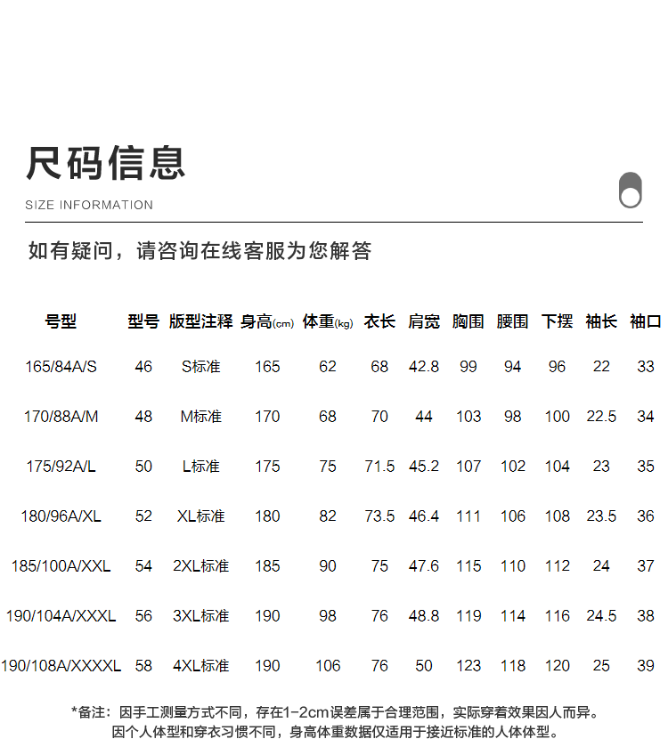 尺碼 165/84A/S,170/88A/M,175/92A/L,180/96A/XL,185/100A/XXL,190/104A/XXXL