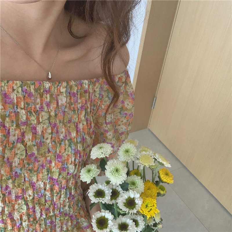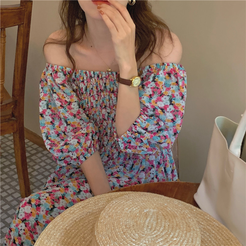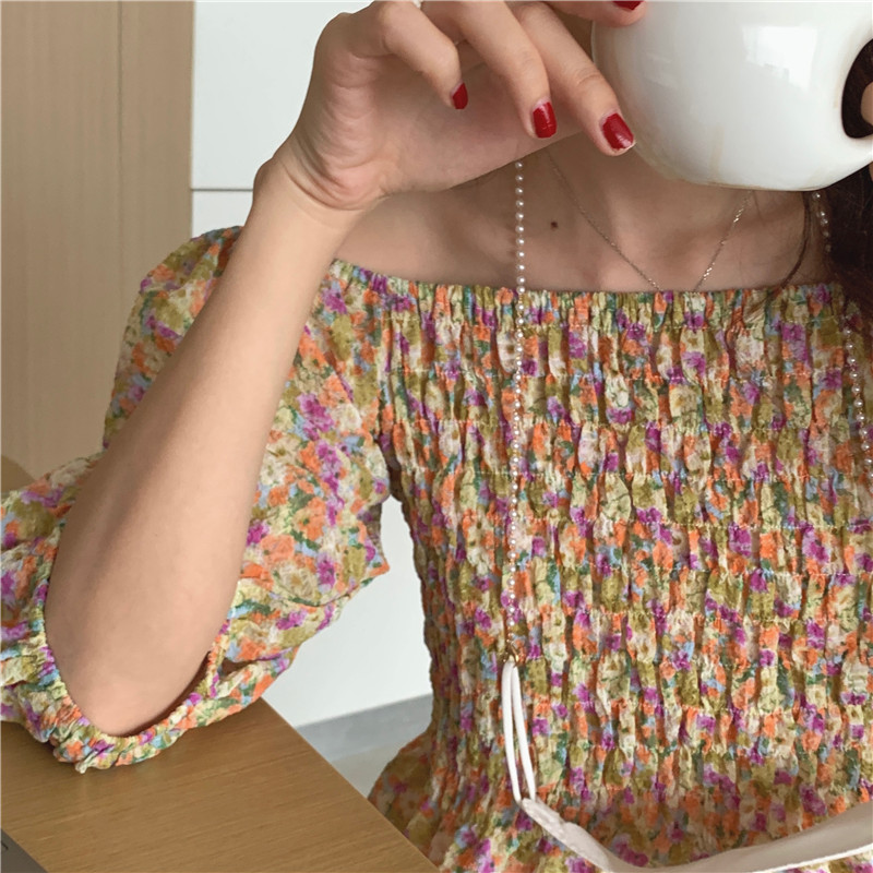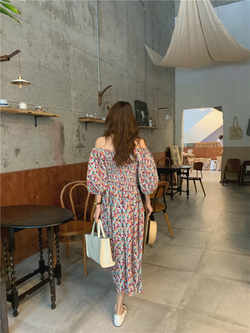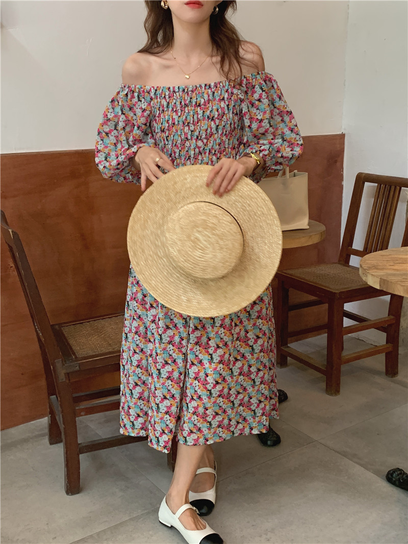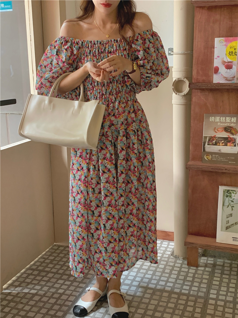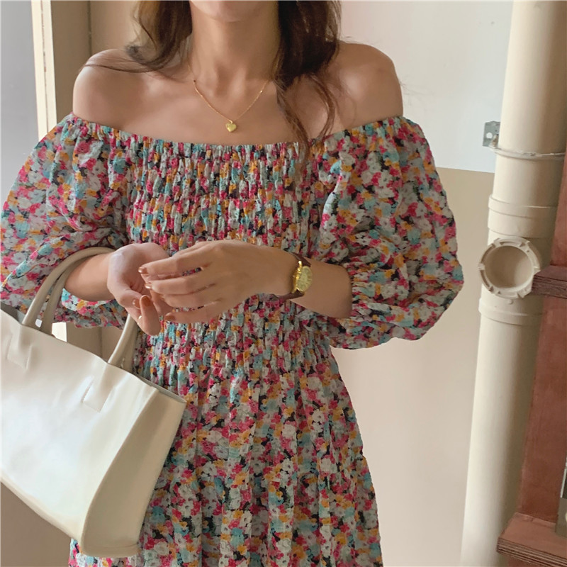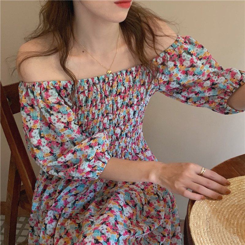 韩国chic夏季法式宫廷风一字领露肩两穿满屏碎花收腰泡泡袖连衣裙