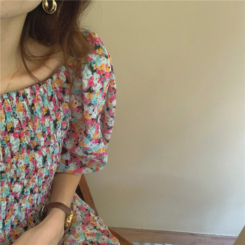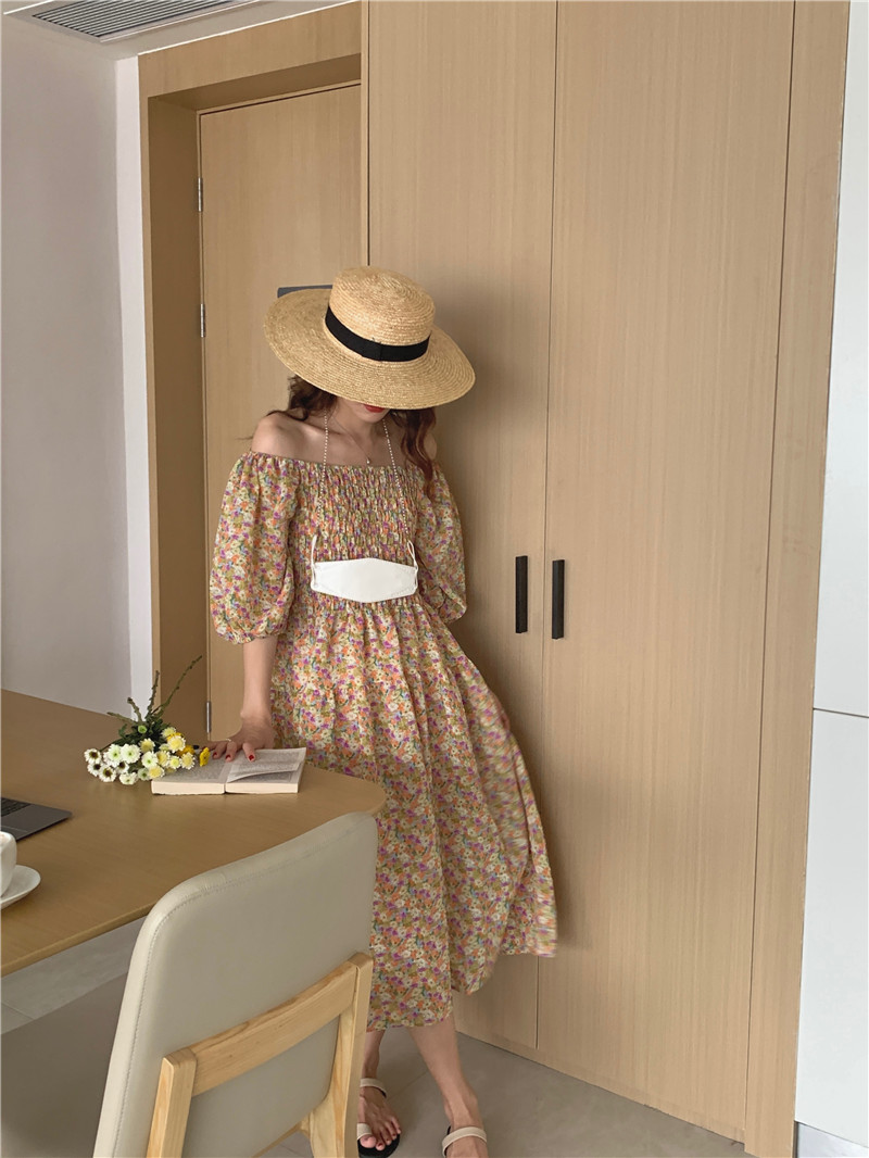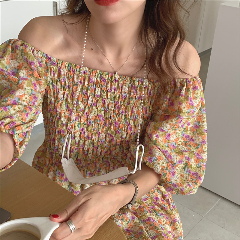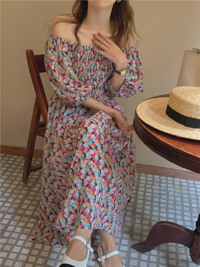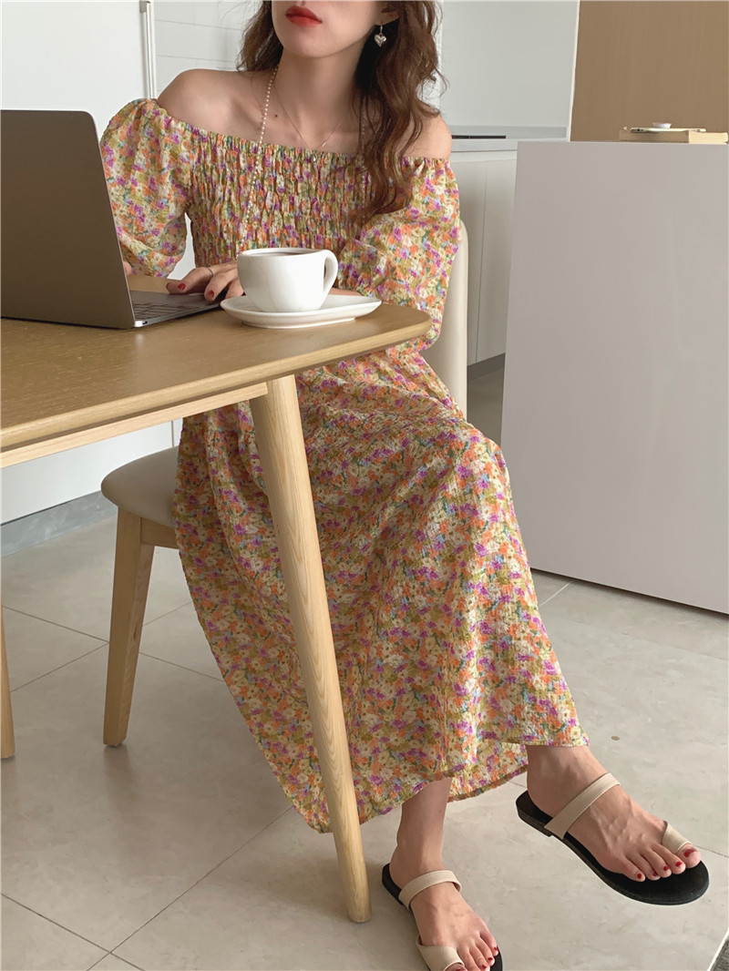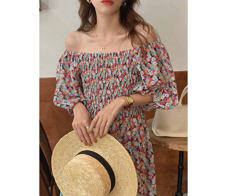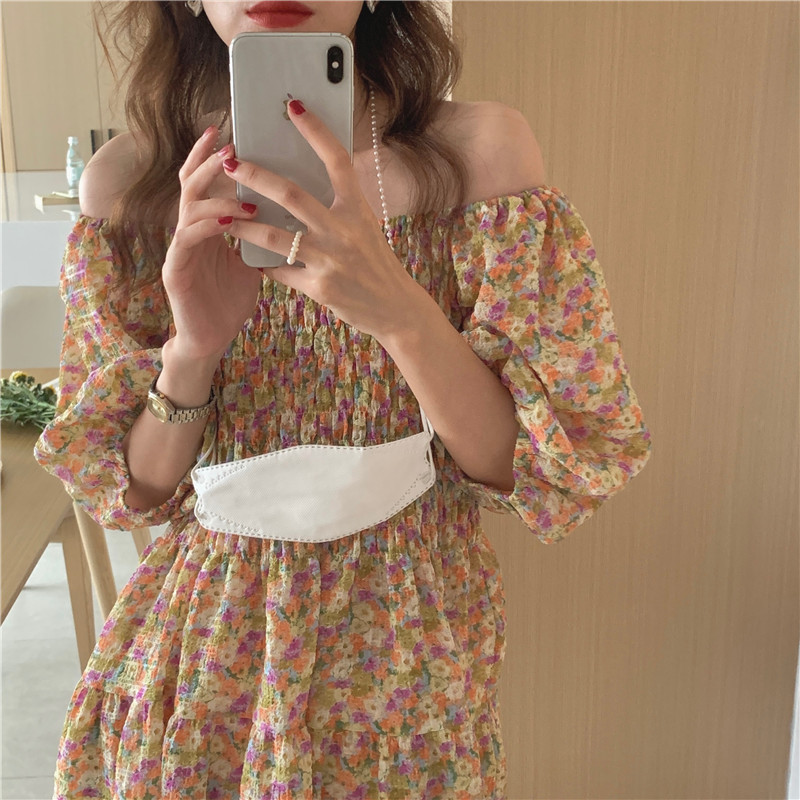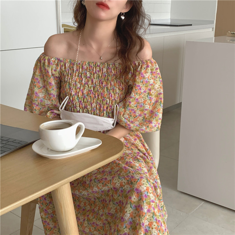 韩国chic夏季法式宫廷风一字领露肩两穿满屏碎花收腰泡泡袖连衣裙