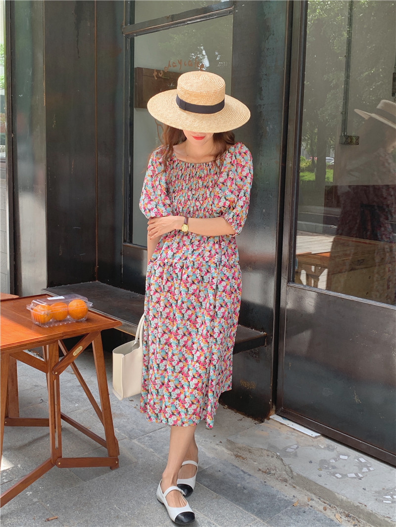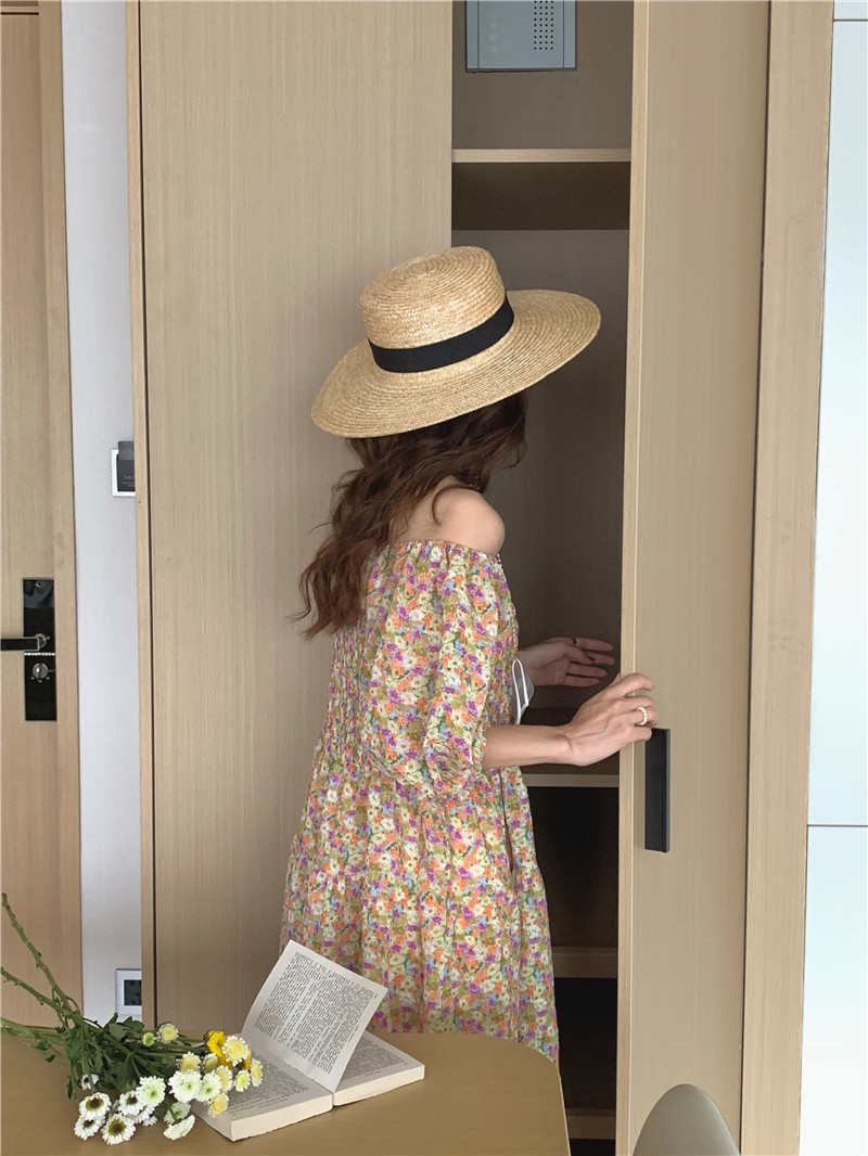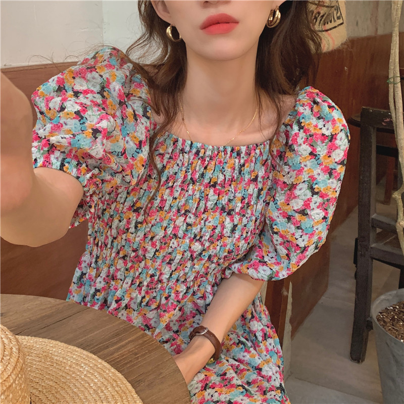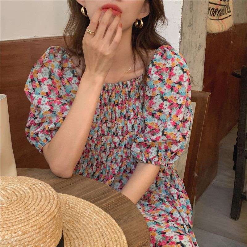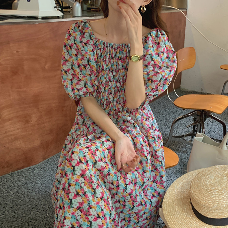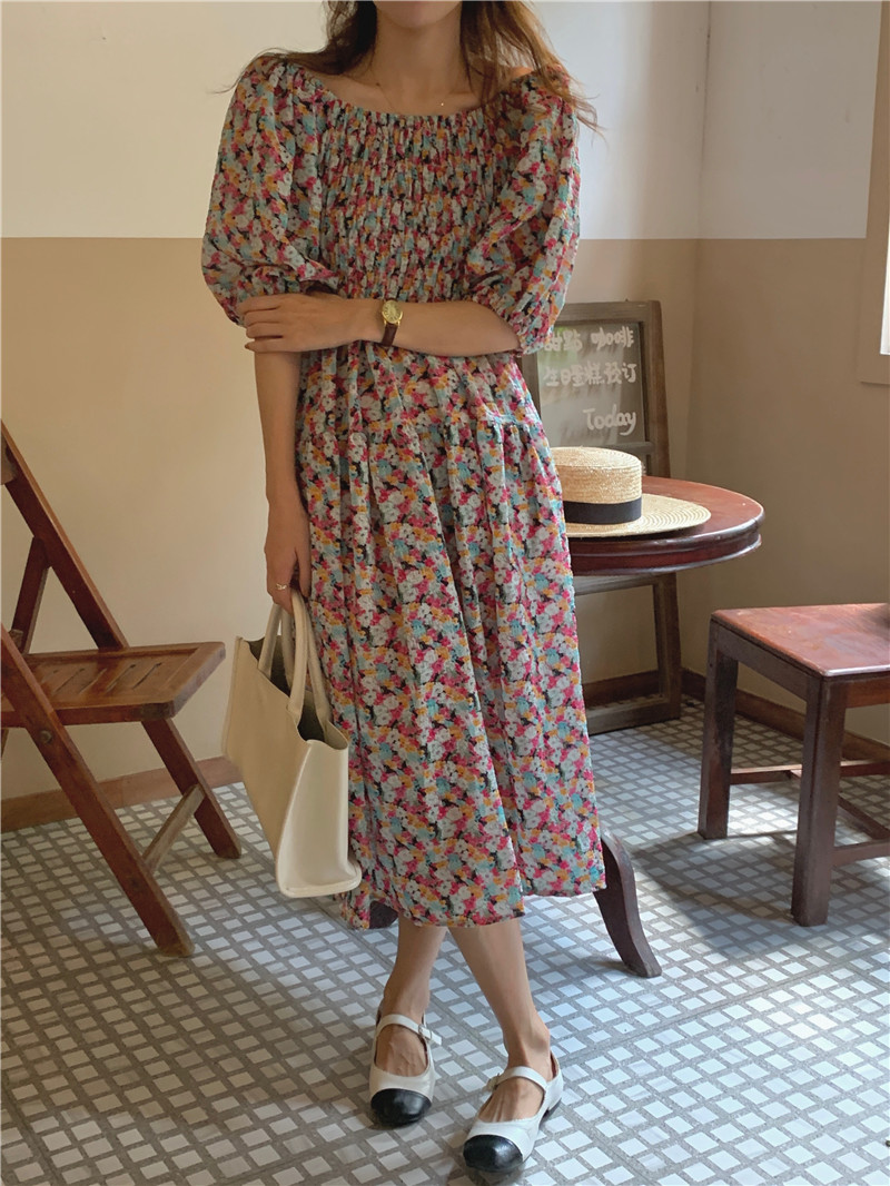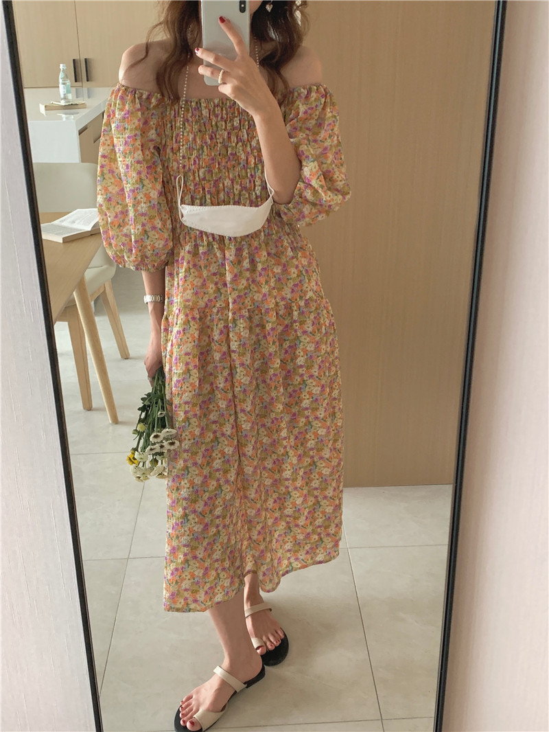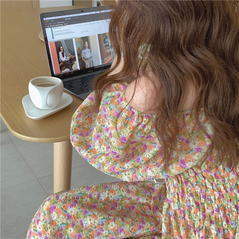 韩国chic夏季法式宫廷风一字领露肩两穿满屏碎花收腰泡泡袖连衣裙