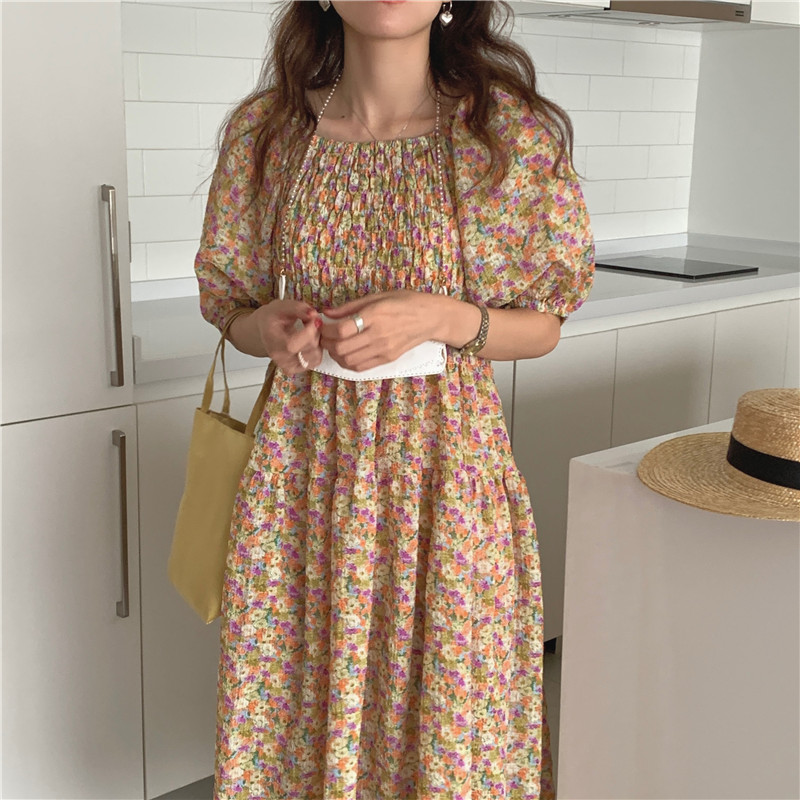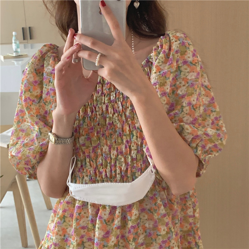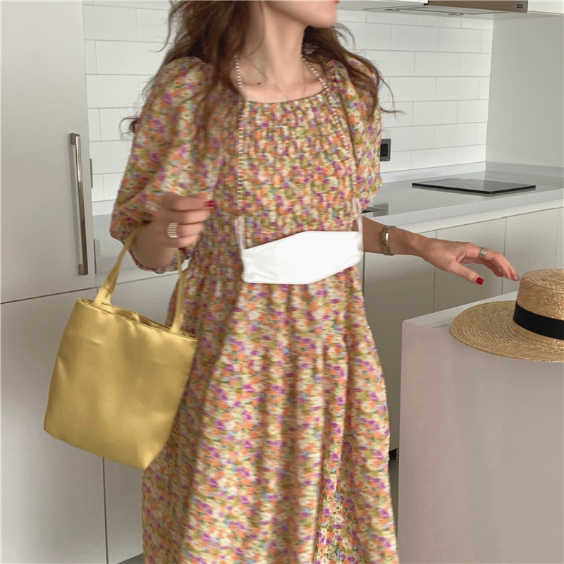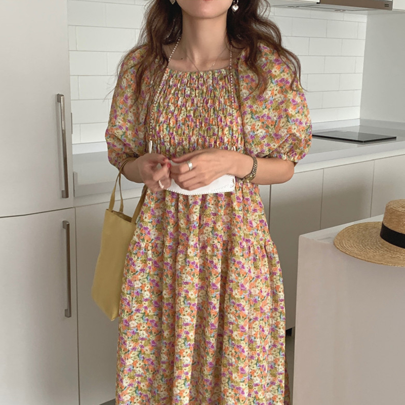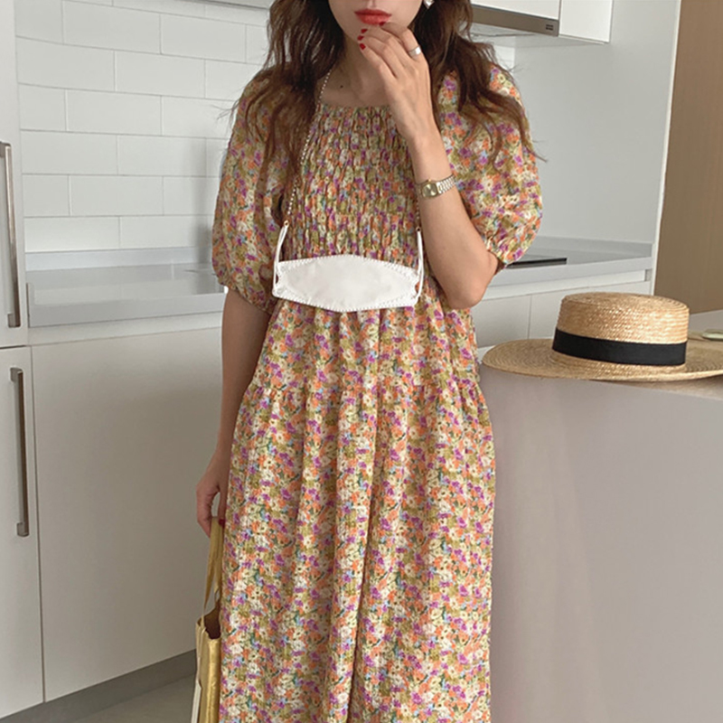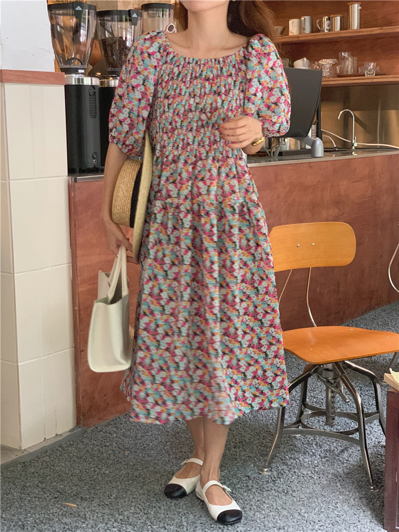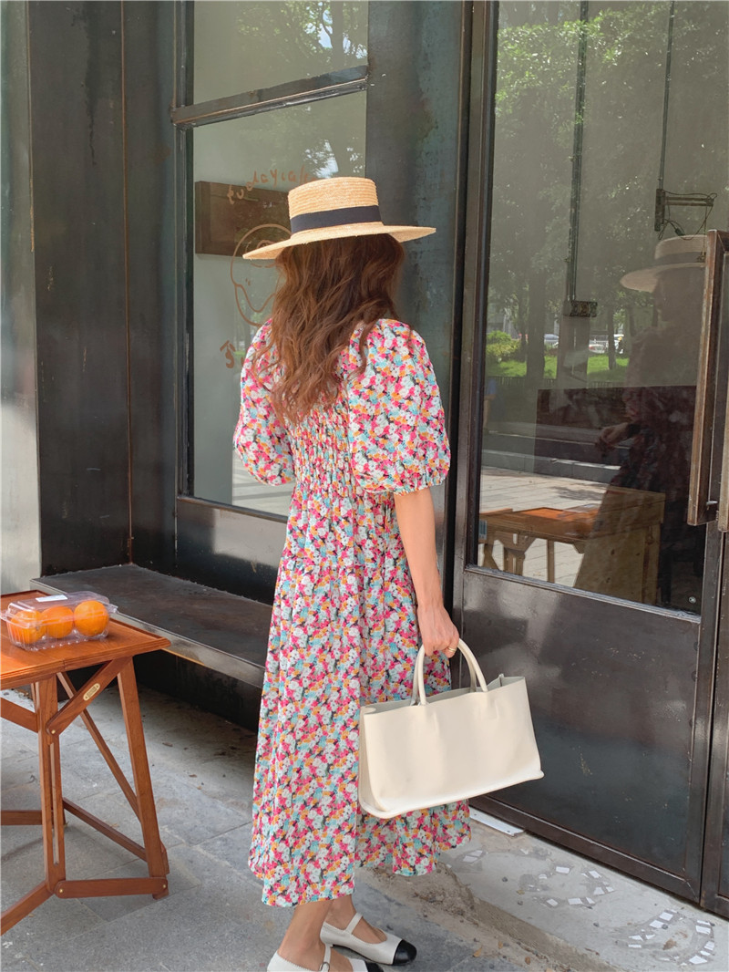 韩国chic夏季法式宫廷风一字领露肩两穿满屏碎花收腰泡泡袖连衣裙