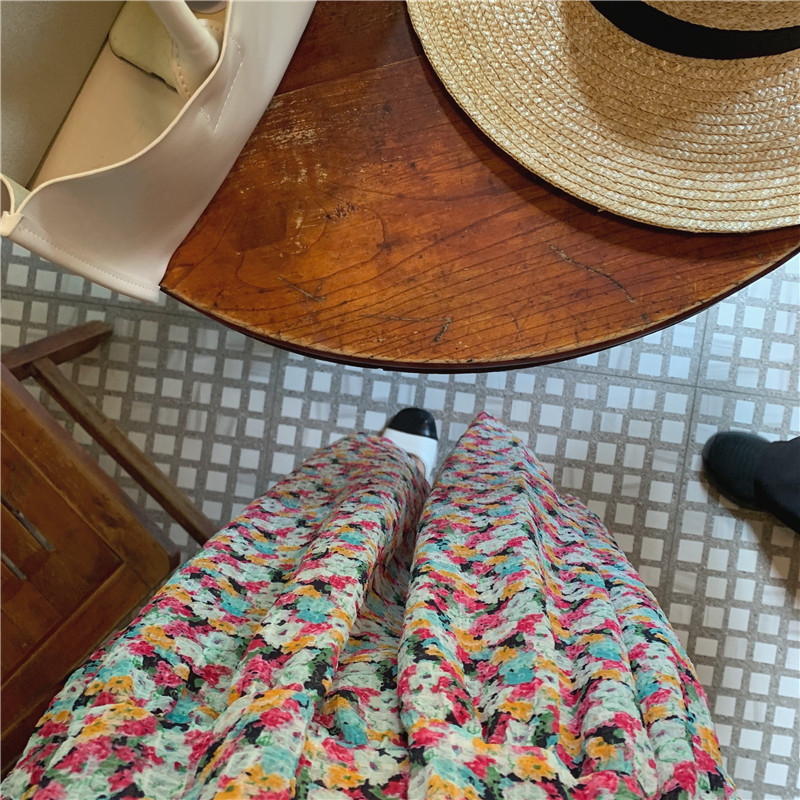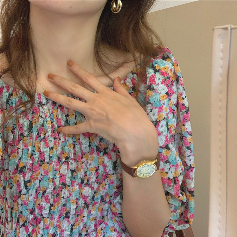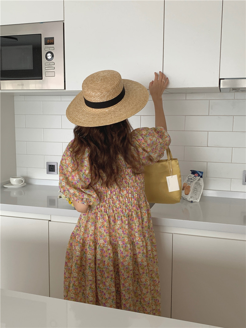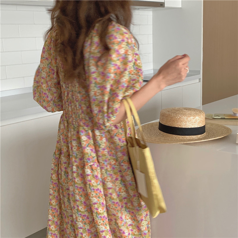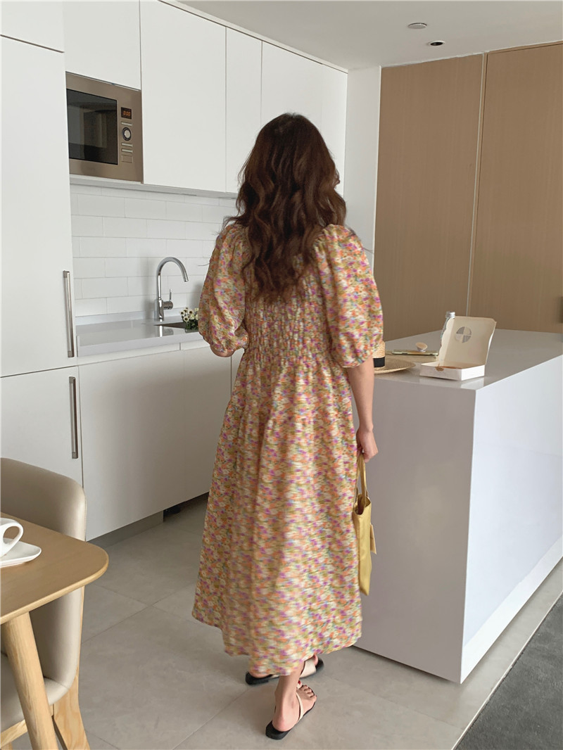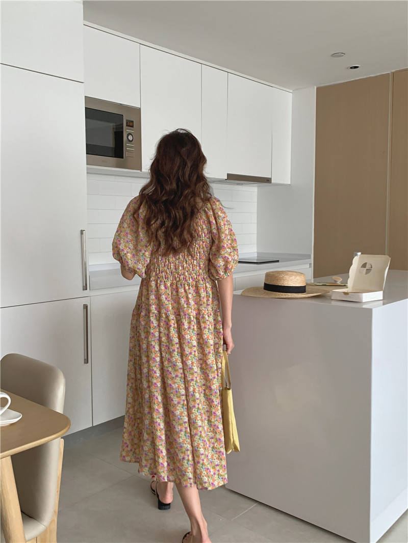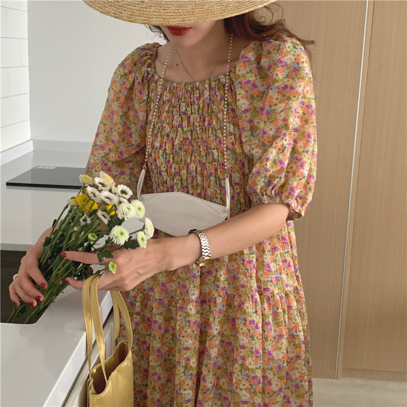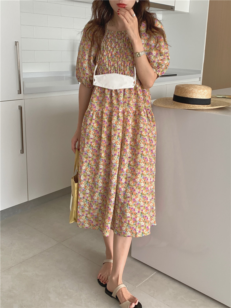 韩国chic夏季法式宫廷风一字领露肩两穿满屏碎花收腰泡泡袖连衣裙