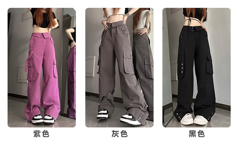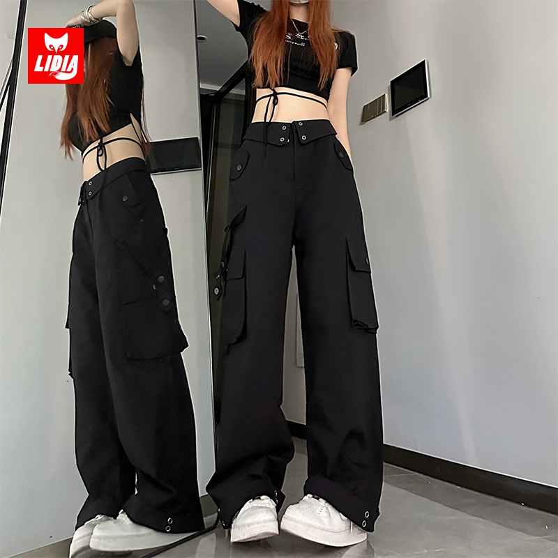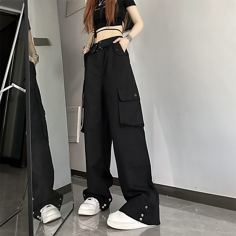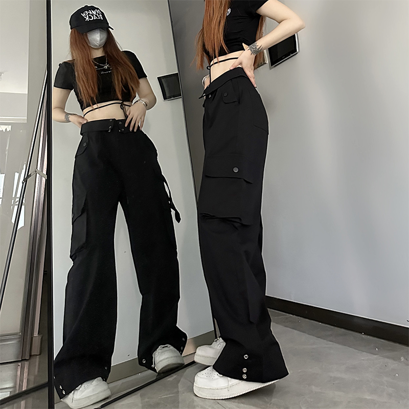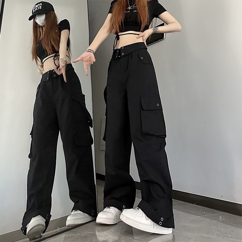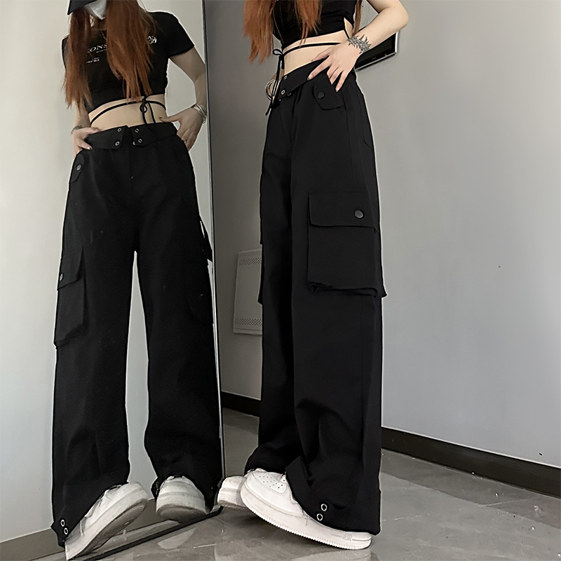 美式黑色工裝褲女夏季薄款多口袋高腰顯瘦闊腿褲垂感直筒休閒褲子