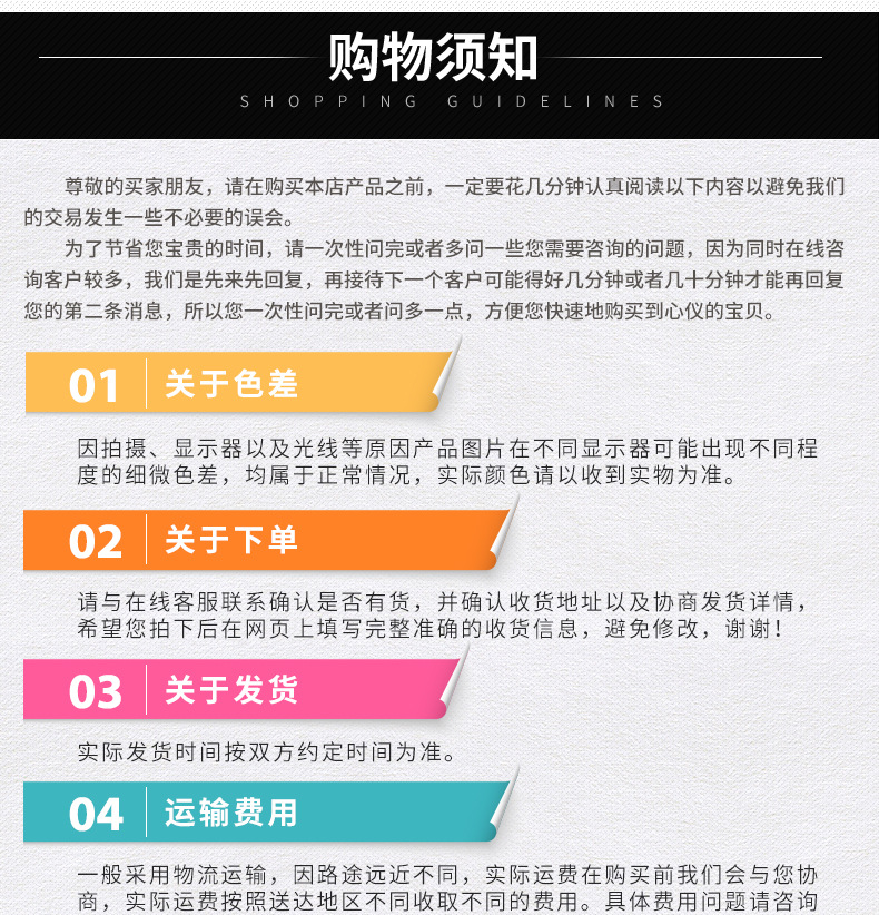 亲爱的顾客,感谢您的关注与支持。为了我们能够更好的沟通和拥有愉快的交易,请购物前多花几分钟看看下面的文字,祝您购物愉快!