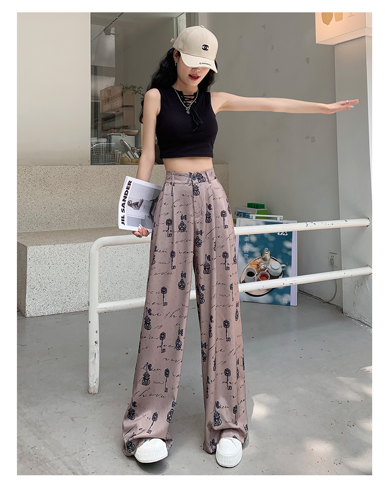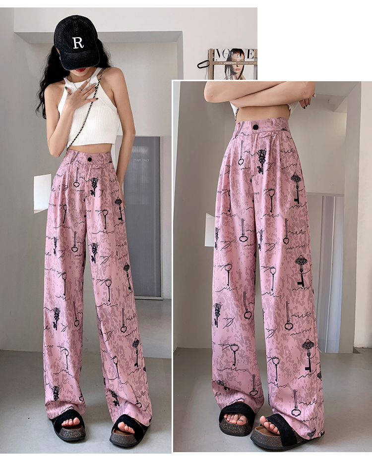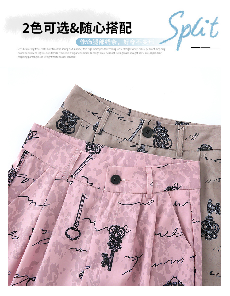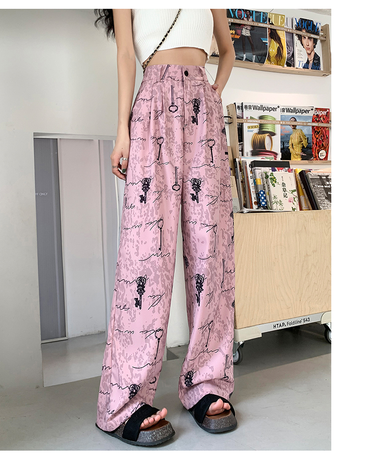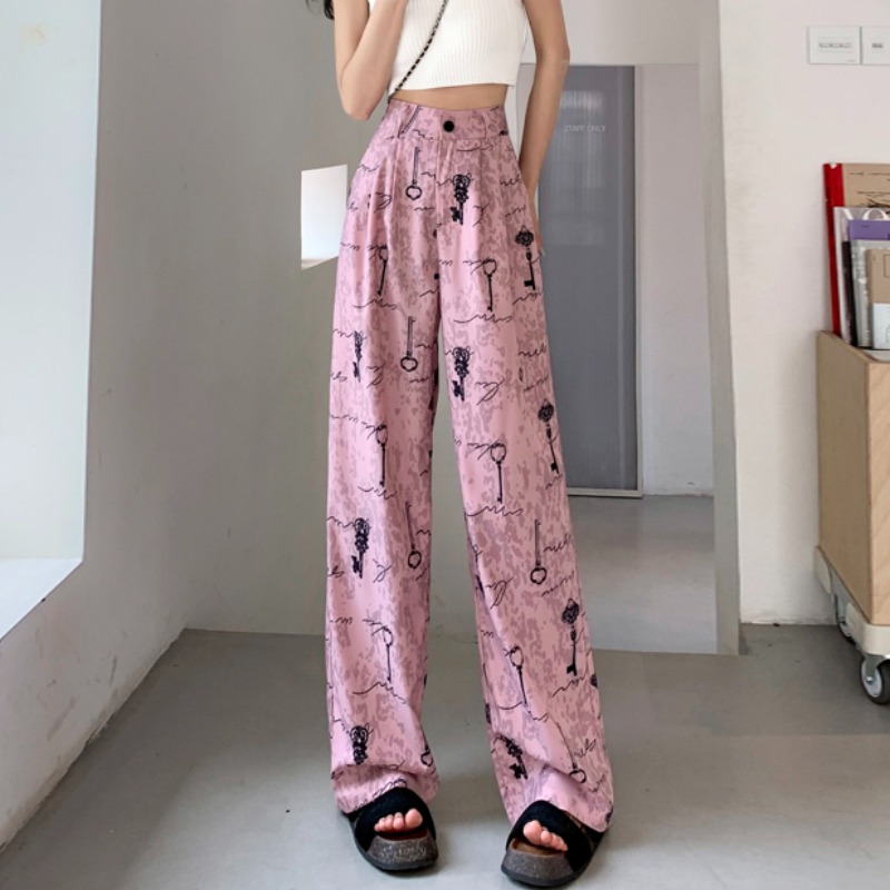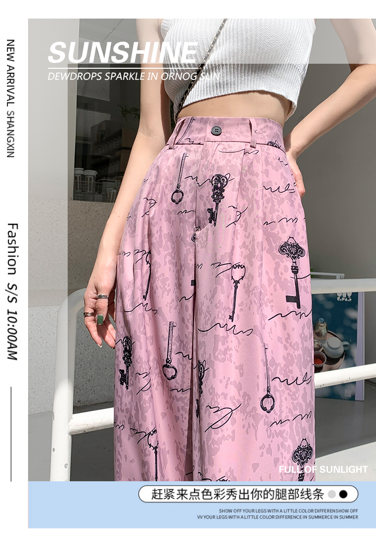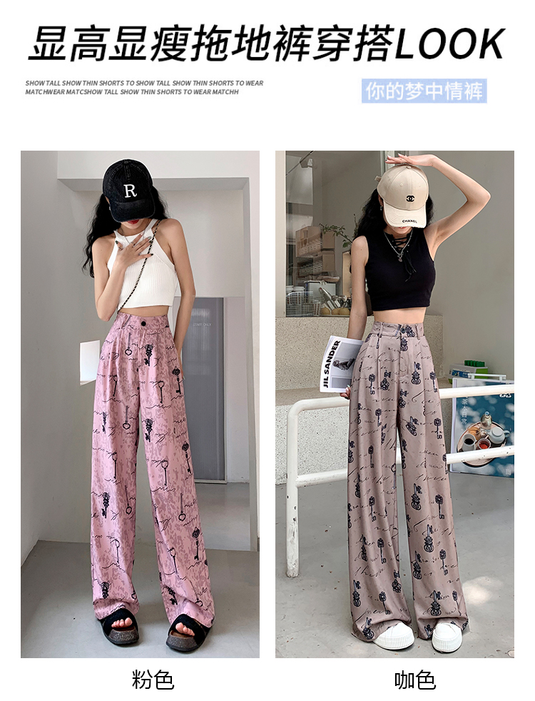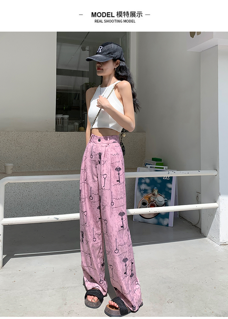 緞面高級感印花西裝休閒褲女夏季冰絲薄款寬鬆直筒寬褲粉色褲子