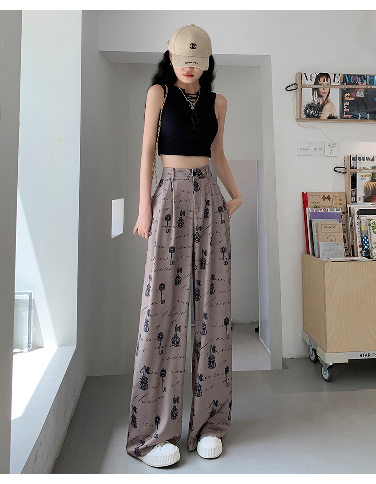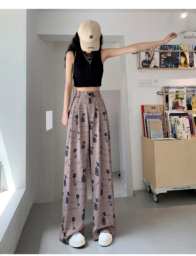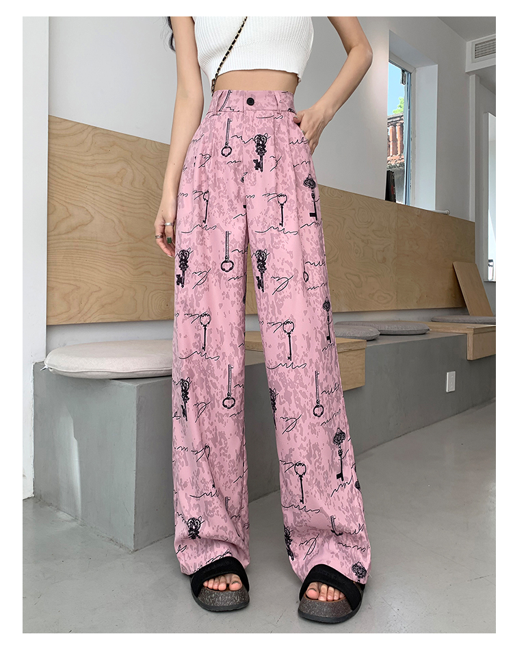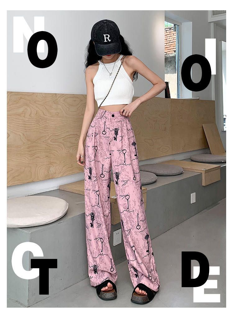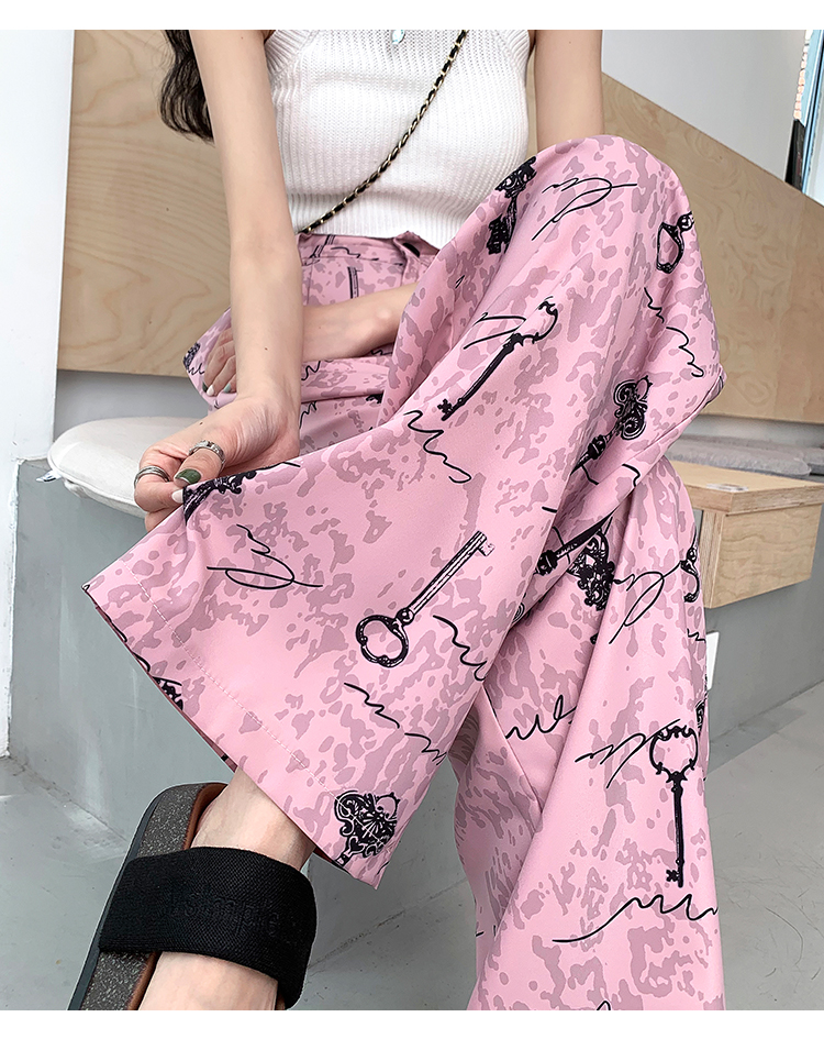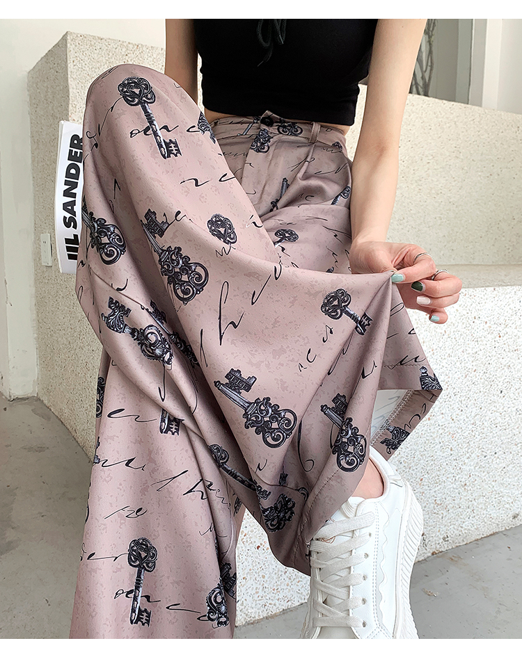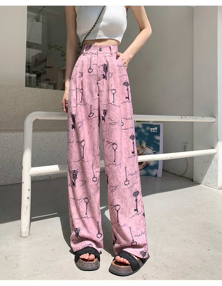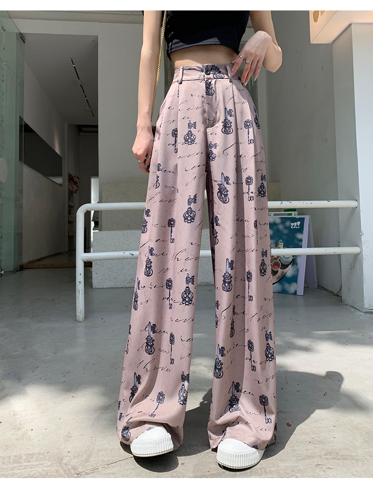 緞面高級感印花西裝休閒褲女夏季冰絲薄款寬鬆直筒寬褲粉色褲子