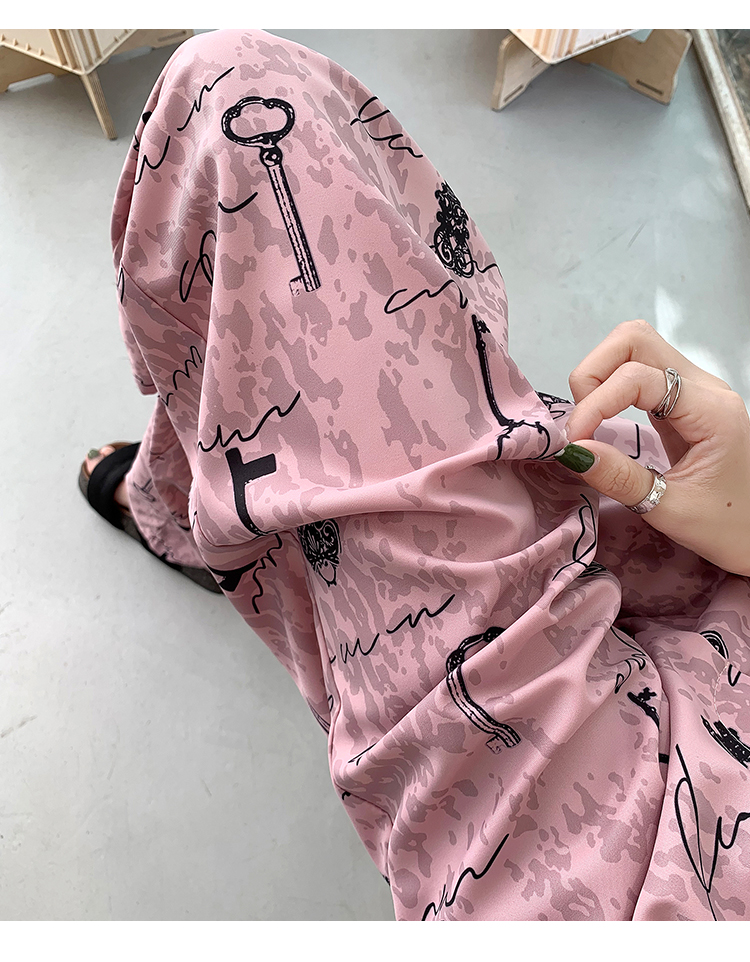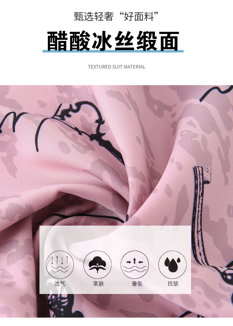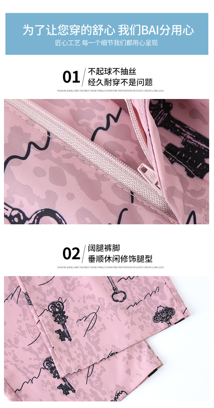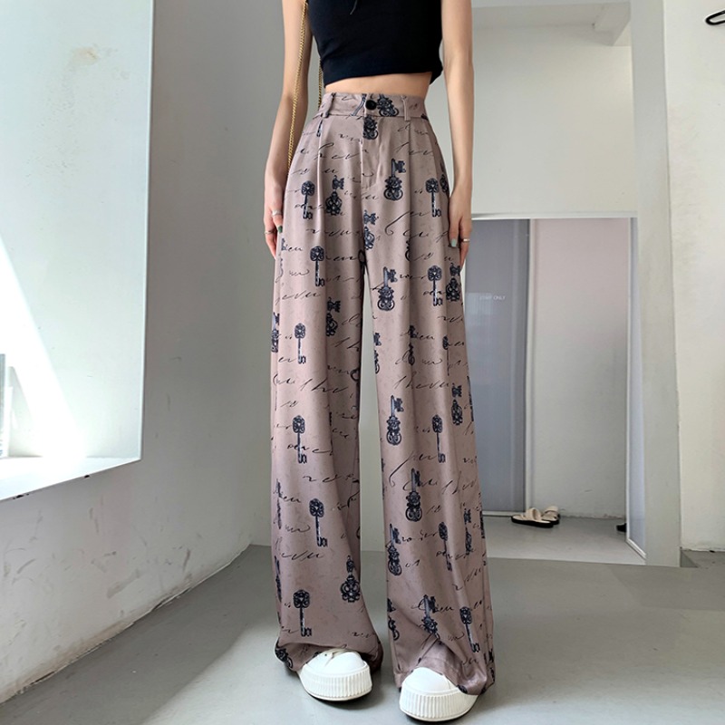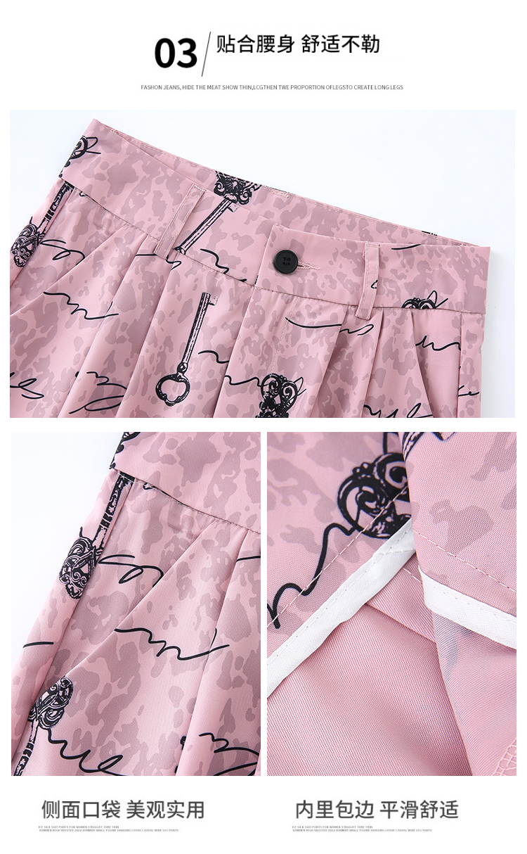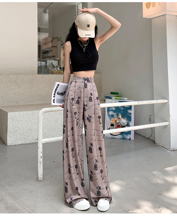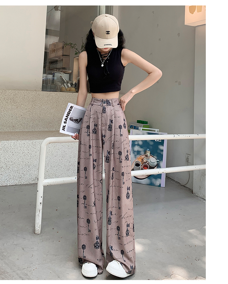 緞面高級感印花西裝休閒褲女夏季冰絲薄款寬鬆直筒寬褲粉色褲子