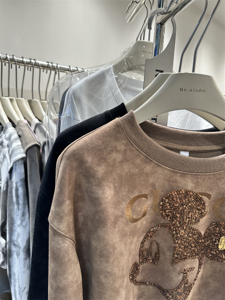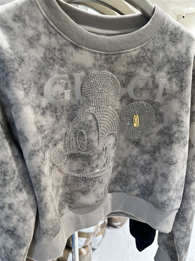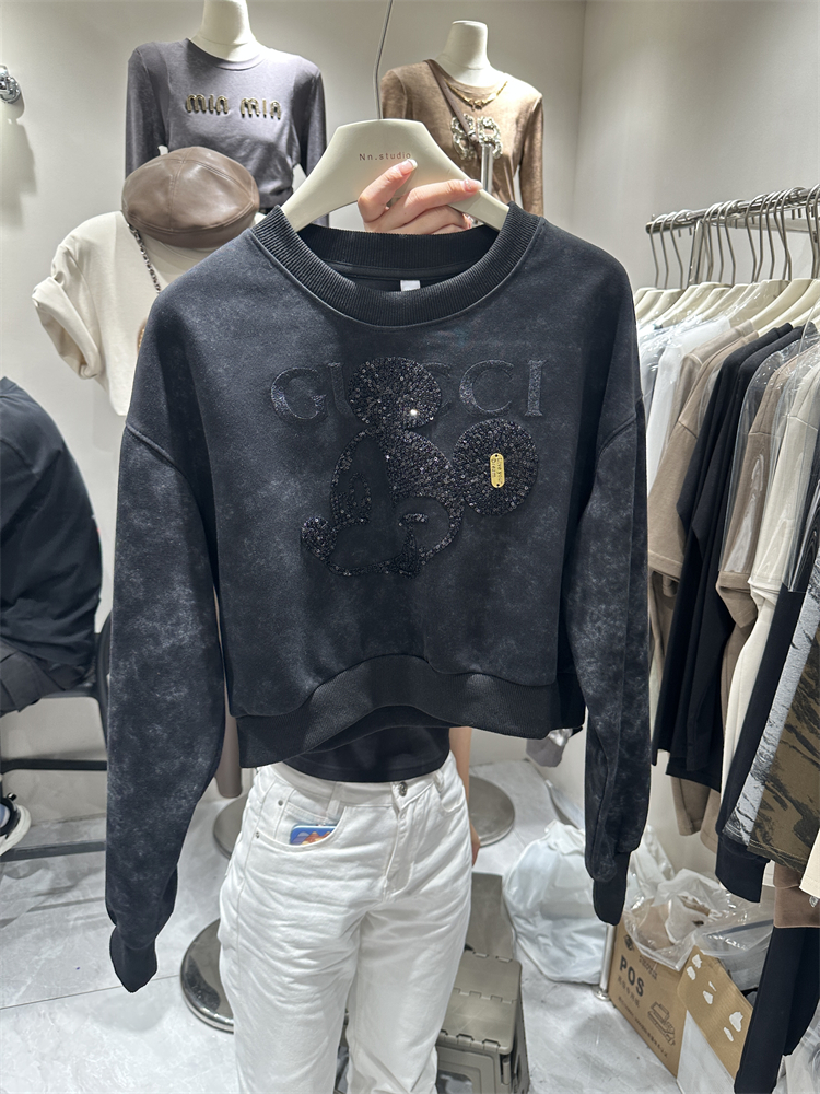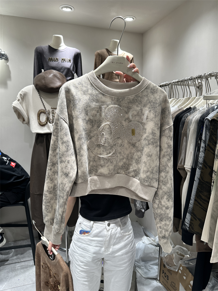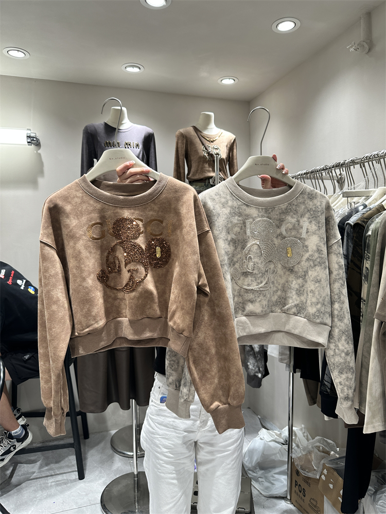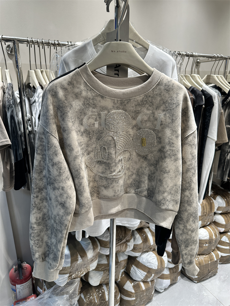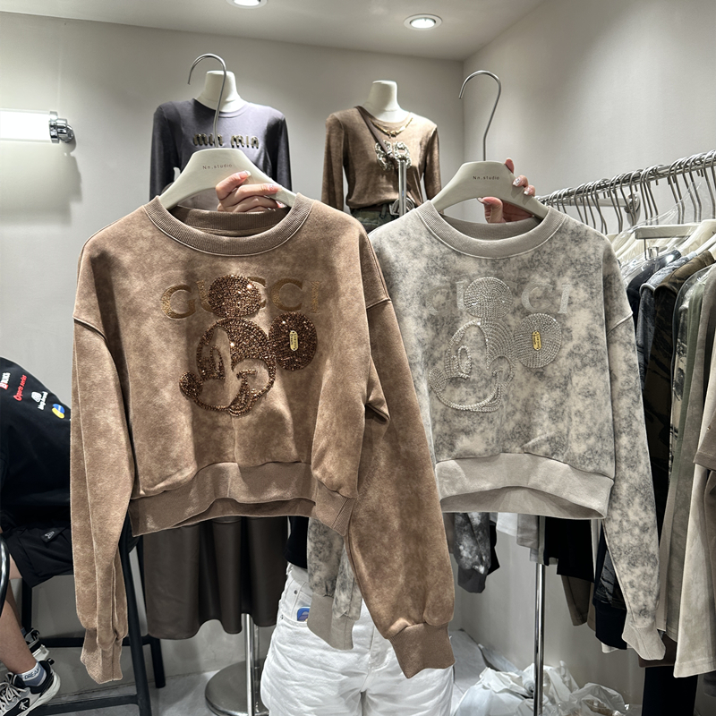2023秋季新款女裝刺繡米奇重工設計感長袖套頭薄寬鬆短版衛衣外套