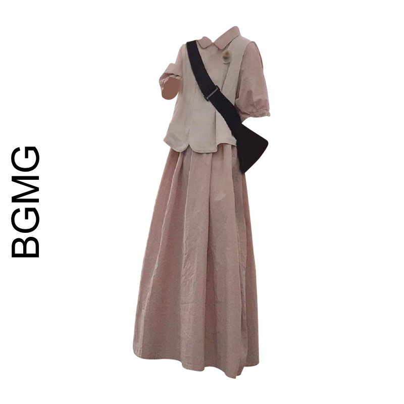 日系田園風繫帶蝴蝶結襯衫領寬鬆洋裝+立體花朵短馬甲兩件式套裝