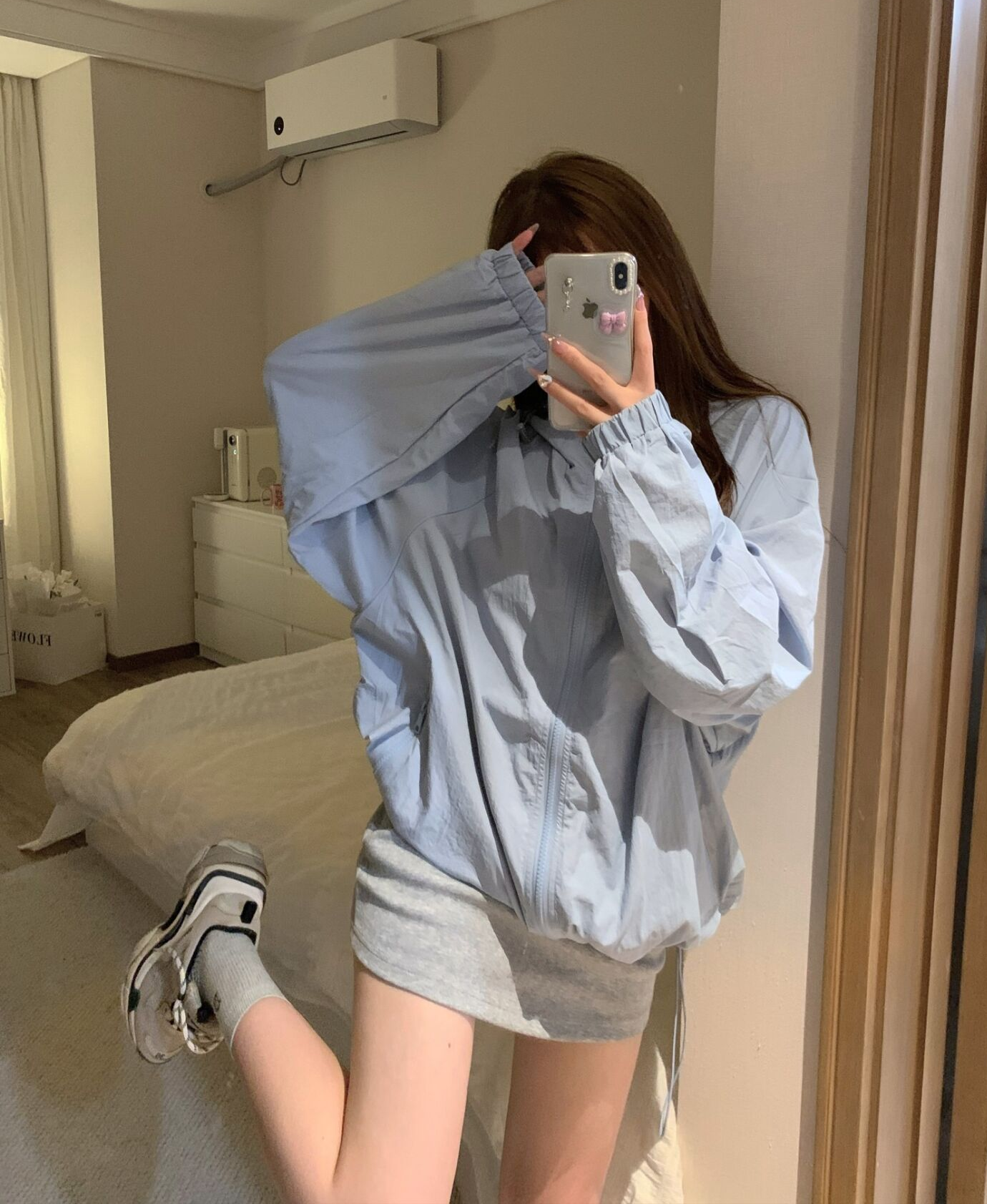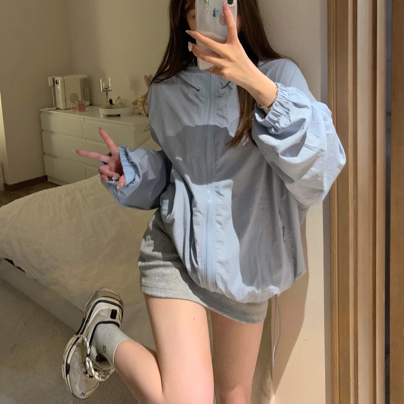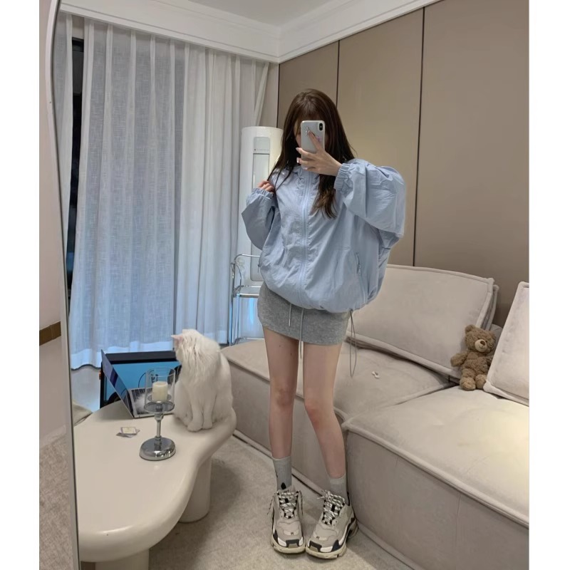 韓版藍色拉鍊連帽衝鋒衣外套女夏季寬鬆薄款透氣防曬百搭休閒上衣