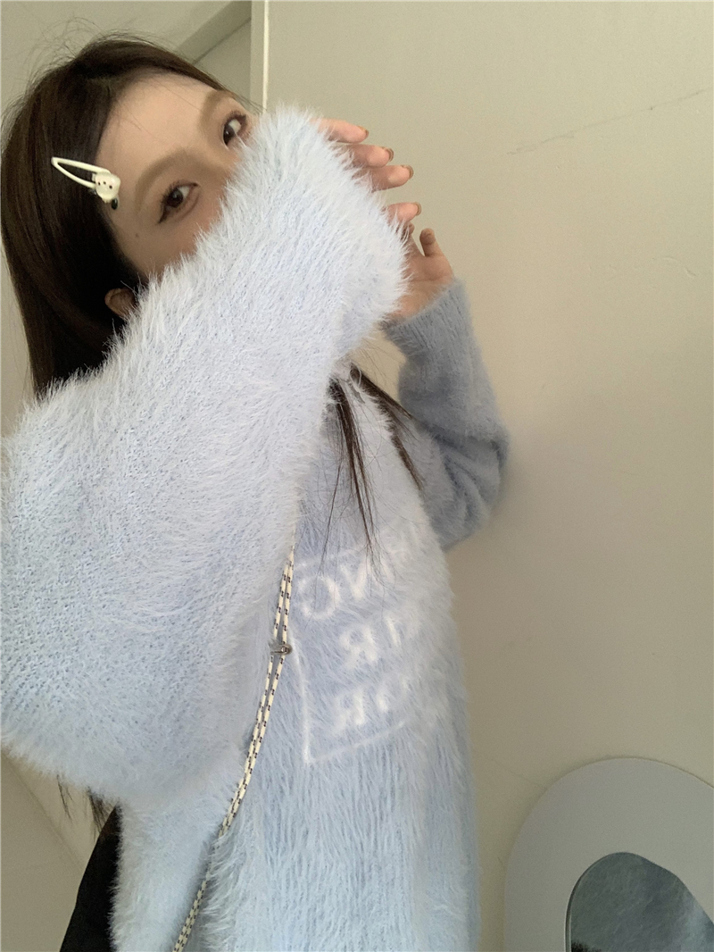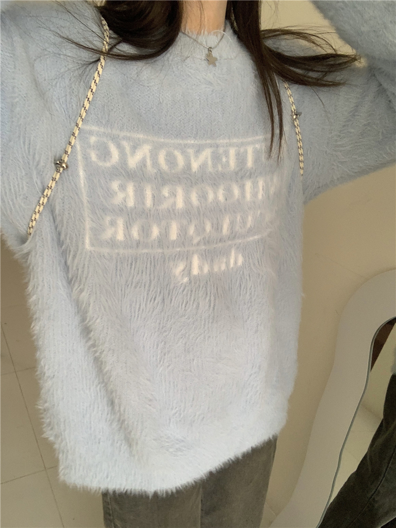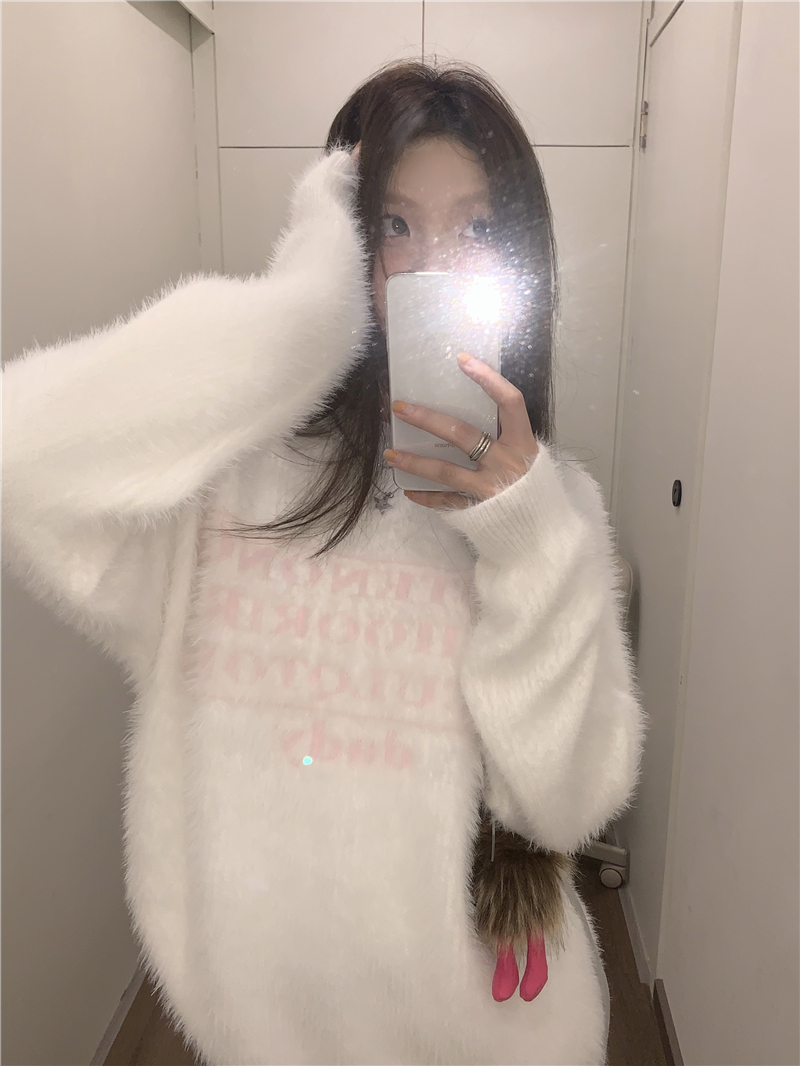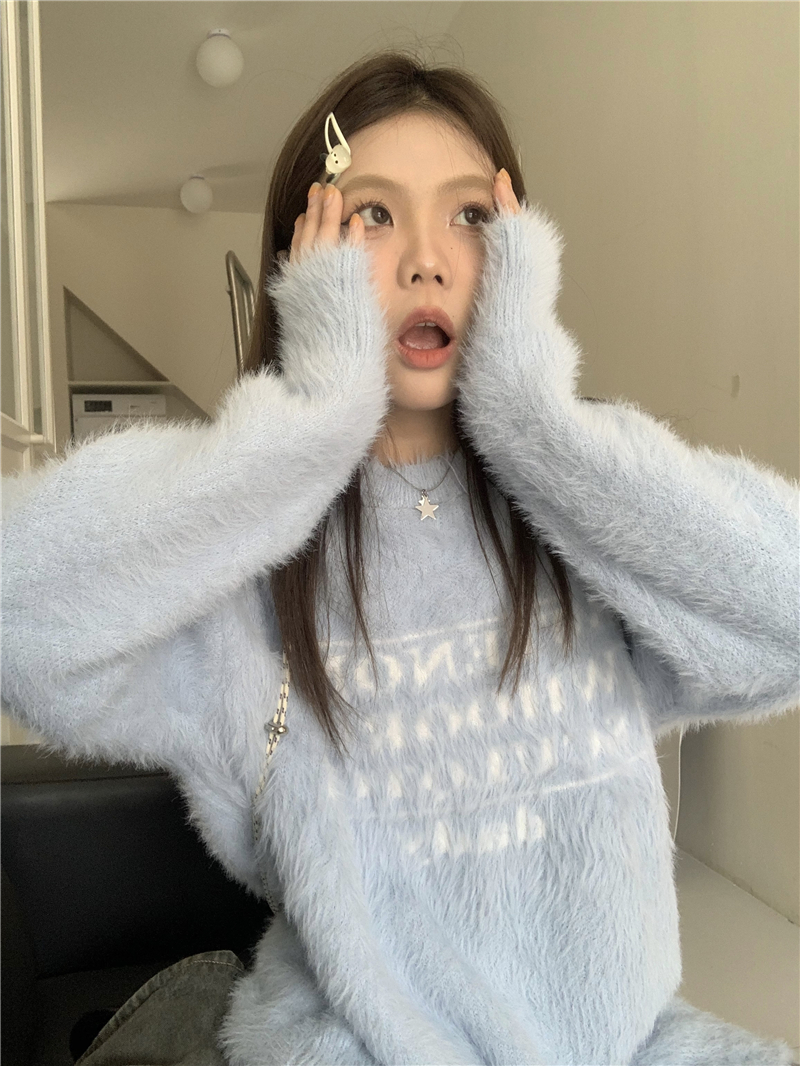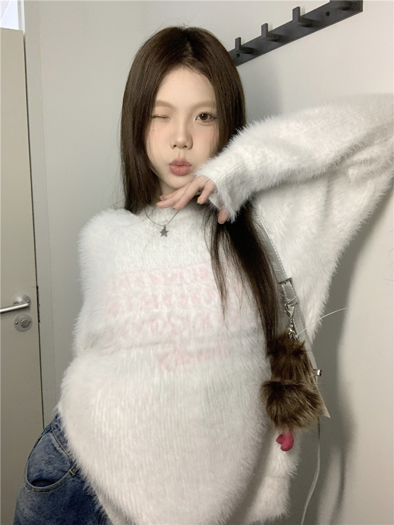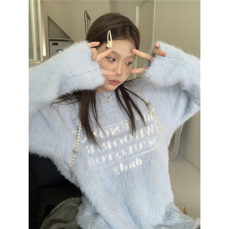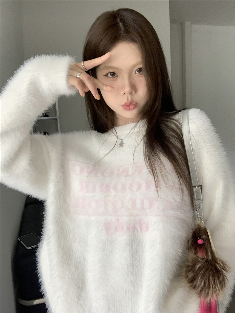 軟糯糯奶呼呼毛衣女秋冬2023新款仿貂絨加厚寬鬆字母長袖針織上衣