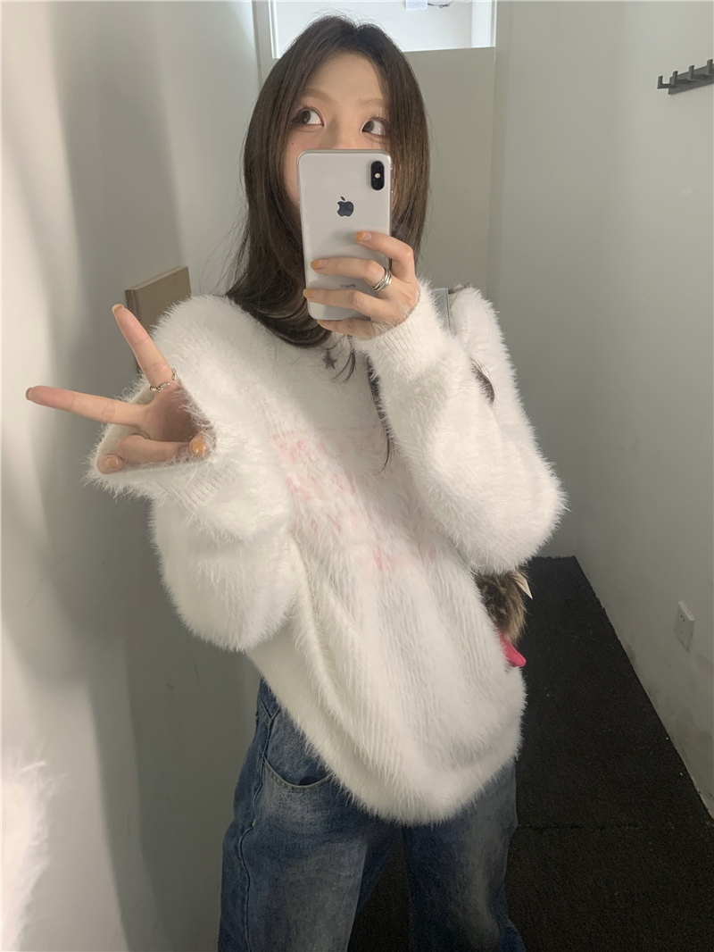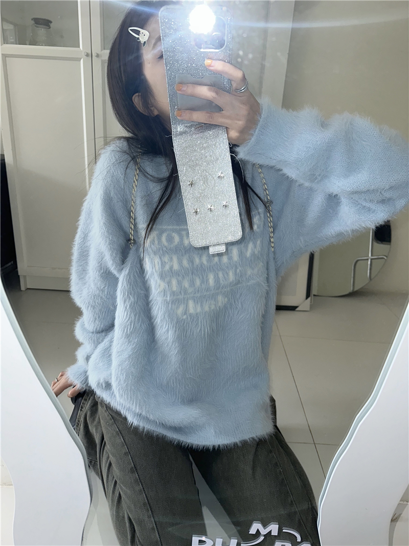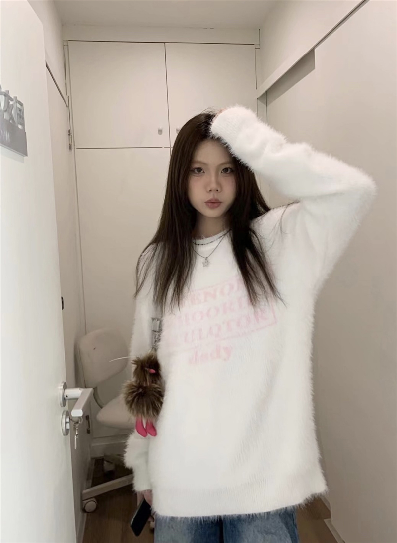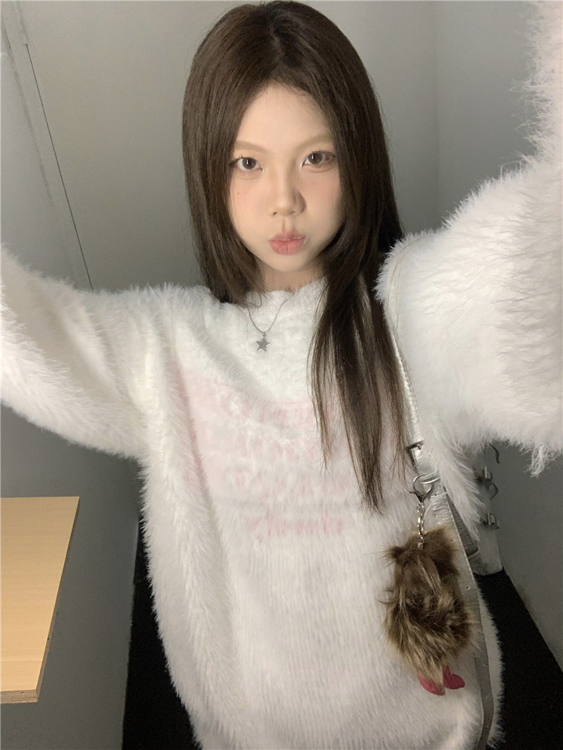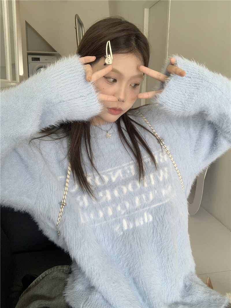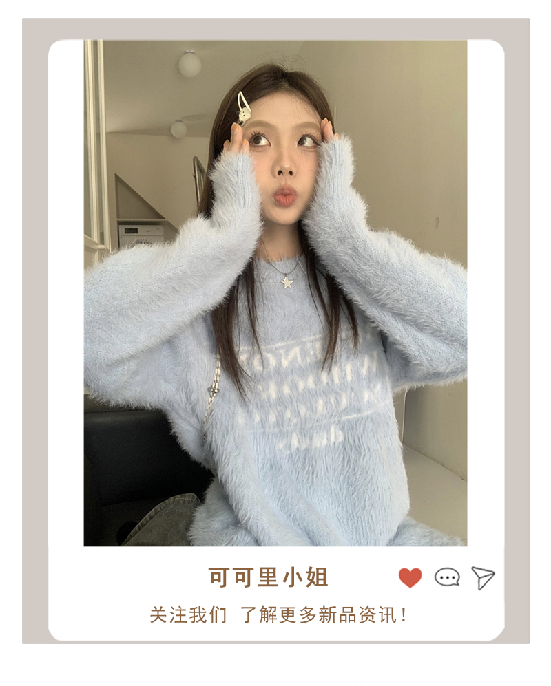 軟糯糯奶呼呼毛衣女秋冬2023新款仿貂絨加厚寬鬆字母長袖針織上衣
