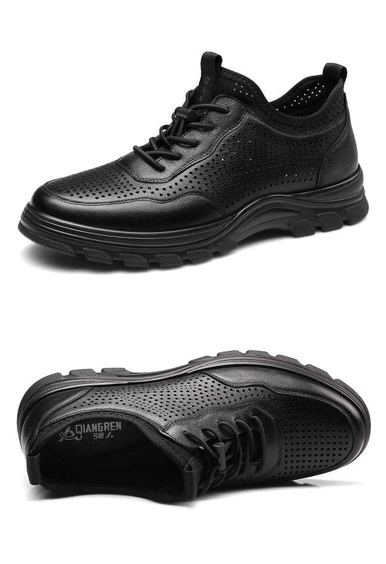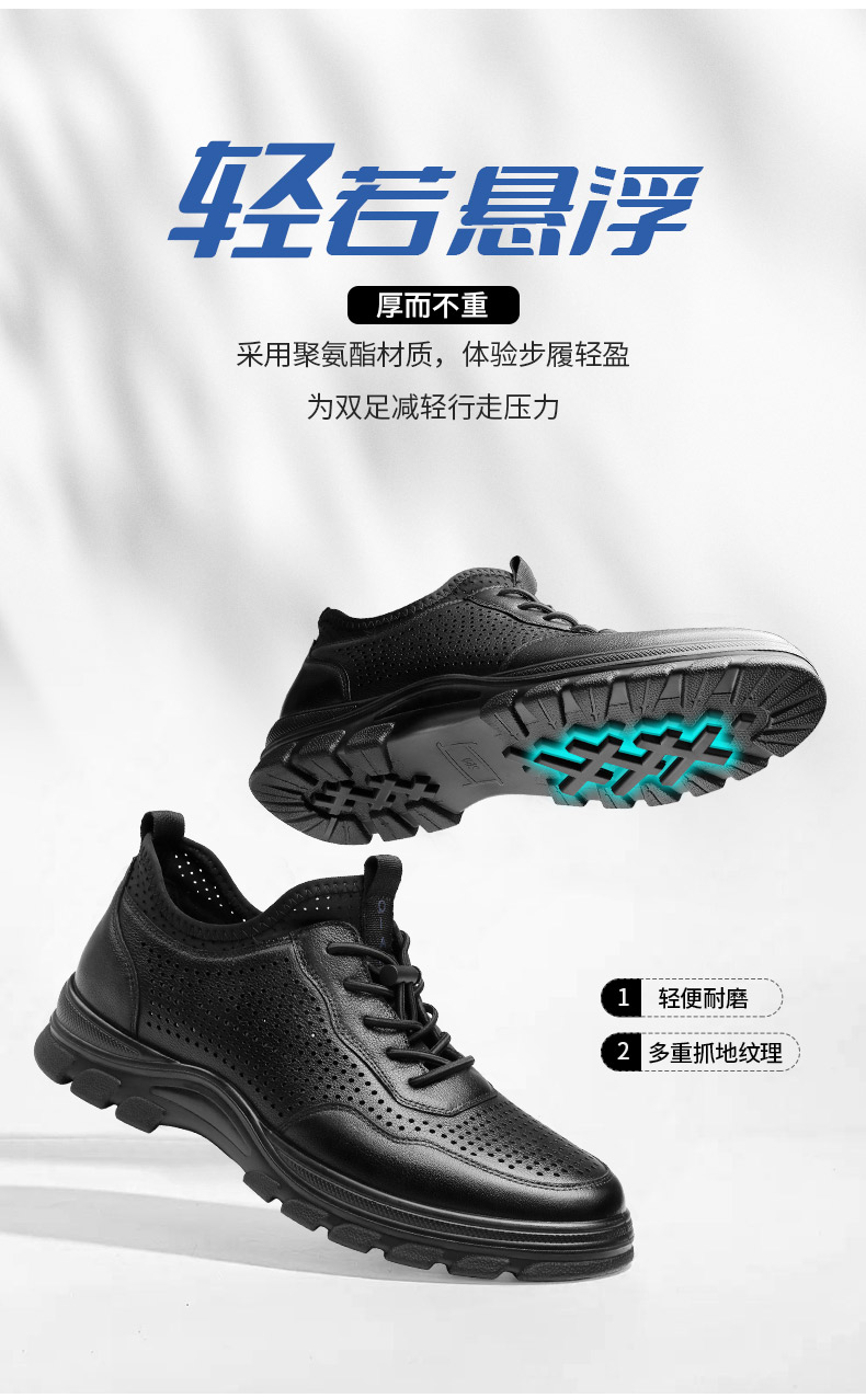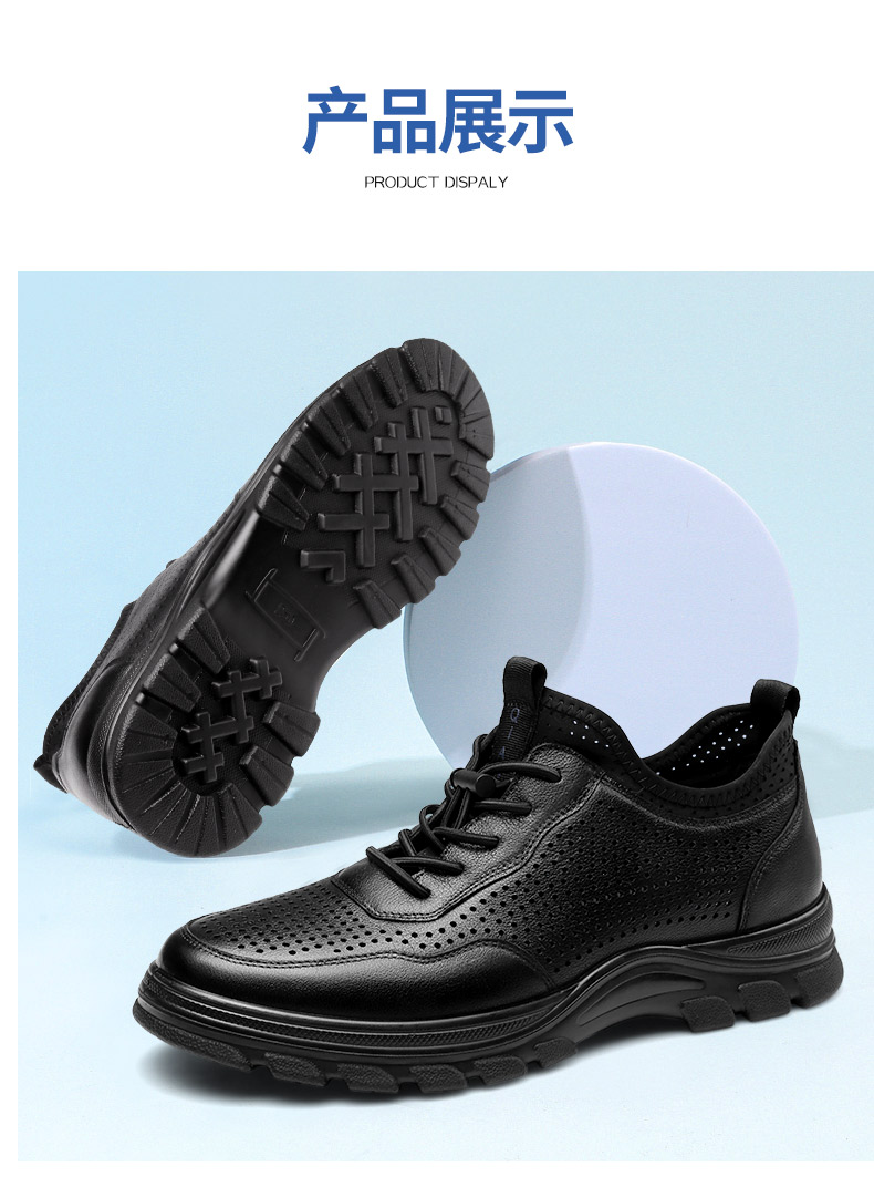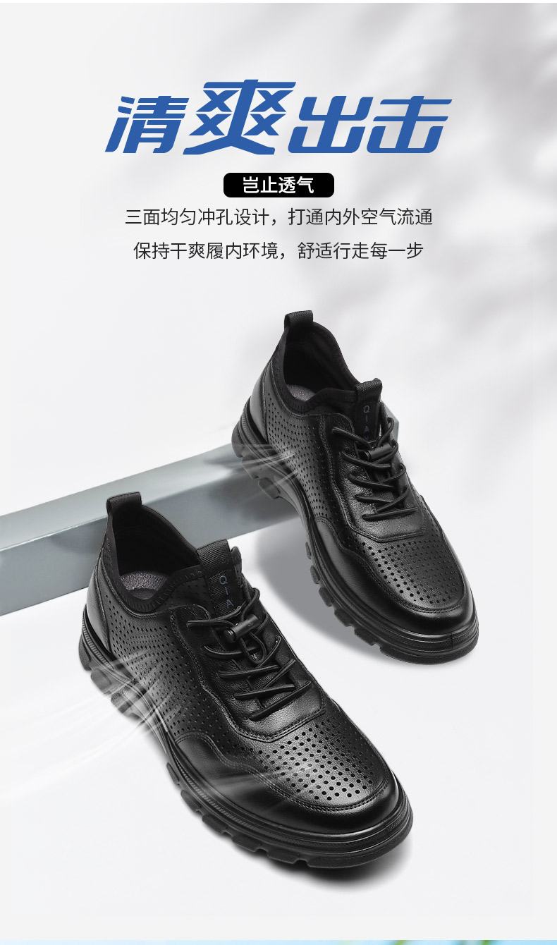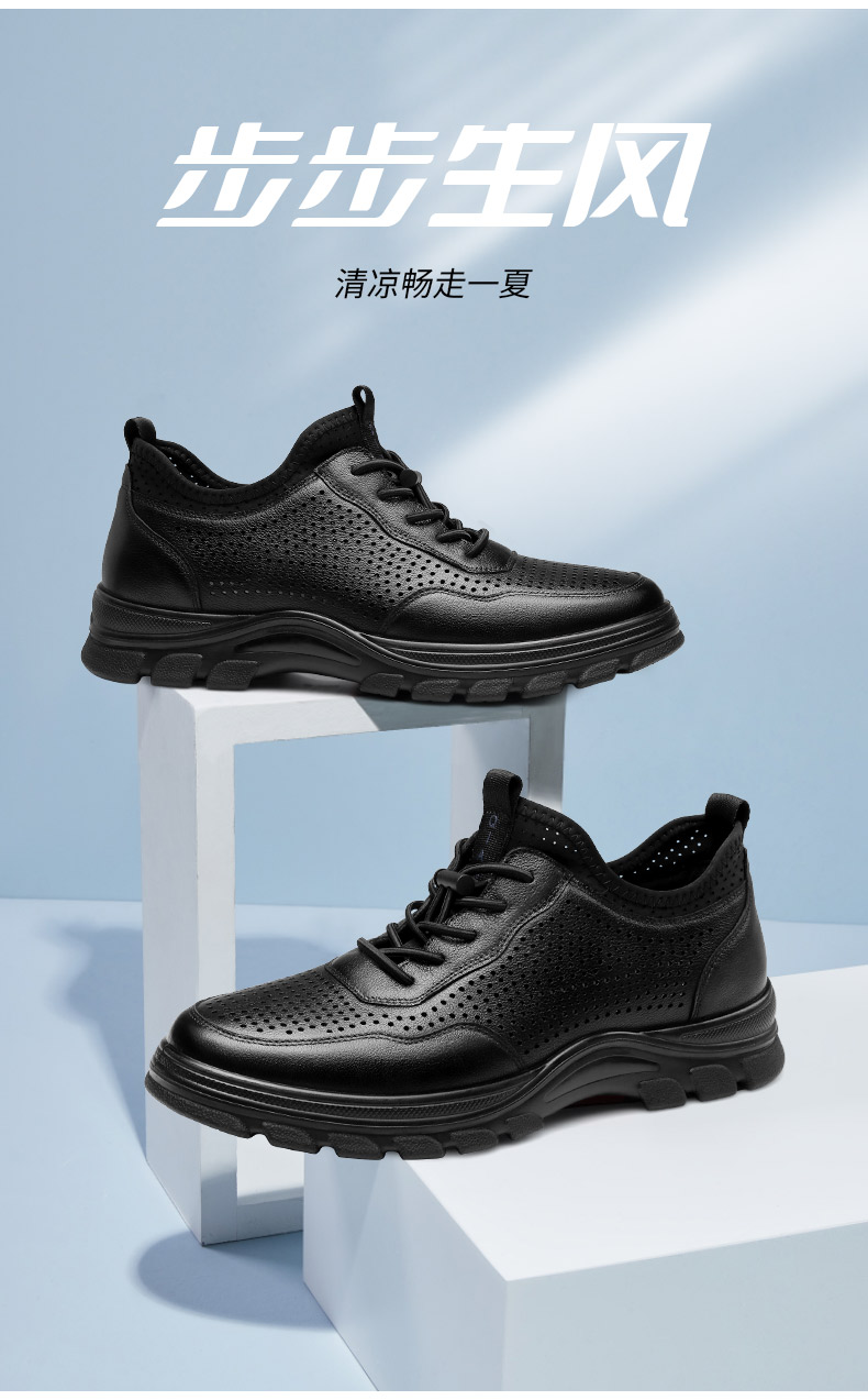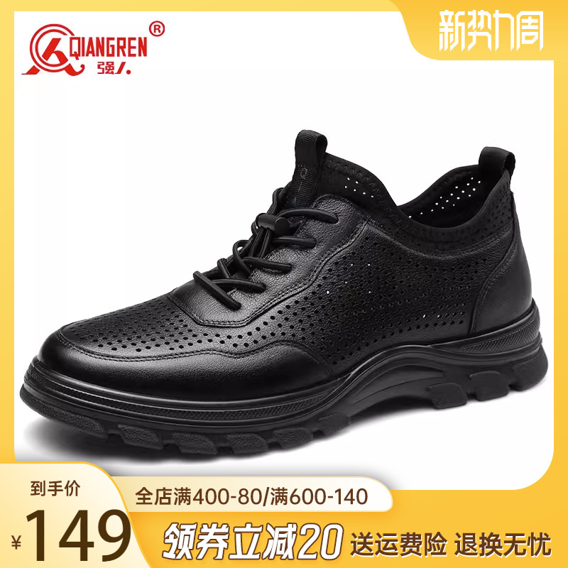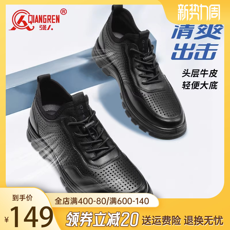 強人3515休閒皮鞋男夏季鏤空透氣涼皮鞋真牛皮運動鞋青年皮鞋黑色